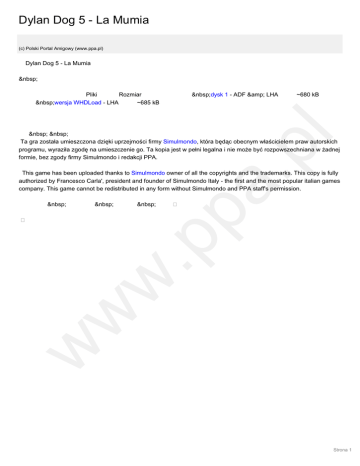 Dylan Dog 5 - La Mumia (c) Polski Portal Amigowy (www.ppa.pl) Dylan Dog 5 - La Mumia Pliki Rozmiar wersja WHDLoad - LHA ~685 kB dysk 1 - ADF & LHA ~680 kB .p l Ta gra została umieszczona dzięki uprzejmości firmy Simulmondo, która będąc obecnym właścicielem praw autorskich programu, wyraziła zgodę na umieszczenie go. Ta kopia jest w pełni legalna i nie może być rozpowszechniana w żadnej formie, bez zgody firmy Simulmondo i redakcji PPA. w w w .p pa This game has been uploaded thanks to Simulmondo owner of all the copyrights and the trademarks. This copy is fully authorized by Francesco Carla', president and founder of Simulmondo Italy - the first and the most popular italian games company. This game cannot be redistributed in any form without Simulmondo and PPA staff's permission. Strona 1