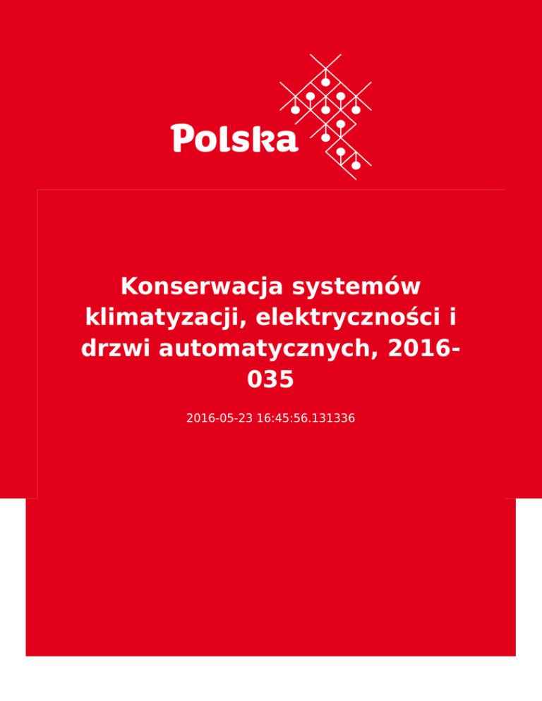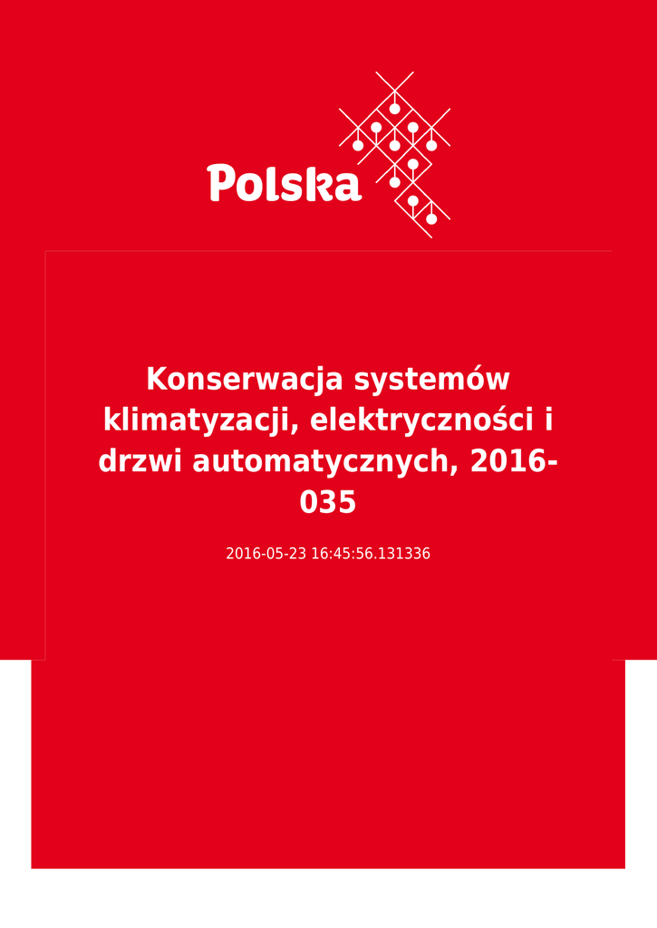 Konserwacja systemów klimatyzacji, elektryczności i drzwi automatycznych, 2016035 2016-05-23 16:45:56.131336 2 3 Ta oferta nie stanowi informacji handlowej Dane kontaktowe Presidencia de la Autoridad Portuaria de la Bahía de Algeciras 11207 Algeciras Avda. de la Hispanidad 2 Hiszpania Osoba kontaktowa Presidencia de la Autoridad Portuaria de la Bahía de Algeciras [email protected] Tel: contrataciondelestado.es Opis przedmiotu zamówienia Konserwacja systemów klimatyzacji, elektryczności i drzwi automatycznych, nr przetargu: 2016-035 Informacje uzupełniające https://www.boe.es/diario_boe/txt.php?id=BOE-B-2016-22017 CPV ● ● ● ● ● Roboty budowlane Instalowanie urządzeń klimatyzacji częściowej powietrza Usługi naprawcze i konserwacyjne Usługi w zakresie napraw i konserwacji instalacji budynkowych Usługi w zakresie napraw i konserwacji elektrycznych instalacji budynkowych 4 Forma przetargu Międzynarodowy Kraj Hiszpania Adres WWW www.boe.es/diario_boe/txt.php?id=BOE-B-2016-22017 Termin składania ofert 04.07.2016 Ważna od 23.05.2016 Branże Doradztwo/consulting/edukacja, Maszyny i urządzenia, Budownictwo, 5