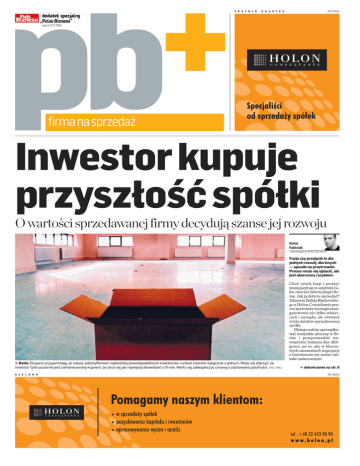 P A R T N E R PB-20551 D O D A T K U piątek 27 XI 2009 firma na sprzedaż Inwestor kupuje przyszłość spółki O wartości sprzedawanej firmy decydują szanse jej rozwoju Rafał Fabisiak [email protected] ☎ 022-333-99-32 Fuzja czy przejęcie to dla jednych rozwój, dla innych — sposób na przetrwanie. Proces może się opłacić, ale jest obarczony ryzykiem. Choć rynek fuzji i przejęć zmniejszył się w ostatnim roku, obecnie łatwiej kupić firmę. Jak ją dobrze sprzedać? Zdaniem Rafała Błędowskiego z Holon Consultants proces sprzedaży wymaga zaangażowania nie tylko właścicieli i zarządu, ale również wielu działów sprzedawanej spółki. Dlatego należy uporządkować wszystkie procesy w firmie i przeprowadzić wewnętrzne badania due dilligence, po to, aby w kluczowych momentach negocjacji z inwestorem nie zostać niemile zaskoczonym. Rada: Eksperci przypominają, że należy zidentyfikować najbardziej prawdopodobnych inwestorów i unikać rozmów wyłącznie z jednym. Może się zdarzyć, że inwestor tylko pozornie jest zainteresowany kupnem, bo chce się jak najwięcej dowiedzieć o firmie. Warto się zabezpieczyć umową o zachowaniu poufności. [FOT. ARC] R E K L A M A dokończenie na str. II PB-20551 II piątek 27 XI 2009 FIRMA NA SPRZEDAŻ Weryfikacja: Jednym z elementów udanej sprzedaży spółki jest sprawdzenie, czy jest dopasowana do profilu działalności i strategii rozwoju inwestora oraz do jego intencji i możliwości finansowych — tłumaczy Rafał Błędowski z Holon Consultants. [FOT. WM] dokończenie ze str. I — Jeśli firma nie ma doświadczenia wtego typu transakcjach, nieocenioną pomocą może okazać się konsultant. Często spółki próbują same przeprowadzić ten proces, co zazwyczaj rodzi wiele problemów i nie prowadzi do sukcesu —twierdzi Rafał Błędowski. Przed podjęciem decyzji o sprzedaży należy zadać sobie dwa pytania — komu firma ma być sprzedana i za jaką cenę. Firma kupująca z reguły chce wynegocjować jak najlepsze warunki przejęcia. Z kolei sprzedający nie ma zamiaru oddawać jej za grosze. Umowa poufności — Dlatego też najlepiej, by jeszcze przed rozpoczęciem procesu właściciele zweryfikowali swoje oczekiwania finansowe z niezależnym doradcą, który biorąc pod uwagę realia rynkowe, przeprowadzi niezależną wycenę — radzi Rafał Błędowski. Kiedy już wiemy czego możnasię spodziewać, ważne staje się profesjonalne przeprowadzenie całego procesu sprzedaży. Jego pierwszym elementem jest przygotowanie tzw. memorandum informacyjnego, zawierającego informacje natemat spółki, niezbędne inwestorowi dopodjęcia decyzji ojej zakupie. Wgłównej mierze owartości sprzedawanej spółki decydują jednak jej możliwości i szanse rozwoju. —Inwestor nie kupuje przeszłości ani teraźniejszości, tylko przyszłość firmy. Dlatego należy skupić się na niej — dodaje Rafał Błędowski. Wkolejnym etapie prac należy zidentyfikować najbardziej prawdopodobnych inwestorów i unikać rozmów wyłącznie z jednym. Może się zdarzyć, że inwestor tylko pozornie jest zainteresowany kupnem, bo chce się jak najwięcej dowiedzieć o firmie. Rafał Błędowski przypomina, że możnasię przedtym zabezpieczyć tzw. umową o zachowaniu poufności, która znacząco ogranicza wykorzystywanie poufnych danych przez firmy zzewnątrz. Bez podpisania tej umowy z inwestorem firma nie powinna przekazywać informacji, które nie są publicznie dostępne. Najważniejsi są ludzie Najistotniejszym elementem w transakcji fuzji, czy przejęcia jest jednak czynnik ludzki. Według Mika Kuczkiewicza, prezesa Hay Group, 70 proc. transakcji nie spełnia założonych celów ze względu na nieprawidłową integrację pracowników obu firm już po połączeniu lub przejęciu. — Szacuje się, że niewłaściwe zarządzanie ludźmi może obniżyć korzyści z transakcji o 6-13 proc. Z naszych badań wynika, że 60 proc. firm planuje dokonać pełnej integracji kultur organizacyjnych wciągu roku, ale tylko30 proc. udaje się osiągnąć ten cel, bo wwiększości przypadków proces ten nie powinien być krótszy niż rok —tłumaczy Edward Stanoch, dyrektor zarządzający w firmie Hewitt. Jeśli spółka nieprawidłowo zaplanowała integrację pracowników obu firm, to efekty mogą być fatalne. Najgorszym z możliwych scenariuszy jest odpływ kluczowych pracowników, co może doprowadzić dostrat wgranicach1,5 proc. wartości transakcji. Jednak zdaniem Toma Ruhana, głównego dyrektora ds. prawnych i akwizycji w Netii, różnice w kulturze organizacyjnej to także atut. Bo zetknięcie różnych kultur i sposobów działania jest twórcze i może wnieść do organizacji wiele inspiracji. Eksperci radzą: aby proces integracji przebiegł prawidłowo, można skorzystać z prostych rozwiązań. — Po transakcji warto mówić wprost najważniejszym dla nas pracownikom, że chcemy ich zatrzymać. Unikniemy wten sposób zbędnych spekulacji i niesnasek w zespole — mówi Mik Kuczkiewicz. Edward Stanoch dodaje, że dobrym sposobem na uniknięcie walki pracowników i zazębiania się ich kompetencji jest powołanie nowego szefa, który będzie mógł obiektywnie spojrzeć na sytuację. Rafał Fabisiak [email protected] ☎ 022-333-99-32 Firmy rodzinne powoli ewoluują W Polsce działa około 1,7 mln rodzinnych przedsiębiorstw Marcin Bołtryk [email protected] ☎ 022-333-99-20 Raczej nie czeka nas fala przemian firm rodzinnych w korporacje. Ale pojawią się w nich menedżerowie z zewnątrz. Badania prof. Hermanna Simona, autora książki „Tajemniczy mistrzowie XXI wieku”, dowodzą, że 66 proc. światowych liderów (zajmujących od 1 do 3 miejsca na swoich rynkach) o dochodach do 3 mln USD to firmy rodzinne. W Polsce działa około 1,7 mln takich podmiotów. Większość prowadzi działalność handlową lub usługową. Branża spożywcza, kosmetyczna, farmacja to obszary, w których może nastąpić konsolidacja, a