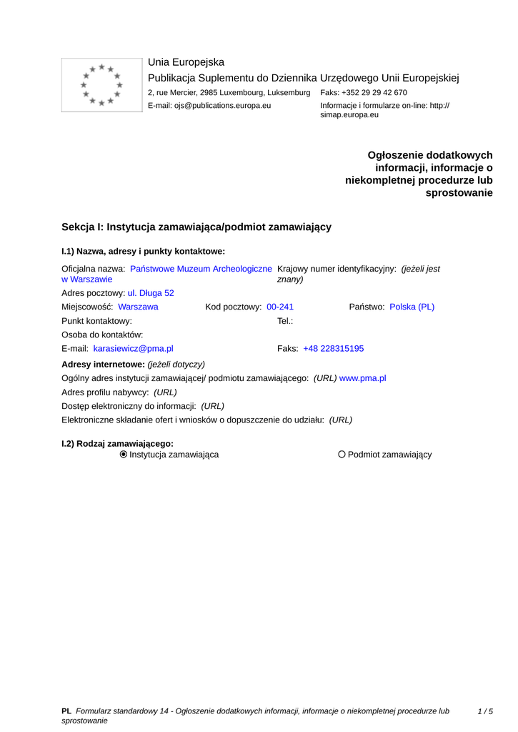 Unia Europejska Publikacja Suplementu do Dziennika Urzędowego Unii Europejskiej 2, rue Mercier, 2985 Luxembourg, Luksemburg Faks: +352 29 29 42 670 E-mail: [email protected] Informacje i formularze on-line: http:// simap.europa.eu Ogłoszenie dodatkowych informacji, informacje o niekompletnej procedurze lub sprostowanie Sekcja I: Instytucja zamawiająca/podmiot zamawiający I.1) Nazwa, adresy i punkty kontaktowe: Oficjalna nazwa: Państwowe Muzeum Archeologiczne Krajowy numer identyfikacyjny: (jeżeli jest w Warszawie znany) _____ Adres pocztowy: ul. Długa 52 Miejscowość: Warszawa Kod pocztowy: 00-241 Punkt kontaktowy: _____ Państwo: Polska (PL) Tel.: _____ Osoba do kontaktów: _____ E-mail: [email protected] Faks: +48 228315195 Adresy internetowe: (jeżeli dotyczy) Ogólny adres instytucji zamawiającej/ podmiotu zamawiającego: (URL) www.pma.pl Adres profilu nabywcy: (URL) _____ Dostęp elektroniczny do informacji: (URL) _____ Elektroniczne składanie ofert i wniosków o dopuszczenie do udziału: (URL) _____ I.2) Rodzaj zamawiającego: Instytucja zamawiająca Podmiot zamawiający PL Formularz standardowy 14 - Ogłoszenie dodatkowych informacji, informacje o niekompletnej procedurze lub sprostowanie 1/5 Sekcja II: Przedmiot zamówienia II.1.1) Nazwa nadana zamówieniu: Dostawa wyposażenia dla Pracowni konserwacji drewna archeologicznego w Rybnie II.1.2) Krótki opis zamówienia lub zakupu: (podano w pierwotnym ogłoszeniu) Dostawa wanien do przechowywania i konserwacji drewna z wyposażeniem i montażem oraz stołów roboczych z ociekaczem. 1. Wanna do konserwacji drewna (z płaszczem grzejnym) o wymiarach: długość 12 m, szerokość 1,2 m, wysokość 1,2 m. 2. Wanna do przechowywania drewna nieogrzewana o wymiarach: długość 10 m, szerokość 1,2 m, wysokość1,0 m. 3. Stół preparacyjny, blat kopertowy z ociekaczem umieszczonym centralnie. 4. Stół warsztatowy\, blat roboczy wykonany ze stali nierdzewnej. Szczegółowy opis przedmiotu zamówienia zostanie przekazany wraz ze Specyfikacją Istotnych WarunkówZamówienia wykonawcom zaproszonym do złożenia oferty. II.1.3) Wspólny Słownik Zamówień (CPV) Główny przedmiot Dodatkowe przedmioty Słownik główny 43810000 39151200 Słownik uzupełniający (jeżeli dotyczy) PL Formularz standardowy 14 - Ogłoszenie dodatkowych informacji, informacje o niekompletnej procedurze lub sprostowanie 2/5 Sekcja IV: Procedura IV.1)Rodzaj procedury (podano w pierwotnym ogłoszeniu) Otwarta Ograniczona Ograniczona przyspieszona Negocjacyjna Negocjacyjna przyspieszona Dialog konkurencyjny Negocjacyjna z uprzednim ogłoszeniem Negocjacyjna bez uprzedniego ogłoszenia Negocjacyjna z publikacją ogłoszenia o zamówieniu Negocjacyjna bez publikacji ogłoszenia o zamówieniu Udzielenie zamówienia bez uprzedniej publikacji ogłoszenia o zamówieniu w Dzienniku Urzędowym Unii Europejskiej IV.2)Informacje administracyjne IV.2.1)Numer referencyjny: (podano w pierwotnym ogłoszeniu) 2/PO/ZP/15 IV.2.2)Dane referencyjne ogłoszenia w przypadku ogłoszeń przesłanych drogą elektroniczną: Pierwotne ogłoszenie przesłane przez eNotices TED eSender Login: ENOTICES_bkarasiewicz Dane referencyjne ogłoszenia: 2015-056692 rok i numer dokumentu IV.2.3)Ogłoszenie, którego dotyczy niniejsza publikacja: Numer ogłoszenia w Dz.U.: 2015/S 085-151485 z dnia: 02/05/2015 (dd/mm/rrrr) IV.2.4)Data wysłania pierwotnego ogłoszenia: 28/04/2015 (dd/mm/rrrr) PL Formularz standardowy 14 - Ogłoszenie dodatkowych informacji, informacje o niekompletnej procedurze lub sprostowanie 3/5 Sekcja VI: Informacje uzupełniające VI.1) Ogłoszenie dotyczy: Procedury niepełnej Sprostowania Informacji dodatkowych VI.2) Informacje na temat niepełnej procedury udzielenia zamówienia: Postępowanie o udzielenie zamówienia zostało przerwane Postępowanie o udzielenie zamówienia uznano za nieskuteczne Zamówienia nie udzielono Zamówienie może być przedmiotem ponownej publikacji VI.3) Informacje do poprawienia lub dodania : VI.3.1) Zmiana oryginalnej informacji podanej przez instytucję zamawiającą Publikacja w witrynie TED niezgodna z oryginalną informacją, przekazaną przez instytucję zamawiającą Oba przypadki VI.3.2) W ogłoszeniu pierwotnym W odpowiedniej dokumentacji przetargowej (więcej informacji w odpowiedniej dokumentacji przetargowej) W obu przypadkach (więcej informacji w odpowiedniej dokumentacji przetargowej) VI.3.3) Tekst, który należy poprawić w pierwotnym ogłoszeniu Miejsce, w którym znajduje się Zamiast: Powinno być: zmieniany tekst: 1. O udzielenie niniejszego 1. O udzielenie niniejszego III.2.3) zamówienia ubiegać się mogą zamówienia ubiegać się mogą Wykonawcy, którzy wykażą, że Wykonawcy, którzy wykażą, że spełniają warunki dotyczące spełniają warunki dotyczące posiadania wiedzy i doświadczenia posiadania wiedzy i doświadczenia tj. wykażą, że w okresie ostatnich 3 tj. wykażą, że w okresie ostatnich 3 lat przed upływem terminu składania lat przed upływem terminu składania wniosków o dopuszczenie do udziału wniosków o dopuszczenie do udziału w postępowaniu, a jeżeli okres w postępowaniu, a jeżeli okres prowadzenia działalności jest krótszy prowadzenia działalności jest krótszy - w tym okresie, zrealizowali: - w tym okresie, zrealizowali: — co najmniej 1 zamówienie, a) co najmniej 1 zamówienie, którego którego przedmiotem była przedmiotem była dostawa wanny dostawa wanny nieogrzewanej do nieogrzewanej do przechowywania przechowywania drewna o wartości drewna o wartości nie mniejszej nie mniejszej niż 400 000 PLN niż 400 000 PLN netto, lub wanny netto, lub wanny ogrzewanej do ogrzewanej do konserwacji drewna konserwacji drewna o wartości nie o wartości nie mniejszej niż 200 000 mniejszej niż 200 000 PLN netto. PLN netto; lub b) co najmniej 2 zamówienia na dostawę mebli laboratoryjnych lub dygestoriów o wartości nie mniejszej niż 100 000 PLN łącznie. Miejsce, w którym zna