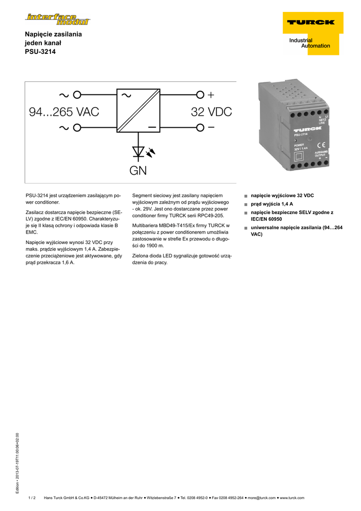 Napięcie zasilania jeden kanał PSU-3214 PSU-3214 jest urządzeniem zasilającym power conditioner. Zasilacz dostarcza napięcie bezpieczne (SELV) zgodne z IEC/EN 60950. Charakteryzuje się II klasą ochrony i odpowiada klasie B EMC. Multibariera MBD49-T415/Ex firmy TURCK w połączeniu z power conditionerem umożliwia zastosowanie w strefie Ex przewodu o długości do 1900 m. ■ napięcie wyjściowe 32 VDC ■ prąd wyjścia 1,4 A ■ ■ napięcie bezpieczne SELV zgodne z IEC/EN 60950 uniwersalne napięcie zasilania (94…264 VAC) Zielona dioda LED sygnalizuje gotowość urządzenia do pracy. Edition • 2013-07-19T11:00:06+02:00 Napięcie wyjściowe wynosi 32 VDC przy maks. prądzie wyjściowym 1,4 A. Zabezpieczenie przeciążeniowe jest aktywowane, gdy prąd przekracza 1,6 A. Segment sieciowy jest zasilany napięciem wyjściowym zależnym od prądu wyjściowego - ok. 29V. Jest ono dostarczane przez power conditioner firmy TURCK serii RPC49-205. 1/2 Hans Turck GmbH & Co.KG ñ D-45472 Mülheim an der Ruhr ñ Witzlebenstraße 7 ñ Tel. 0208 4952-0 ñ Fax 0208 4952-264 ñ [email protected] ñ www.turck.com Napięcie zasilania jeden kanał PSU-3214 Wymiary Typ Nr kat. PSU-3214 7545024 Napięcie zasilania Częstotliwość Pobór prądu Początkowy prąd rozruchowy 94…265 VAC 47…63 Hz 0,6 A przy 230 V AC / 1,1 A przy 120 V AC Separacja galwaniczna I t < 2,8 A s Obwód wejściowy do obwodu wyjściowego i zasilania dla 250 Veff; napięcie testowe 3 kVeff 2 2 Obwody wyjściowe Prąd wyjścia Napięcie wyjścia Tętnienie szczątkowe Short-circuit protection Sprawność Obniżanie wartości znamionowych ð 1400 mA 32 VDC (± 3 %) ð 50 mVss ð 1600mA 89 % 2,5 %/K (począwszy od +60°C) Wskazanie Gotowość do pracy element pozycjonujący 1 x zielona Połączenie elektryczne płaski terminal ze sprężynującymi płytkami zaciskowymi Przekrój zacisku 1 x 2,5 mm / 2 x 2,5 mm Stopień ochrony Temperatura pracy Materiał obudowy Kolor obudowy Wymiary Tryb połączenia IP20 -10…+70 °C Tworzywo sztuczne niebieskie 45x 72x 105 mm zatrzaskowy montaż na szynie DIN (DIN 60715) 2 Edition • 2013-07-19T11:00:06+02:00 2 Output curve 2/2 Hans Turck GmbH & Co.KG ñ D-45472 Mülheim an der Ruhr ñ Witzlebenstraße 7 ñ Tel. 0208 4952-0 ñ Fax 0208 4952-264 ñ [email protected] ñ www.turck.com