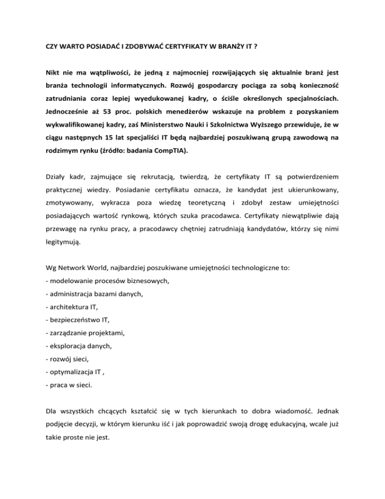 CZY WARTO POSIADAĆ I ZDOBYWAĆ CERTYFIKATY W BRANŻY IT ? Nikt nie ma wątpliwości, że jedną z najmocniej rozwijających się aktualnie branż jest branża technologii informatycznych. Rozwój gospodarczy pociąga za sobą konieczność zatrudniania coraz lepiej wyedukowanej kadry, o ściśle określonych specjalnościach. Jednocześnie aż 53 proc. polskich menedżerów wskazuje na problem z pozyskaniem wykwalifikowanej kadry, zaś Ministerstwo Nauki i Szkolnictwa Wyższego przewiduje, że w ciągu następnych 15 lat specjaliści IT będą najbardziej poszukiwaną grupą zawodową na rodzimym rynku (źródło: badania CompTIA). Działy kadr, zajmujące się rekrutacją, twierdzą, że certyfikaty IT są potwierdzeniem praktycznej wiedzy. Posiadanie certyfikatu oznacza, że kandydat jest ukierunkowany, zmotywowany, wykracza poza wiedzę teoretyczną i zdobył zestaw umiejętności posiadających wartość rynkową, których szuka pracodawca. Certyfikaty niewątpliwie dają przewagę na rynku pracy, a pracodawcy chętniej zatrudniają kandydatów, którzy się nimi legitymują. Wg Network World, najbardziej poszukiwane umiejętności technologiczne to: - modelowanie procesów biznesowych, - administracja bazami danych, - architektura IT, - bezpieczeństwo IT, - zarządzanie projektami, - eksploracja danych, - rozwój sieci, - optymalizacja IT , - praca w sieci. Dla wszystkich chcących kształcić się w tych kierunkach to dobra wiadomość. Jednak podjęcie decyzji, w którym kierunku iść i jak poprowadzić swoją drogę edukacyjną, wcale już takie proste nie jest. Rozmawiamy dziś na temat zasadności posiadania certyfikatów z dziedziny IT. Powyższy temat chcemy przedstawić zarówno od strony pracownika jak i pracodawcy. Naszymi rozmówcami są: -p. Tomasz Górecki – absolwent Politechniki Gdańskiej i SGH. Project Manager, Interim Manager w obszarze IT oraz Coach ICC. Poprzez pracę w zróżnicowanych kulturach organizacyjnych - m.in PKP, Bank, korporacje - zdobył zdolność do szybkiej adaptacji w nowych środowiskach i umiejętność sprawnej komunikacji zarówno w obszarze biznesu jak i IT. Swoje wieloletnie doświadczenie zbierał m.in na stanowiskach IT Managera, Dyrektora IT i Project Managera w firmie Antalis. Ma na swoim koncie zróżnicowane projekty - CRM, hurtownia danych, system ERP, zmiany organizacyjne. W 2007 roku założył firmę doradczą PMTG co pozwoliło na zdobycie doświadczeń po stronie dostawcy rozwiązań. W zakresie standardów zarządzania projektami posiada certyfikacje PMP(PMI) i Prince2 Practitioner. -p. Paweł Żurawski – network engineer w firmie Otos Origin, ukończył informatykę na Politechnice Gdańskiej. -p. Michał Żochowski - kierownik działu IT w firmie Targor-Truck Sp. z o.o. Administrator, programista, analityk. -p. Paweł Zdziarski – konsultant i trener pracujący w Centrum Technik Sieciowych. Instruktor z kilkunastoletnim doświadczeniem dostarczający szkolenia dotyczące tematyki m.in. bezpieczeństwa, wirtualizacji, standaryzacji. Posiadający tytuły techniczne i autoryzowanego trener takich firm i organizacji jak Microsoft, Mcafee, Comptia (specjalizacja Security+, Project+, Network+), Security Certified Program (SCP). Uczestnik wielu projektów informatycznych związanych z tematyką standaryzacji środowiska stacji roboczych i serwerowego, bezpieczeństwa, wirtualizacji oraz „cloud computingu”. Działy kadr, zajmujące się rekrutacją, twierdzą, że certyfikaty IT są potwierdzeniem praktycznej wiedzy. Osoby aplikujące na konkretne stanowiska dzięki certyfikatom pokazują iż chcą się cały czas rozwijać, a z drugiej strony mogą wylegitymować się kwalifikacjami zawodowymi, które już teraz uznawane są w wielu krajach. Co sadzicie Państwo o tym ? T.G. - W przypadku certyfikatów dotyczących zarządzania projektami należałoby przeanalizować temat przyglądając się konkretnym certyfikatom. Certyfikat Prince2 Foundation – potwierdza wiedzę jego posiadacza w zakresie konkretnej metodyki, certyfikat Prince2 Practitioner – potwierdza, że posiadacz zdał również egzamin sprawdzający jego umiejętność przełożenia treści metodyki na zastosowanie praktyczne. Do zdania obu egzaminów nie jest jednak formalnie wymagany staż praktyczny w zakresie realizacji projektów. Z kolei certyfikat PMP już na etapie składania aplikacji wymaga formalnego wykazania się stażem kilku tysięcy godzin przepracowanych w projektach a egzamin weryfikuje zarówno znajomość praktyk projektowych opisanych w PMBOK®Guide jak i szersze kompetencje w zakresie zarządzania. W tym przypadku możemy mówić, że certyfikat potwierdza w znacznym stopniu wiedzę, doświadczenie jak i chęć rozwoju i nauki osoby legitymującej się zdanym egzaminem. M.Ż. - Uważam że certyfikat jest potwierdzeniem tylko wiedzy teoretycznej z danej dziedziny i nie odzwierciedla w żaden sposób doświadczenia praktycznego. Zgadzam się natomiast, że posiadanie certyfikatu pokazuje, że osoba go posiadająca interesuje się tematem i chce się w danym kierunku rozwijać. P.Ż - Z certyfikatami, jest tak jak z wykształceniem, zaobserwować można w ostatnim czasie znaczną dewaluacje certyfikatów, związane jest to w znacznej mierze z wszechobecnością Internetu, jako swobodnego dostępu do wszelakich informacji w tym także tzw. Cert Dumpów. Tajemnicą poliszynela jest, iż w tej chwili można uzyskać certyfikat bez koniecznej wiedzy, pytania są na ogół ogólnodostępne i nie jest trudną kwestią uzyskać do nich dostęp. Dlatego każda firma stara się zweryfikować wiedzę i kwalifikacje, jakimi powinien się wykazać certyfikowany kandydat. Kwestią bez sporną jest natomiast, że certyfikat jest jedną z pierwszych rzeczy po za doświadczeniem branym przez działy HR podczas podejmowania decyzji o zaproszeniu kandydata na rozmowę, pod tym względem na pewno posiadanie certyfikacji jest korzystne dla osoby poszukują