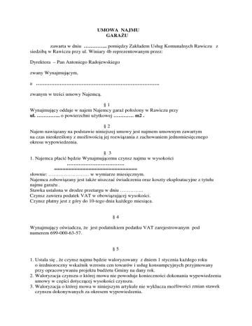 UMOWA NAJMU GARAŻU zawarta w dniu ………….. pomiędzy Zakładem Usług Komunalnych Rawiczu z siedzibą w Rawiczu przy ul. Winiary 4b reprezentowanym przez: Dyrektora – Pan Antoniego Radojewskiego zwany Wynajmującym, a ………………………………………………………………. zwanym w treści umowy Najemcą. §1 Wynajmujący oddaje w najem Najemcy garaż położony w Rawiczu przy ul. ………….. o powierzchni użytkowej ………… m2 . §2 Najem nawiązany na podstawie niniejszej umowy jest najmem umownym zawartym na czas nieokreślony z możliwością jej rozwiązania z zachowaniem jednomiesięcznego okresu wypowiedzenia. § 3 1. Najemca płacić będzie Wynajmującemu czynsz najmu w wysokości ……………………………. ============================= słownie: …………………… w wymiarze miesięcznym. Najemca zobowiązany jest także uiszczać świadczenia oraz koszty eksploatacyjne z tytułu najmu garażu . Stawka ustalona w drodze przetargu w dniu ………….. Czynsz zawiera podatek VAT w obowiązującej wysokości. Czynsz płatny jest z góry do 10-tego dnia każdego miesiąca. §4 Wynajmujący oświadcza, że jest podatnikiem podatku VAT zarejestrowanym pod numerem 699-000-63-57. §5 1. Ustala się , że czynsz najmu będzie waloryzowany z dniem 1 stycznia każdego roku o średnioroczny wskaźnik wzrostu cen towarów i usług konsumpcyjnych przyjmowany przy opracowywaniu projektu budżetu Gminy na dany rok. 2. Waloryzacja czynszu o której mowa nie powoduje konieczności dokonania wypowiedzenia umowy w części dotyczącej wysokości czynszu. 3. Waloryzacja o której mowa w niniejszym artykule nie wyklucza możliwości zmian stawek czynszu dokonywanych za okresem wypowiedzenia. -2§6 1. Najemca obowiązany jest korzystać z przedmiotu najmu zgodnie z jego przeznaczeniem oraz dokonywać jego konserwacji i remontów bieżących. 2. Najemca nie ma prawa oddawania przedmiotu najmu w podnajem lub do bezpłatnego korzystania osobom trzecim. §7 Strony zgodnie ustalają, że po zakończeniu najmu Wynajmujący nie będzie zwracał kosztów i nakładów poniesionych przez Najemcę na wprowadzenie ulepszeń w lokalu. §8 1. Wynajmujący zastrzega sobie możliwość rozwiązania umowy najmu bez zachowania okresu wypowiedzenia jeżeli Najemca: 1/ zalega z czynszem przez co najmniej dwa pełne okresy płatności, 2/ dopuszcza się naruszenia innych istotnych postanowień umowy, 3/ używa przedmiotu umowy niezgodnie z przeznaczeniem. 2. W razie zaistnienia okoliczności, o których mowa w ust. 1 Najemca obowiązany jest opuścić i opróżnić przedmiot najmu w terminie wskazanym przez Wynajmującego. §9 W sprawach nieuregulowanych niniejszą umową mają zastosowanie przepisy kodeksu cywilnego. § 10 Spory mogące wyniknąć na tle niniejszej umowy rozstrzyga Sąd Rejonowy w Rawiczu. § 11 Umowa została sporządzona w dwóch jednobrzmiących egzemplarzach po 1 dla każdej ze stron. WYNAJMUJĄCY NAJEMCA .................................... .......................................