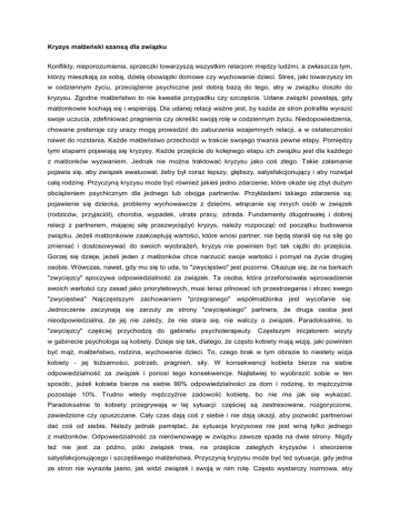 Kryzys małżeński szansą dla związku Konflikty, nieporozumienia, sprzeczki towarzyszą wszystkim relacjom między ludźmi, a zwłaszcza tym, którzy mieszkają za sobą, dzielą obowiązki domowe czy wychowanie dzieci. Stres, jaki towarzyszy im w codziennym życiu, przeciążenie psychiczne jest dobrą bazą do tego, aby w związku doszło do kryzysu. Zgodne małżeństwo to nie kwestia przypadku czy szczęścia. Udane związki powstają, gdy małżonkowie kochają się i wspierają. Dla udanej relacji ważne jest, by każda ze stron potrafiła wyrazić swoje uczucia, zdefiniować pragnienia czy określić swoją rolę w codziennym życiu. Niedopowiedzenia, chowane pretensje czy urazy mogą prowadzić do zaburzenia wzajemnych relacji, a w ostateczności nawet do rozstania. Każde małżeństwo przechodzi w trakcie swojego trwania pewne etapy. Pomiędzy tymi etapami pojawiają się kryzysy. Każde przejście do kolejnego etapu ich związku jest dla każdego z małżonków wyzwaniem. Jednak nie można traktować kryzysu jako coś złego. Takie załamanie pojawia się, aby związek ewaluował, żeby był coraz lepszy, głębszy, satysfakcjonujący i aby rozwijał całą rodzinę. Przyczyną kryzysu może być również jakieś jedno zdarzenie, które okaże się zbyt dużym obciążeniem psychicznym dla jednego lub obojga partnerów. Przykładami takiego zdarzenia są: pojawienie się dziecka, problemy wychowawcze z dziećmi, wtrącanie się innych osób w związek (rodziców, przyjaciół), choroba, wypadek, utrata pracy, zdrada. Fundamenty długotrwałej i dobrej relacji z partnerem, mającej siłę przezwyciężyć kryzys, należy rozpocząć od początku budowania związku. Jeżeli małżonkowie zaakceptują wartości, które wnosi partner, nie będą starali się na siłę go zmieniać i dostosowywać do swoich wyobrażeń, kryzys nie powinien być tak ciężki do przejścia. Gorzej się dzieje, jeżeli jeden z małżonków chce narzucić swoje wartości i pomysł na życie drugiej osobie. Wówczas, nawet, gdy mu się to uda, to "zwycięstwo" jest pozorne. Okazuje się, że na barkach "zwycięzcy" spoczywa odpowiedzialność za związek. Ta osoba, która przeforsowała wprowadzenie swoich wartości czy zasad jako priorytetowych, musi teraz pilnować ich przestrzegania i strzec swego "zwycięstwa" Najczęstszym zachowaniem "przegranego" współmałżonka jest wycofanie się. Jednoczenie zaczynają się zarzuty ze strony "zwycięskiego" partnera, że druga osoba jest nieodpowiedzialna, że jej nie zależy, że nie stara się, nie walczy o związek. Paradoksalnie, to "zwycięzcy" częściej przychodzą do gabinetu psychoterapeuty. Częstszym inicjatorem wizyty w gabinecie psychologa są kobiety. Dzieje się tak, dlatego, że często kobiety mają wizję, jaki powinien być mąż, małżeństwo, rodzina, wychowanie dzieci. To, czego brak w tym obrazie to niestety wizja kobiety - jej tożsamości, potrzeb, pragnień, siły. W konsekwencji kobieta bierze na siebie odpowiedzialność za związek i ponosi tego konsekwencje. Najłatwiej to wyobrazić sobie w ten sposób:, jeżeli kobieta bierze na siebie 90% odpowiedzialności za dom i rodzinę, to mężczyźnie pozostaje 10%. Trudno wtedy mężczyźnie zadowolić kobietę, bo nie ma jak się wykazać. Paradoksalnie to kobiety przegrywają w tej sytuacji: częściej są zestresowane, rozgoryczone, zawiedzione czy opuszczane. Cały czas dają coś z siebie i nie dają okazji, aby pozwolić partnerowi dać coś od siebie. Należy jednak pamiętać, że sytuacja kryzysowa nie jest winą tylko jednego z małżonków. Odpowiedzialność za nierównowagę w związku zawsze spada na dwie strony. Nigdy też nie jest za późno, póki związek trwa, na przejście zaległych kryzysów i stworzenie satysfakcjonującego i szczęśliwego małżeństwa. Przyczyną kryzysu może być też sytuacja, gdy jedna ze stron nie wyraziła jasno, jak widzi związek i swoją w nim rolę. Często wystarczy rozmowa, aby okazało się, że tak naprawdę małżonkowie mają wiele wspólnych wartości, tylko nie potrafili ich w jasny sposób sformułować. Najważniejsze jest, aby zmierzyć się z kryzysem - wzajemne oskarżanie się, czy udawanie, że kryzysu nie ma to krok w tył. Małżonkowie zamiast pogłębiać związek oddalają się od siebie lub zaczynają ze sobą walczyć. Bardzo często kryzys małżeński odbija się na dzieciach. Właśnie często dzięki dzieciom rodzina trafia do terapeuty. Najczęściej przyczyną wizyty są zaburzenia somatyczne i problemy z zachowaniem. Dzieci z miłości do swoich rodziców i ze strachu o nich często chorują, aby dorośli skupili na nich swoją uwagę i zapomnieli o kłopotach czy walce między sobą. Również dorośli miewają różne objawy somatyczne: przewlekłe bóle głowy, kłopoty ze snem czy nawet z sercem. Opieka nad chorym dzieckiem ma zbliżyć małżonków do siebie, ale nie rozwiązuje problemów, które wywołały chorobę dziecka. Ludzie przychodzą do terapeuty, kiedy jedno z małżonków, czasem oboje, widzi jakiś problem. Często dzieje się to w momencie, kiedy partner chce odejść a druga osoba koniecznie chce go zatrzymać. Najczęściej do takich skrajnych sytuacji dochodzi w związkach, gdzie zostały przeforsowane wartości jednego z małżonków. Druga osoba nie mogąc "przebić się" w małżeństwie oddaliła się. Terapia małżeńska nie spowoduje, że partner stanie się taki, jakim chcielibyśmy, żeby się stał. Psycholog tylko pomaga dojrzeć pewne rzeczy, a małżeństwo musi samo znaleźć najlepsze dla nich rozwiązania. Nasze role w małżeństwie zależą od nas. Nigdy nie jest tak, że kryzys powoduje tylko jedna osoba, a druga jest bez winy. Przyczyn powstawania kryzysu w związku jest wiele, jak również może być wiele możliwości rozwiązania tego kryzysu. Najważniejsze, aby było one skuteczne, a do tego potrzeba zaangażowania obojga partnerów. mgr Małgorzata 