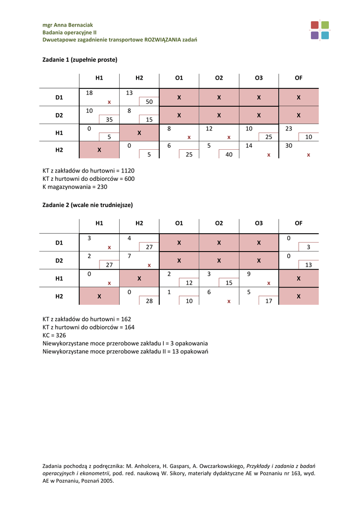 mgr Anna Bernaciak Badania operacyjne II Dwuetapowe zagadnienie transportowe ROZWIĄZANIA zadań Zadanie 1 (zupełnie proste) H1 D1 D2 H1 H2 18 13 x 10 50 8 35 15 0 H2 O3 OF X X X X X X X X 12 10 x 0 X O2 8 X 5 O1 6 5 5 23 x 25 14 25 10 30 x 40 x KT z zakładów do hurtowni = 1120 KT z hurtowni do odbiorców = 600 K magazynowania = 230 Zadanie 2 (wcale nie trudniejsze) H1 D1 D2 H1 H2 H2 3 4 x 2 27 7 x 27 0 X O2 O3 X X X X X X 2 X x O1 3 12 0 1 28 0 3 0 13 9 x 15 6 10 OF 5 x 17 X X KT z zakładów do hurtowni = 162 KT z hurtowni do odbiorców = 164 KC = 326 Niewykorzystane moce przerobowe zakładu I = 3 opakowania Niewykorzystane moce przerobowe zakładu II = 13 opakowań Zadania pochodzą z podręcznika: M. Anholcera, H. Gaspars, A. Owczarkowskiego, Przykłady i zadania z badań operacyjnych i ekonometrii, pod. red. naukową W. Sikory, materiały dydaktyczne AE w Poznaniu nr 163, wyd. AE w Poznaniu, Poznań 2005.