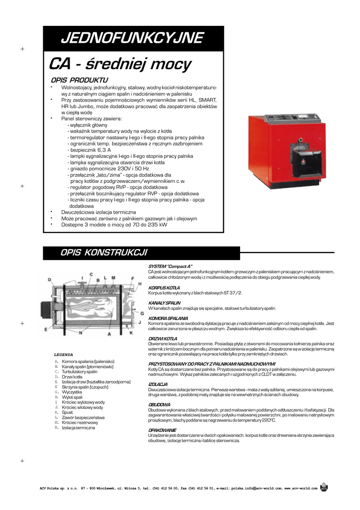 JEDNOFUNKCYJNE CA - redniej mocy OPIS PRODUKTU · Wolnostoj¹cy, jednofunkcyjny, stalowy, wodny kocio³ niskotemperaturowy z naturalnym ci¹giem spalin i nadcinieniem w palenisku Przy zastosowaniu pojemnociowych wymienników serii HL, SMART, HR lub Jumbo, mo¿e dodatkowo pracowaæ dla zaopatrzenia obiektów w ciep³¹ wodê Panel sterowniczy zawiera: - wy³¹cznik g³ówny - wskanik temperatury wody na wylocie z kot³a - termoregulator nastawny I-ego i II-ego stopnia pracy palnika - ogranicznik temp. bezpieczeñstwa z rêcznym zazbrojeniem - bezpiecznik 6,3 A - lampki sygnalizacyjne I-ego i II-ego stopnia pracy palnika - lampka sygnalizacyjna otwarcia drzwi kot³a - gniazdo pomocnicze 230V i 50 Hz - prze³¹cznik lato/zima - opcja dodatkowa dla pracy kot³ów z podgrzewaczem/wymiennikiem c.w. - regulator pogodowy RVP - opcja dodatkowa - prze³¹cznik bocznikuj¹cy regulator RVP - opcja dodatkowa - liczniki czasu pracy I-ego i II-ego stopnia pracy palnika - opcja dodatkowa Dwuczêciowa izolacja termiczna Mo¿e pracowaæ zarówno z palnikiem gazowym jak i olejowym Dostêpne 3 modele o mocy od 70 do 235 kW · · · · · OPIS KONSTRUKCJI SYSTEM Compact A CA jest wolnostoj¹cym jednofunkcyjnym kot³em grzewczym z paleniskiem pracuj¹cym z nadcinieniem, ca³kowicie ch³odzonym wod¹ i z mo¿liwoci¹ pod³¹czenia do obiegu podgrzewania ciep³ej wody. KORPUS KOT£A Korpus kot³a wykonany z blach stalowych ST 37/2. KANA£Y SPALIN W kana³ach spalin znajduj¹ siê specjalne, stalowe turbulizatory spalin. KOMORA SPALANIA Komora spalania ze swobodn¹ dylatacj¹ pracuje z nadcinieniem zale¿nym od mocy cieplnej kot³a. Jest ca³kowicie zanurzona w p³aszczu wodnym. Zwiêksza to efektywnoæ odbioru ciep³a od spalin. LEGENDA A. B. C. D. E. F . G. H. I . J. K. L. M. N. Komora spalania (palenisko) Kana³y spalin (p³omieniówki) Turbulizatory spalin Drzwi kot³a Izolacja drzwi (kszta³tka ¿aroodporna) Skrzynia spalin (czopuch) Wyczystka Wylot spali Króciec wylotowy wody Króciec wlotowy wody Spust Zawór bezpieczeñstwa Króciec rezerwowy Izolacja termiczna DRZWI KOT£A Otwierane lewo lub prawostronnie. Posiadaj¹ p³ytê z otworami do mocowania ko³nierza palnika oraz wziernik z króæcem bocznym dla pomiaru nadcinienia w palenisku. Zaopatrzone s¹ w izolacjê termiczn¹ oraz ogranicznik pozwalaj¹cy na pracê kot³a tylko przy zamkniêtych drzwiach. PRZYSTOSOWANY DO PRACY Z PALNIKAMI NADMUCHOWYMI Kot³y CA s¹ dostarczane bez palnika. Przystosowane s¹ do pracy z palnikami olejowymi lub gazowymi nadmuchowymi. Wykaz palników zalecanych i uzgodnionych z CLDT w za³¹czeniu. IZOLACJA Dwuczêciowa izolacja termiczna. Pierwsza warstwa - mata z waty szklanej, umieszczona na korpusie, druga warstwa, z podobnej maty znajduje siê na wewnêtrznych cianach obudowy. OBUDOWA Obudowa wykonana z blach stalowych, przed malowaniem poddanych odt³uszczeniu i fosfatyzacji. Dla zagwarantowania w³aciwej twardoci i po³ysku malowanej powierzchni, po malowaniu natryskowym proszkowym, blachy poddane s¹ nagrzewaniu do temperatury 2200C. OPAKOWANIE Urz¹dzenie jest dostarczane w dwóch opakowaniach: korpus kot³a oraz drewniana skrzynia zawieraj¹ca obudowê, izolacjê termiczn¹ i tablicê sterownicz¹. ACV Polska sp. z o.o. 87 - 800 W³oc³awek, ul. Witosa 3, tel. (54) 412 56 00, fax (54) 412 56 01, e-mail: [email protected], www.acv-world.com ZASADA PRACY ZASADA PRACY Korpus kot³a stanowi poziomy cylindryczny walec, wewn¹trz którego znajduje siê komora spalania. Przestrzeñ pomiêdzy zewnêtrzn¹ ciank¹ korpusu a wewnêtrzn¹ (komor¹ spalania) stanowi p³aszcz wodny kot³a. Kana³y spalin (p³omieniówki) o liczbie zale¿nej od mocy kot³a s¹ rozmieszczone obwodowo pomiêdzy zewnêtrzn¹ a wewnêtrzn¹ ciank¹ korpusu. Spaliny z komory spalania przep³ywaj¹ przez komorê nawrotn¹ do kana³ów spalin wyposa¿onych w wyjmowalne turbulizatory rubowe, które usprawniaj¹ wymianê ciep³a miêdzy spalinami a wod¹ kot³ow¹. Spaliny z p³omieniówek s¹ odprowadzane do komina ze skrzyni spalin (czopucha). Komora spalania z dylatacj¹. Kocio³ przystosowany do wspó³pracy z palnikiem dwustopniowym. Uzupe³nienie wody w instalacji (w kotle) mo¿e siê odbywaæ tylko wod¹ uzdatnion¹. Woda w kotle musi spe³niaæ parametry: tlen wolny < 0,5 ppm, pH = 7 do 8, twardoæ poni¿ej 100f (1 mval/dcm3=2,80n=50f) PANEL STEROWNICZY PANEL STEROWNICZY Panel sterowniczy zawiera: A . wskanik temperatury wody na wylocie z kot³a B. termoregulator nastawny I-ego stopnia pracy palnika C. termoregulator nastawny II-ego stopnia pracy palnika D. ogranicznik temp. bezpieczeñstwa z rêcznym zazbrojeniem F. bezpiecznik 6,3 A G. wy³¹cznik g³ówny H. lampka sygnalizacyjna I-ego stopnia pracy palnika I. lampka sygnalizacyjna II-ego stopnia pracy palnika J. licznik czasu pracy I i II stopnia pracy palnika opcja dodatkowa K. lampka sygnalizacyjna otwarcia drzwi kot³a L. gniazdo 230V M . prze³¹cznik lato/zima N. regulator temperatury RVP 200 (opcja dodatkowa) P. prze³¹cznik bocznikuj¹cy regulator RVP (opcja dodatkowa) POD£¥CZENIE DO KOMINA Pod³¹czenie musi byæ zgodne z instrukcj¹ i przepisami krajowymi. UWAGA: Dla umo¿liwienia czyszczenia czopucha i demonta¿u skrzyni spalin, pod³¹czenie do komina musi byæ ³atwo demontowalne. Zalecane rednice blaszanych kana³ów dymowych Wyszczególnienie rednica kana³u dymowego dla wysokoci komina (od podstawy kot³a): H= 5m H = 10 m H = 15 m H = 20 m Minimalne zapotrzebowanie powietrza Æ mm Æ mm Æ mm Æ mm m3/h CA 100 CA 150 CA 200 180 150 140 130 95 210 180 160 155 133 250 220 210 200 224 ACV Polska sp. z o.o. 87 - 800 W³oc³awek, ul. Witosa 3, tel. (54) 412 56 00, fax (54) 412 56 01, e-mail: [email protected], www.acv-world.com INSTALACJA ELEKTRYCZNA Compact A jest przystosowany do pracy przy napiêciu pr¹du 230 V i 50 Hz. INSTALACJA POWINNA BYÆ ZGODNA Z PRZEPISAMI OBOWI¥ZUJ¥CYMI W KRAJU R N O T U Kocio³ z regulatorem pokojowym REV 12 lub REV 32 z zaworem trójdro¿nym z s