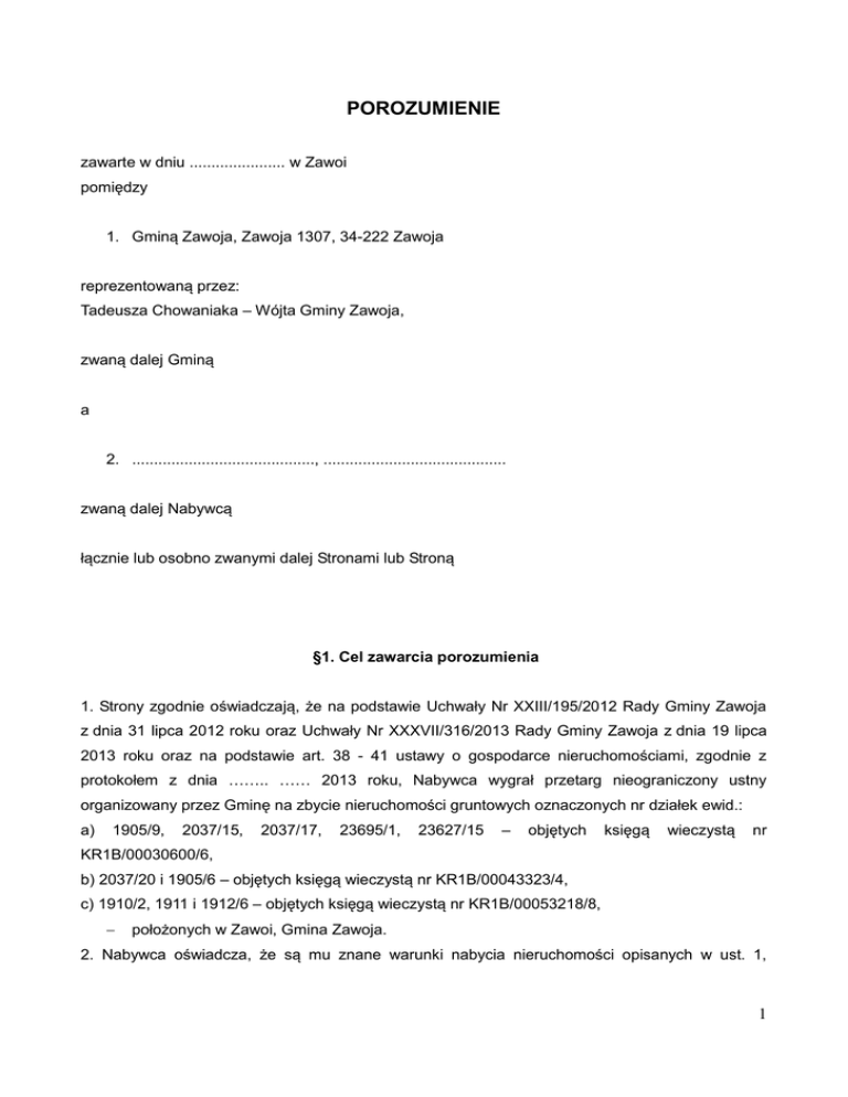 POROZUMIENIE zawarte w dniu ...................... w Zawoi pomiędzy 1. Gminą Zawoja, Zawoja 1307, 34-222 Zawoja reprezentowaną przez: Tadeusza Chowaniaka – Wójta Gminy Zawoja, zwaną dalej Gminą a 2. .........................................., .......................................... zwaną dalej Nabywcą łącznie lub osobno zwanymi dalej Stronami lub Stroną §1. Cel zawarcia porozumienia 1. Strony zgodnie oświadczają, że na podstawie Uchwały Nr XXIII/195/2012 Rady Gminy Zawoja z dnia 31 lipca 2012 roku oraz Uchwały Nr XXXVII/316/2013 Rady Gminy Zawoja z dnia 19 lipca 2013 roku oraz na podstawie art. 38 - 41 ustawy o gospodarce nieruchomościami, zgodnie z protokołem z dnia …….. …… 2013 roku, Nabywca wygrał przetarg nieograniczony ustny organizowany przez Gminę na zbycie nieruchomości gruntowych oznaczonych nr działek ewid.: a) 1905/9, 2037/15, 2037/17, 23695/1, 23627/15 – objętych księgą wieczystą nr KR1B/00030600/6, b) 2037/20 i 1905/6 – objętych księgą wieczystą nr KR1B/00043323/4, c) 1910/2, 1911 i 1912/6 – objętych księgą wieczystą nr KR1B/00053218/8, położonych w Zawoi, Gmina Zawoja. 2. Nabywca oświadcza, że są mu znane warunki nabycia nieruchomości opisanych w ust. 1, 1 określone przez Gminę w wykazie, sporządzonym zgodnie z art. 35 Ustawy o gospodarce nieruchomościami oraz w ogłoszeniu o sprzedaży nieruchomości. 3. Strony zawierają niniejsze porozumienie w celu ustalenia zasad zagospodarowania przez Nabywcę nieruchomości opisanych w ust. 1. § 2. Zobowiązania Nabywcy 1. Nabywca oświadcza, że zapoznał się z Koncepcją architektoniczno – urbanistyczną zagospodarowania i zabudowy terenu w Zawoi – Centrum, sporządzoną w grudniu 2011 roku przez mgr inż. arch. Urszulę Mazur (zwaną dalej „Koncepcją”), w której opisano zagospodarowanie istniejącego placu targowego wraz z koncepcją hali targowej, zagospodarowanie placu pomiędzy drogą wojewódzką, a parkingiem przed budynkiem poczty oraz opracowanie koncepcji zespołu pawilonów handlowo-usługowych pomiędzy tymi placami. Koncepcja, o której mowa powyżej stanowi Załącznik do niniejszej umowy, będący jej integralną częścią. 2. Nabywca zobowiązuje się, że nabyte od Gminy nieruchomości, o których mowa w § 1 ust. 1 Porozumienia zostaną przez niego w całości zagospodarowane z uwzględnieniem sposobu wskazanego w Koncepcji, z zastrzeżeniem ust. 4. Nabywca zobowiązuje się w szczególności do: a) wybudowania na nabytych nieruchomościach: - budynku hali targowej - pięciu pawilonów handlowo usługowych b) zagospodarowania placu przed istniejącym budynkiem poczty poprzez budowę placu rekreacyjno – wypoczynkowego, w tym pieszych ciągów komunikacyjnych, utwardzonego placu z altaną drewnianą, zadaszonych ławek oraz fontanny z zielenią ozdobną 3. Nabywca zobowiązuje się, że wybuduje na nabytych nieruchomościach w sposób zgodny z Koncepcją w następujących terminach: a) budowa budynku hali targowej - do trzech lat od dnia podpisania umowy sprzedaży nieruchomości, b) budowa pięciu pawilonów handlowo – usługowych - do pięciu lat od dnia podpisania umowy sprzedaży nieruchomości, c) pozostałe zagospodarowanie, w tym wskazane w ust. 2 lit. b) – w terminie do dwóch lat od dnia podpisania umowy sprzedaży nieruchomości. 4. Strony postanawiają, że zgodnie z Uchwałą Nr XXXVII/316/2013 Rady Gminy Zawoja z dnia 19 lipca 2013 roku, Nabywca ma możliwość dokonania zmiany Koncepcji wyłącznie w zakresie zmiany układu funkcjonalno-użytkowego pomieszczeń wszystkich budynków stanowiących element Koncepcji.. 2 5. Nabywca zobowiązuje się, że wybudowany budynek hali targowej oraz pawilony handlowo – usługowe, o których mowa w ust. 2 będą przez niego użytkowane w sposób wskazany w Koncepcji, z zastrzeżeniem ust. 4. Budynek i hala mogą być użytkowane w inny sposób, pod warunkiem uzyskania uprzedniej pisemnej zgody Gminy. 6. Nabywca zobowiązuje się, że po wykonaniu zagospodarowania nabytych nieruchomości będzie utrzymywał w stanie należytym, zgodnym w obowiązującymi przepisami i przeznaczeniem wszelkie obiekty budowlane oraz budowle, powstałe w wyniku realizacji Koncepcji i niniejszego Porozumienia, w szczególności zobowiązuje się do niezwłocznego wykonywania napraw i remontów wskazanych obiektów i budowli w przypadkach tego wymagających. 7. Nabywca zobowiązuje się, że po wykonaniu zagospodarowania placu rekreacyjno wypoczynkowego przed istniejącym budynkiem poczty (pkt 1.2 Koncepcji) teren placu udostępniony będzie nieodpłatnie dla nieograniczonej liczby osób (publicznie dostępny). 8. Nabywca zobowiązuje się, że bez pisemnej zgody Gminy nie dokona następujących rozporządzeń nabywanymi nieruchomościami ani ich częściami: a) sprzedaż, b) zamiana, c) darowizna, d) wniesienie tytułem wkładu do spółki lub spółdzielni, e) obciążenie prawem użytkowania, f) obciążenie służebnością gruntową lub osobistą, g) obciążenie służebnością przesyłu. 9. Zobowiązania, o których mowa w ust. 5 – 8 niniejszego paragrafu wiążą Nabywcę przez okres 5 lat od dnia wykonania przez Nabywcę zobowiązania, o którym mowa w ust. 2 i 3. Za moment wykonania zobowiązania uznaje się oddanie do użytkowania ostatniego z obiektów, do których wybudowania zobowiązany jest Nabywca w ramach realizacji Koncepcji. 10. Nabywca zobowiązuje się jednocześnie z zawarciem umowy sprzedaży nieruchomości , do ustanowienia nieodpłatnej gruntowej służebności przechodu po działce nr ewid. 2037/17 pasem szerokości 2 m przebiegającym wzdłuż granicy z działką nr ewid. 2037/16 na długości 10,5 m, stanowiący dojście do projektowanego placu zabaw dla dzieci na działce nr ewid. 2037/16. Dojście to zlokalizowane będzie wzdłuż istniejącego ogrodzenia na działce nr ewid. 2037/16 do ustanowionej służebności przejazdu po działce nr ewid. 2037/17. 3 § 3. Odpowiedzia