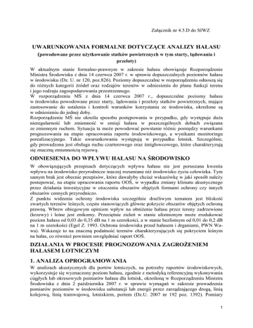 Załącznik nr 4.5.D do SIWZ UWARUNKOWANIA FORMALNE DOTYCZĄCE ANALIZY HAŁASU (powodowane przez użytkowanie statków powietrznych w tym starty, lądowania i przeloty) W aktualnym stanie formalno-prawnym w zakresie hałasu obowiązuje Rozporządzenie Ministra Środowiska z dnia 14 czerwca 2007 r. w sprawie dopuszczalnych poziomów hałasu w środowisku (Dz. U. nr 120, poz.826). Poziomy dopuszczalne w rozporządzeniu odnoszą się do różnych kategorii źródeł oraz rodzajów terenów w odniesieniu do planu funkcji terenu i jego rodzaju zagospodarowania przestrzennego. W rozporządzeniu MŚ z dnia 14 czerwca 2007 r., dopuszczalne poziomy hałasu w środowisku powodowane przez starty, lądowania i przeloty statków powietrznych, mające zastosowanie do ustalenia i kontroli warunków korzystania ze środowiska, określone są w odniesieniu do jednej doby. Rozporządzenie MŚ nie określa sposobu postępowania w przypadku, gdy występuje duża nieregularność lub zmienność w emisji hałasu w poszczególnych dobach związana ze zmiennym ruchem. Sytuacja ta może powodować powstanie różnic pomiędzy warunkami prognozowania na etapie opracowania raportu środowiskowego, a wynikami monitoringu porealizacyjnego. Takie uwarunkowania występują w przypadku lotnisk. Szczególnie, gdy prowadzona jest obsługa ruchu czarterowego oraz śmigłowcowego, które charakteryzują się znaczną zmiennością rejsową. ODNIESIENIA DO WPŁYWU HAŁASU NA ŚRODOWISKO W obowiązujących przepisach dotyczących wplywu hałasu nie jest poruszana kwestia wpływu na środowisko przyrodnicze inaczej rozumiane niż środowisko życia człowieka. Tym samym brak jest obecnie przepisów, które dawałyby chciaż wskazówkę w jaki sposób należy postepować, na etapie opracowania raportu OOŚ, w wypadku zmiany klimatu akustycznego przez działania inwestycyjne w otoczeniu obszarów objętych formami ochrony czy innych obszarów cennych przyrodniczo. Z punktu widzenia ochrony środowiska szczególnie drażliwym tematem jest bliskość zwartych terenów leśnych, często stanowiących główne pokrycie obszarów objętych ochroną prawną. Wbrew obiegowym opiniom wpływ na obniżenie hałasu przez tereny zadrzewione (krzewy) i leśne jest znikomy. Przeciętnie zieleń w stanie ulistnionym może zredukować poziom hałasu od 0,03 do 0,35 dB na 1 m szerokości, a w stanie bezlistnym od 0,01 do 0,2 dB na 1 m szerokości (Egel Z. 1993. Ochrona środowiska przed hałasem i drganiami, PWN Wawa). Wskazuje to na znaczną podatność terenów charakteryzujących się pokryciem leśnym na hałas, co również powinien uwzględniać raport OOŚ. DZIAŁANIA W PROCESIE PROGNOZOWANIA ZAGROŻENIEM HAŁASEM LOTNICZYM 1. ANALIZA OPROGRAMOWANIA W analizach akustycznych dla portów lotniczych, na potrzeby raportów środowiskowych, wykorzystuje się wyznaczony poziom hałasu, zgodnie z metodyką referencyjną wykonywania ciągłych lub okresowych pomiarów hałasu dla lotnisk, określoną w Rozporządzeniu Ministra Środowiska z dnia 2 października 2007 r. w sprawie wymagań w zakresie prowadzenia pomiarów poziomów w środowisku substancji lub energii przez zarządzającego drogą, linią kolejową, linią tramwajową, lotniskiem, portem (Dz.U. 2007 nr 192 poz. 1392). Pomiary 1 poziomu hałasu w środowisku powodowane ruchem lotniczym wykonuje się wykorzystując metodę pomiarów ciągłych, metodę pomiarów okresowych i metodę obliczeniową. Z punktu widzenia prowadzenia analiz hałasu na potrzeby raportu oddziaływania na środowisko najistotniejszą jest właśnie metoda obliczeniowa. Zgodnie z punktem V. Metody obliczeniowe załącznika nr 1 do rozporządzenia Ministra Środowiska z dnia 2 października 2007r. (poz. 1392): do oceny hałasu dla lotnisk stosuje się metodę obliczeniową INM (Integrated Noise Model). Metoda ta zawarta jest w przepisach międzynarodowych w rozumieniu ustawy z dnia 3 lipca — Prawo lotnicze oraz w dokumencie: Circular 205 — AN/1/25/1988 Międzynarodowej Organizacji Lotnictwa Cywilnego — ICAO oraz zaadaptowanym do warunków europejskich, przyjętym do stosowania przez dyrektywę 2002/49/WE dokumencie ECAC CEAC Doc. 29 Report on Standard Method of Computing Noise Countours around Civil Airports. W oparciu o ww. punkt V. Metody obliczeniowe wykonujący analizę prognostyczną w celu zachowania poprawności, w tym sprawdzalności przedstawionych wyników, powinien posłużyć się oprogramowaniem obliczeniowym zgodnym z INM i zgodnym z ECAC CEAC Doc. 29. Korzystnym aspektem może być wykorzystanie na potrzeby analizy akustycznej danych pomiarowych z funkcjonujących lotnisk na terenie kraju, pozwalającym na uzupełnienie bazy danych dla procedury obliczeniowej INM. Właśnie zasada analogii i przedstawienie podobieństw jest korzystna w wypadku konsultacji społecznych i jest najprostszą metodą obrazowania zjawisk konfliktowych, pozwalającą na przedstawienie planowanego zamierzenia i kwestii dotyczących hałasu. 2. ZASADY DOBORU PARAMETRÓW PROGNOZOWANIA Dobór parametrów dla prognozowania hałasu lotniczego w otoczeniu lotniska powinien uwzględniać następujące elementy: 1) położenie osi pasów startowych, dróg kołowania itp., określenie punktów startu i przyziemienia (min. wys. względem terenu i obiektów w otoczeniu), 2) określenie korytarzy podchodzenia do lądowania i startu oraz stałych elementów przestrzeni powietrznej CTR, TMA, AWY, CDR, a) strefa kontrolowana lotniska (Controlled Zone)(CTR), b) rejony kontrolowane lotnisk lub węzłów lotnisk (TMA), c) sieć stałych dróg lotniczych (AWY), d) warunkowe drogi lotnicze (CDR). 3) określenie parametrów technicznych pasów startowych, 4) określenia przewidywanego typu statków powietrznych obsługiwanych na lotnisku, 5) harmonogram obsługi rejsowej, W Rozporządzeniu z dnia 14 czerwca 2007 r. nie jest sprecyzowane kryterium wyboru doby, a w tym także sposobu określenia wartości przewidywanego przeciętnego ru