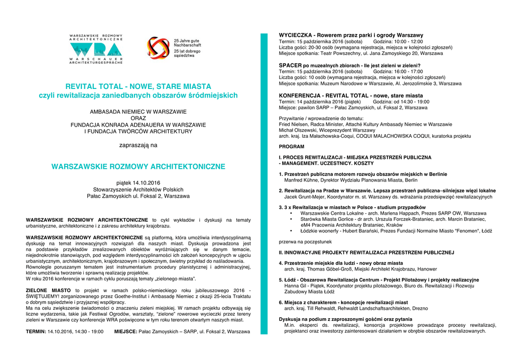 WYCIECZKA - Rowerem przez parki i ogrody Warszawy Termin: 15 października 2016 (sobota) Godzina: 10:00 - 12:00 Liczba gości: 20-30 osób (wymagana rejestracja, miejsca w kolejności zgłoszeń) Miejsce spotkania: Teatr Powszechny, ul. Jana Zamoyskiego 20, Warszawa SPACER po muzealnych zbiorach - Ile jest zieleni w zieleni? REVITAL TOTAL - NOWE, STARE MIASTA czyli rewitalizacja zaniedbanych obszarów śródmiejskich AMBASADA NIEMIEC W WARSZAWIE ORAZ FUNDACJA KONRADA ADENAUERA W WARSZAWIE I FUNDACJA TWÓRCÓW ARCHITEKTURY zapraszają na WARSZAWSKIE ROZMOWY ARCHITEKTONICZNE piątek 14.10.2016 Stowarzyszenie Architektów Polskich Pałac Zamoyskich ul. Foksal 2, Warszawa WARSZAWSKIE ROZMOWY ARCHITEKTONICZNE to cykl wykładów i dyskusji na tematy urbanistyczne, architektoniczne i z zakresu architektury krajobrazu. WARSZAWSKIE ROZMOWY ARCHITEKTONICZNE są platformą, która umożliwia interdyscyplinarną dyskusję na temat innowacyjnych rozwiązań dla naszych miast. Dyskusja prowadzona jest na podstawie przykładów zrealizowanych obiektów wyróżniających się w danym temacie, niejednokrotnie stanowiących, pod względem interdyscyplinarności ich założeń koncepcyjnych w ujęciu urbanistycznym, architektonicznym, krajobrazowym i społecznym, świetny przykład do naśladowania. Równolegle poruszanym tematem jest instrumentarium procedury planistycznej i administracyjnej, które umożliwia tworzenie i sprawną realizację projektów. W roku 2016 konferencje w ramach cyklu poruszają tematy „zielonego miasta”. ZIELONE MIASTO to projekt w ramach polsko-niemieckiego roku jubileuszowego 2016 ŚWIĘTUJEMY! zorganizowanego przez Goethe-Institut i Ambasadę Niemiec z okazji 25-lecia Traktatu o dobrym sąsiedztwie i przyjaznej współpracy. Ma na celu zwiększenie świadomości o znaczeniu zieleni miejskiej. W ramach projektu odbywają się liczne wydarzenia, takie jak Festiwal Ogrodów, warsztaty, “zielone” rowerowe wycieczki przez tereny zieleni w Warszawie czy konferencje WRA poświęcone w tym roku terenom otwartym naszych miast. TERMIN: 14.10.2016, 14:30 - 19:00 MIEJSCE: Pałac Zamoyskich – SARP, ul. Foksal 2, Warszawa Termin: 15 października 2016 (sobota) Godzina: 16:00 - 17:00 Liczba gości: 10 osób (wymagana rejestracja, miejsca w kolejności zgłoszeń) Miejsce spotkania: Muzeum Narodowe w Warszawie, Al. Jerozolimskie 3, Warszawa KONFERENCJA - REVITAL TOTAL - nowe, stare miasta Termin: 14 października 2016 (piątek) Godzina: od 14:30 - 19:00 Miejsce: pawilon SARP – Pałac Zamoyskich, ul. Foksal 2, Warszawa Przywitanie / wprowadzenie do tematu: Fried Nielsen, Radca Minister, Attaché Kultury Ambasady Niemiec w Warszawie Michał Olszewski, Wiceprezydent Warszawy arch. kraj. Iza Małachowska-Coqui, COQUI MALACHOWSKA COQUI, kuratorka projektu PROGRAM I. PROCES REWITALIZACJI - MIEJSKA PRZESTRZEŃ PUBLICZNA - MANAGEMENT. UCZESTNICY. KOSZTY 1. Przestrzeń publiczna motorem rozwoju obszarów miejskich w Berlinie Manfred Kühne, Dyrektor Wydziału Planowania Miasta, Berlin 2. Rewitalizacja na Pradze w Warszawie. Lepsza przestrzeń publiczna–silniejsze więzi lokalne Jacek Grunt-Mejer, Koordynator m. st. Warszawy ds. wdrażania przedsięwzięć rewitalizacyjnych 3. 3 x Rewitalizacja w miastach w Polsce - studium przypadków • Warszawskie Centra Lokalne - arch. Marlena Happach, Prezes SARP OW, Warszawa • Starówka Miasta Gorlice - dr arch. Urszula Forczek-Brataniec, arch. Marcin Brataniec, eM4 Pracownia Architektury Brataniec, Kraków • Łódzkie woonerfy - Hubert Barański, Prezes Fundacji Normalne Miasto "Fenomen", Łódź przerwa na poczęstunek II. INNOWACYJNE PROJEKTY REWITALIZACJI PRZESTRZENI PUBLICZNEJ 4. Przestrzenie miejskie dla ludzi - nowy obraz miasta arch. kraj. Thomas Göbel-Groß, Miejski Architekt Krajobrazu, Hanower 5. Łódź - Obszarowa Rewitalizacja Centrum - Projekt Pilotażowy i projekty realizacyjne Hanna Gil - Piątek, Koordynator projektu pilotażowego, Biuro ds. Rewitalizacji i Rozwoju Zabudowy Miasta Łódź 6. Miejsca z charakterem - koncepcje rewitalizacji miast arch. kraj. Till Rehwaldt, Rehwaldt Landschaftsarchitekten, Drezno Dyskusja na podium z zaproszonymi gośćmi oraz pytania M.in. eksperci ds. rewitalizacji, konsorcja projektowe prowadzące procesy rewitalizacji, projektanci oraz inwestorzy zainteresowani działaniem w obrębie obszarów rewitalizowanych. Priorytetowym obszarem dla Zintegrowanego Programu Rewitalizacji m.st. Warszawy do 2022 roku jest obszar dwóch sfer funkcjonalnych: śródmiejskiej i miejskiej prawobrzeżnej Warszawy, tj. część dzielnicy Praga-Północ, część dzielnicy Praga-Południe i część dzielnicy Targówek. Warszawa, znajdując się na samym początku długofalowych zmian strukturalnych w obrębie obszarów śródmiejskich ma przed sobą wiele kolejnych lat procesu rewitalizacji. Tym bardziej jest ważne przyjrzenie się teraz temu, jak prowadzone są one w innych miastach, w tym w innych miastach Europy, aby móc skorzystać z doświadczeń od początku przeprowadzanej transformacji. OPIS TEMATU Rewitalizacja to szeroki proces przemian społecznych, przestrzennych i ekonomicznych w obszarze kryzysowym. Jej celem jest ponowne przywrócenie do życia zdegradowanej części miasta i uzupełnienie jej o nowe funkcje, tak, aby w danym miejscu dobrze się przebywało, mieszkało i pracowało. Na rewitalizację składa się wiele czynników. Konieczne jest obok remontów nieruchomości działanie w kulturze, edukacji mieszkańców, współpraca z przedsiębiorcami dla poprawy lokalnej ekonomii, poprawa więzi społecznych, a także zmiany mające na celu poprawę środowiska przyrodniczego w małej, lokalnej skali. Wszystkie pozytywne oddziaływania mają wpływ poza samym terenem rewitalizacji na poprawę również obszarów sąsiadujących. Rezultaty procesów rewitalizacyjnych powinny być długotrwałe i tworzyć nowe synergie. Na konferencji REVITAL TOTAL przyjrzymy się rewitalitacji przestrzeni publi