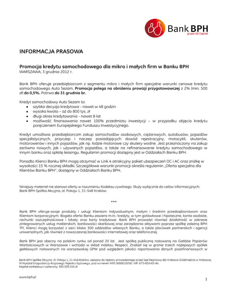 INFORMACJA PRASOWA Promocja kredytu samochodowego dla mikro i małych firm w Banku BPH WARSZAWA, 3 grudnia 2012 r. Bank BPH oferuje przedsiębiorcom z segmentu mikro i małych firm specjalne warunki cenowe kredytu samochodowego Auto Sezam. Promocja polega na obniżeniu prowizji przygotowawczej z 2% (min. 500 zł) do 0,5%. Potrwa do 31 grudnia br. Kredyt samochodowy Auto Sezam to: szybka decyzja kredytowa - nawet w 48 godzin wysoka kwota – aż do 800 tys. zł długi okres kredytowania - nawet 8 lat możliwość finansowania nawet 100% przedmiotu inwestycji – w przypadku objęcia kredytu poręczeniem Europejskiego Funduszu Inwestycyjnego. Kredyt umożliwia przedsiębiorcom zakup samochodów osobowych, ciężarowych, autobusów, pojazdów specjalistycznych, przyczep i naczep posiadających dowód rejestracyjny, motocykli, skuterów, motorowerów i innych pojazdów, jak np. łodzie motorowe czy skutery wodne. Jest przeznaczony na zakup zarówno nowych, jak i używanych pojazdów, a także na refinansowanie kredytu samochodowego w innym banku oraz spłatę leasingu. Regulamin promocji dostępny jest w Oddziałach Banku BPH. Ponadto Klienci Banku BPH mogą otrzymać w Link 4 atrakcyjny pakiet ubezpieczeń OC i AC oraz zniżkę w wysokości 15 % rocznej składki. Szczegółowe warunki promocji określa regulamin „Oferta specjalna dla Klientów Banku BPH”, dostępny w Oddziałach Banku BPH. Niniejszy materiał nie stanowi oferty w rozumieniu Kodeksu cywilnego. Służy wyłącznie do celów informacyjnych. Bank BPH Spółka Akcyjna, al. Pokoju 1, 31-548 Kraków. *** Bank BPH oferuje swoje produkty i usługi Klientom indywidualnym, małym i średnim przedsiębiorstwom oraz Klientom korporacyjnym. Bogata oferta Banku zawiera m.in.: kredyty, w tym gotówkowe i hipoteczne, konta osobiste, rachunki oszczędnościowe i lokaty oraz karty kredytowe. Bank BPH prowadzi również działalność w zakresie zintegrowanych usług maklerskich, bankowości skarbowej oraz zarządzania aktywami poprzez spółkę zależną BPH TFI. Klienci mogą korzystać z sieci blisko 300 oddziałów własnych Banku, a także placówek partnerskich i agencji uniwersalnych, jak również z nowoczesnej bankowości internetowej oraz telefonicznej. Bank BPH jest obecny na polskim rynku od ponad 20 lat. Jest spółką publiczną notowaną na Giełdzie Papierów Wartościowych w Warszawie i wchodzi w skład indeksu Respect. Znalazł się w gronie trzech najlepszych spółek giełdowych notowanych na warszawskiej GPW pod względem jakości raportowania danych pozafinansowych w 1 rankingu Stowarzyszenia Emitentów Giełdowych. Siedzibą prawną Banku BPH jest Kraków, biuro centrali znajduje się w Warszawie, a główne centra operacyjne w Gdańsku i Krakowie. Bank BPH wchodzi w skład grupy kapitałowej GE, jednej z największych korporacji na świecie. 2