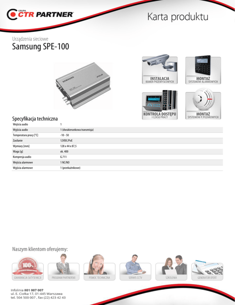 Urządzenia sieciowe Samsung SPE-100 INSTALACJA KAMER PRZEMYSŁOWYCH KONTROLA DOSTĘPU I CZASU PRACY Specyfikacja techniczna Wejścia audio 1 Wyjścia audio 1 (dwukierunkowa transmisja) Temperatura pracy [°C] -10 - 50 Zasilanie 12VDC/PoE Wymiary [mm] 128 x 44 x 87,5 Waga [g] ok. 400 Kompresja audio G.711 Wejścia alarmowe 1 NC/NO Wyjścia alarmowe 1 (przekaźnikowe) MONTAŻ SYSTEMÓW ALARMOWYCH MONTAŻ SYSTEMÓW P.POŻAROWYCH Naszym klientom oferujemy: GWARANCJA SATYSFAKCJI PROGRAM PARTNERSKI POMOC TECHNICZNA SERWIS CCTV SZKOLENIA GENERATOR OFERT