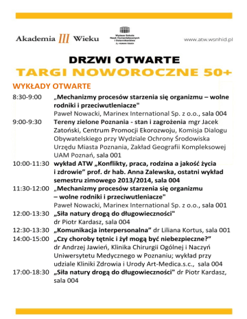 WYKŁADY OTWARTE 8:30-9:00 9:00-9:30 10:00-11:30 11:30-12:00 12:00-13:30 12:30-13:30 14:00-15:00 17:00-18:30 „Mechanizmy procesów starzenia się organizmu – wolne rodniki i przeciwutleniacze" Paweł Nowacki, Marinex International Sp. z o.o., sala 004 Tereny zielone Poznania - stan i zagrożenia mgr Jacek Zatoński, Centrum Promocji Ekorozwoju, Komisja Dialogu Obywatelskiego przy Wydziale Ochrony Środowiska Urzędu Miasta Poznania, Zakład Geografii Kompleksowej UAM Poznań, sala 001 wykład ATW „Konflikty, praca, rodzina a jakość życia i zdrowie” prof. dr hab. Anna Zalewska, ostatni wykład semestru zimowego 2013/2014, sala 004 „Mechanizmy procesów starzenia się organizmu – wolne rodniki i przeciwutleniacze" Paweł Nowacki, Marinex International Sp. z o.o., sala 001 „Siła natury drogą do długowieczności" dr Piotr Kardasz, sala 004 „Komunikacja interpersonalna” dr Liliana Kortus, sala 001 „Czy choroby tętnic i żył mogą być niebezpieczne?” dr Andrzej Jawień, Klinika Chirurgii Ogólnej i Naczyń Uniwersytetu Medycznego w Poznaniu; wykład przy udziale Kliniki Zdrowia i Urody Art-Medica.s.c., sala 004 „Siła natury drogą do długowieczności" dr Piotr Kardasz, sala 004 WARSZTATY 10:00–10:30 Trening Pamięci, dr Liliana Kortus (obowiązują zapisy), sala N204 11:00-11:30 Trening Pamięci, dr Liliana Kortus (obowiązują zapisy), sala N204 10:00 Język angielski lekcja pokazowa, mgr Romana Laskowska, sala N201 11:00 Język angielski lekcja pokazowa, mgr Anna Piotrowska, sala N201 12:00 Język angielski lekcja pokazowa, mgr Romana Laskowska, sala N201 12:30-15:00 Fotografia warsztaty pokazowe (obowiązują zapisy), Rafał Grzesiak, sala N107 12:30 „Okiem seniora – Aktywni 55+” konkurs fotograficzny organizowany przez Europejskie Centrum Współpracy Obywatelskiej, sala N107 13:00 Język angielski lekcja pokazowa, mgr Anna Piotrowska, sala N201 9:45-12:00 Zajęcia komputerowe inż. Agnieszka Czajka wraz z projektem Centrum Promocji Ekorozwoju (obowiązują zapisy), sala N101 12:15 Język niemiecki, mgr Izabela Piontek – test językowy, sala N201 WYKŁADOWCY Sala 002 9:00-12:30 Sekcja sutasz, Agnieszka Wajzer-Nowak 9:00-12:30 Sekcja Decoupage, Agnieszka Wajzer-Nowak 11:00-13:00 Sekcja Styl życia a zdrowie, Ewa Maćkowiak 11:30-13:30 Sekcja rozwoju osobistego, Kinga Zinkowska 12:00-13:00 Język rosyjski, Wiesława Ewald –Kępczyńska Sala 003 9:45-14:00 Taniec brzucha, taniec klasyczny, Jazz dance – lata 20-ste, lata 30-ste, Małgorzata Wieczorek 10:00-12:00 Malarstwo, Tomasz Mazur 10:00-12:00 Sekcja Humanistyczna, dr Anna Mazurkiewicz-Szczyszek 10:00-12:00 Sekcja Gimnastyka przeciwbólowa, mgr Roman Kozłowski, 12:30-14:00 Zumba Gold, Monika Domagała POKAZY Sala 003 9:45-10:15 Taniec brzucha, taniec klasyczny, Jazz dance – lata 20-ste, lata 30ste, Małgorzata Wieczorek 13:45-14:00 Taniec brzucha, taniec klasyczny, Jazz dance – lata 20-ste, lata 30ste, Małgorzata Wieczorek 14:00 Zumba Gold, Monika Domagała Sala Fitness 10:30-11:00 Trening Kondycji, Adrianna Dudek, sala Fitness BADANIA 10:00-14:00 Klinika Zdrowia i Urody Art-Medica.s.c. - Badania USG metodą Dopplera (obowiązują zapisy),sala N205 WYSTAWCY parter WSNHiD Marinex International Sp. z o.o. Klinika Zdrowia i Urody Art-Medica.s.c. Rozruszaj stawy z Voltare MAX do 12h Centrum Promocji Ekorozwoju konkurs fotograficzny “Okiem Seniora – Aktywni 55+” Zespół Szkół Da Vinci przy WSNHiD Biblioteka WSNHiD Biuro Akademii Trzeciego Wieku (punkt informacyjny oraz odbioru ulotki na semestr letni 2013/2014)
