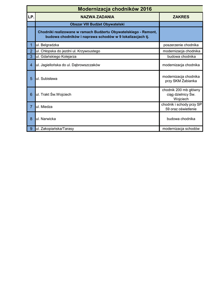 Modernizacja chodników 2016 LP. NAZWA ZADANIA ZAKRES Obszar VIII Budżet Obywatelski Chodniki realizowane w ramach Budżertu Obywatelskiego - Remont, budowa chodników i naprawa schodów w 9 lokalizacjach tj. 1 ul. Belgradzka poszerzenie chodnika 2 ul. Chłopska do jezdni ul. Krzywoustego 3 ul. Gdańskiego Kolejarza modernizacja chodnika 4 ul. Jagiellońska do ul. Dąbrowszczaków modernizacja chodnika 5 ul. Subisława modernizacja chodnika przy SKM Żabianka 6 ul. Trakt Św.Wojciech chodnik 200 mb główny ciąg dzielnicy Św. Wojciech 7 ul. Miedza chodnik i schody przy SP 59 oraz oświetlenie 8 ul. Narwicka 9 ul. Zakopiańska/Tarasy budowa chodnika budowa chodnika modernizacja schodów