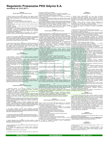 Regulamin Przewozów PKS Gdynia S.A. obowiązuje od: 23.01.2017 r. Rozdział 1 Przepisy ogólne dotyczące przewozu osób (w tym także e-papierosy) w pojeździe; d) używające słów powszechnie uważanych za wulgarne lub obraźliwe; e) które nie posiadają ważnego biletu na przejazd lub należności za bilet upoważniający do kontynuowania przejazdu w pojeździe; f) które z innych powodów są niebezpieczne lub uciążliwe dla pasażerów i kierującego pojazdem; 2. W szczególnie uzasadnionych przypadkach w celu uzyskania pomocy, kierujący ma prawo zjechać z trasy przejazdu do najbliższego posterunku Policji lub punktu pomocy hospitalizacyjnej; 3. W przypadku stwierdzenia, że pasażer narusza przepisy dotyczące Regulaminu Przewozu, kierujący pojazdem lub kontroler biletów upoważniony jest do wezwania takiego pasażera do opuszczenia pojazdu na najbliższym przystanku. W takim przypadku pasażerowi temu nie przysługuje zwrot należności za bilet; 4. W przypadku, gdy pasażer odmówi opuszczenia pojazdu, kierujący pojazdem lub kontroler biletów może zwrócić się o udzielenie pomocy do Policji lub innych organów porządkowych (upoważnionych). §1 1. Niniejszy regulamin określa warunki przewozu osób, bagażu, rowerów, wózków, zwierząt, środkami komunikacji regionalnej w sieci PKS Gdynia S.A., a także sposób przeprowadzania w niej kontroli biletów oraz zwrotu pieniędzy za bilety. 2. Słownik pojęć użytych w regulaminie: a) „autobus”, „pojazd” - autobus przewoźnika, tj. PKS Gdynia S.A.; b) „przewoźnik” - wykonująca usługi przewozowe spółka PKS Gdynia S.A. (w skrócie: PKS) c) „przewóz” - przewóz osób, bagażu, rowerów, wózków, zwierząt wykonywany przez przewoźnika; d) „pasażer”, „podróżny” - każda osoba, która zawarła umowę przewozu lub przebywa w pojeździe; e) „punkt sprzedaży” - kasy biletowe oraz ajencyjne punkty sprzedaży biletów; f) „kontrolujący” - osoba upoważniona przez przewoźnika do przeprowadzenia kontroli biletów, dokumentów potwierdzających uprawnienia do korzystania Rozdział 4 z bezpłatnego bądź ulgowego przewozu osób, bagażu, roweru, zwierzęcia Przewóz bagażu i zwierząt, przewóz rowerów oraz zastosowania opłat dodatkowych; g) „zwierzę domowe” - zwierzęta tradycyjne przebywające wraz z człowiekiem §1 w jego domu, utrzymywane przez człowieka w charakterze jego towarzysza. 1. Pasażerowie mogą przewozić w pojazdach bagaż ręczny, wózek dziecięcy, wózek inwalidzki, zwierzęta domowe oraz - za zgodą kierowcy autobusu także rower; §2 2. Rowery przewożone są w ramach posiadanych możliwości technicznych. 1. Przewóz osób oraz bagażu środkami komunikacji należącymi do przewoźnika Przed wejściem do autobusu należy zwrócić się do kierowcy, celem uzyskania zgody odbywa się na podstawie ważnego biletu oraz dokumentu potwierdzającego na przewóz roweru. Kierujący pojazdem może odmówić wejścia do pojazdu uprawnienia pasażera do korzystania z bezpłatnego lub ulgowego przejazdu. z rowerem w sytuacji spodziewanej dużej liczby podróżnych na dalszym odcinku 2. Za zawarcie umowy przewozu uważa się zajęcie miejsca w pojeździe przez trasy. W przypadku zgody kierowcy na przewóz roweru, rower musi być odpowiednio pasażera (zarówno miejsce siedzące, jak miejsce stojące). zabezpieczony przez właściciela na cały czas przejazdu autobusem; 3. Przewóz zwierząt jest dopuszczony pod warunkiem, że są przewożone §3 w specjalnych pojemnikach przeznaczonych do ich transportu lub 1. Przewoźnik zobowiązany jest do zamieszczenia w punktach sprzedaży jego w kagańcach i na smyczy, a pasażer posiada w czasie przewozu ważne biletów, a także w jego siedzibie aktualnego cennika biletów (za przewóz zaświadczenie potwierdzające aktualne obowiązkowe szczepienie osób, bagażu) z uwzględnieniem wysokości opłat dodatkowych za przejazd lub świadectwo zdrowia, zgodnie z odpowiednimi przepisami dotyczącymi bez ważnego biletu, za spowodowanie zmiany trasy przejazdu bądź zwalczania chorób zakaźnych zwierząt; zatrzymania pojazdu bez uzasadnionej przyczyny. 4. Bagażu, wózków, rowerów i zwierząt nie można umieszczać na miejscach 2. W miejscach, o których mowa w ust. 1 przewoźnik wywiesza informację przeznaczonych do siedzenia; o kategoriach osób uprawnionych do przejazdów bezpłatnych i ulgowych 5. Nadzór nad bagażem podręcznym, walizką, wózkiem, rowerem pojazdami oraz o zasadach sprzedaży biletów jednorazowych w pojeździe. jak i zwierzętami, które pasażer przewozi ze sobą, należy do pasażera. Za taki bagaż i zwierzęta przewoźnik odpowiada tylko gdy szkoda powstała z jego winy lub rażącego niedbalstwa; Rozdział 2 6. Nie podlega opłacie przewóz: Zakup i sprzedaż biletów a) bagażu podręcznego lub walizki; b) wózka inwalidzkiego; §1 c) wózka dziecięcego, w przypadku przewożenia w nim dziecka; 1. Bilet zakupiony w punkcie sprzedaży, pasażer powinien niezwłocznie d) instrumentów muzycznych i sztalug przewożonych przez uczniów po wejściu do pojazdu okazać kierowcy w celu kontroli. Kierujący pojazdem i studentów za okazaniem ważnej legitymacji szkolnej lub studenckiej; upoważniony jest do kontroli biletów; e) psów towarzyszących funkcjonariuszom celnym, Policji, Straży Miejskiej, 2. Przewoźnik zapewnia pasażerom zakup biletów bezpośrednio od Straży Granicznej będącej na służbie; kierującego pojazdem, podczas postoju pojazdu na przystanku. W tym celu f) psów-przewodników niewidomych i ociemniałych; pasażer powinien wejść do pojazdu przednim wejściem (pierwszymi drzwiami, 7. Opłacie bagażowej podlega przewóz: licząc od czoła pojazdu) i niezwłocznie dokonać zakupu biletu; a) roweru; 3. Nabywając bilet ulgowy lub bezpłatny pasażer winien okazać bez wezwania b) zwierząt domowych z uwzględnieniem ust. 6 pkt. e) i f). dokument uprawniający go do ulgowego przej