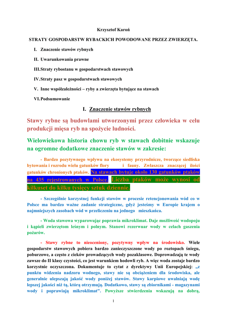 Krzysztof Karoń STRATY GOSPODARSTW RYBACKICH POWODOWANE PRZEZ ZWIERZĘTA. I. Znaczenie stawów rybnych II. Uwarunkowania prawne III.Straty rybostanu w gospodarstwach stawowych IV. Straty pasz w gospodarstwach stawowych V. Inne współzależności – ryby a zwierzęta bytujące na stawach VI. Podsumowanie I. Znaczenie stawów rybnych Stawy rybne są budowlami utworzonymi przez człowieka w celu produkcji mięsa ryb na spożycie ludności. Wielowiekowa historia chowu ryb w stawach dobitnie wskazuje na ogromne dodatkowe znaczenie stawów w zakresie: - Bardzo pozytywnego wpływu na ekosystemy przyrodnicze, tworzące siedliska bytowania i rozrodu wielu gatunków flory i fauny. Zwłaszcza znaczącej ilości gatunków chronionych ptaków. Na stawach bytuje około 130 gatunków ptaków na 435 rejestrowanych w Polsce. Liczba ptaków może wynosi od kilkuset do kilku tysięcy sztuk dziennie. - Szczególnie korzystnej funkcji stawów w procesie retencjonowania wód co w Polsce ma bardzo ważne zadanie strategiczne, gdyż jesteśmy w Europie krajem o najmniejszych zasobach wód w przeliczeniu na jednego mieszkańca. - Woda stawowa wyparowując poprawia mikroklimat. Daje możliwość wodopoju i kąpieli zwierzętom leśnym i polnym. Stanowi rezerwuar wody w celach gaszenia pożarów. - Stawy rybne to nieoceniony, pozytywny wpływ na środowisko. Wiele gospodarstw stawowych pobiera bardzo zanieczyszczone wody po roztopach śniegu, poburzowe, a często z cieków prowadzących wody pozaklasowe. Doprowadzają te wody zawsze do II klasy czystości, co jest warunkiem hodowli ryb. A więc woda zostaje bardzo korzystnie oczyszczona. Dokumentuje to cytat z dyrektywy Unii Europejskiej: „z punktu widzenia nadzoru wodnego, stawy nie są obciążeniem dla środowiska, ale generalnie ulepszają jakość wody poniżej stawów. Stawy karpiowe uwalniają wodę lepszej jakości niż tą, którą otrzymują. Dodatkowo, stawy są zbiornikami - magazynami wody i poprawiają mikroklimat". Powyższe stwierdzenia wskazują na dobrą, 1 harmonijną egzystencję od bardzo dawna we współistnieniu stawów z przyrodą. Dowodem na ww. stwierdzenie jest fakt utworzenia niemal na większości obiektach stawowych, obszarów chronionych Natura 2000. Można więc w tej sytuacji wysnuć oczywisty wniosek, że upadek gospodarki rybackiej na stawach, spowoduje ogromne straty dla środowiska przyrodniczego. Nie będzie w stawach wody, stawy zanikną a wraz z tym i populacje zwierząt związanych z jej środowiskiem. Stan taki może nastąpić z powodu zaniku opłacalności produkcji rybackiej na stawach. Przyczynić się może do tego m.in. zachwianie panującej od wieków równowagi w zakresie ilości i jakości populacji zwierząt rybożernych bytujących na stawach. Na straży zachowania tej równowagi, powinno stać zarówno stanowione prawo, jak i właściwa wiedza merytoryczna i jej stosowanie, zarówno przez rybaków, organy odpowiadające za ochronę przyrody i wiele różnych środowisk przyrodniczych! II. Uwarunkowania prawne „Kogo Pan Bóg chce zgubić, temu najpierw rozum odbiera” - Wykorzystuję we wstępie znane przysłowie, ponieważ jego przesłanie pasuje do skomentowania sytuacji, która istnieje obecnie w zakresie dramatycznej sytuacji, niszczącej wielowiekową hodowlę i chów ryb w polskich stawach a w efekcie przyczyni się po ich upadku, do degradacji przyrodniczej i ekologicznej wielu obszarów chronionych Natura 2000! Problemy ochrony gospodarstw rybackich przed zwierzętami rybożernymi w świetle nowych, obowiązujących przepisów pokazują, że Gospodarstwa Rybackie chroniąc swoją produkcję na podstawie art. 52 ust. 2 pkt. 5 ustawy o ochronie przyrody ( DZ. U. z 2004 Nr 92 poz. 880 ) mogły w stosunku do gatunków dziko występujących zwierząt objętych ochroną gatunkową, w przypadku braku rozwiązao alternatywnych i jeżeli nie spowoduje to zagrożenia dla dziko występujących populacji zwierząt objętych ochroną gatunkową, dokonad odstępstwa od zakazów w celu zapobiegania poważnym szkodom, w szczególności w gospodarstwach rolnych, leśnych lub rybackich. Na tej podstawie rybacy dokonywali płoszenia i odstrzału kormoranów, czapli siwych i wydr na obiektach stawowych uznanych za obręby hodowlane. Niestety nowelizacja ustawy o ochronie przyrody od 15.11.2008r. wprowadza art. 52 ust. 3, którego zapis stanowi, że wszelkie odstępstwa od zakazów umyślnego płoszenia, nękania, zabijania ( itd.) nie dotyczą gatunków ptaków. Przepis ten łącznie z rozporządzeniem Ministra Środowiska z dn. 12.10.2011r. w sprawie ochrony gatunkowej zwierząt – wyłączającym możliwośd płoszenia, nękania, zabijania kormoranów czarnych, czapli siwych i wydr na stawach, na których ustanowiono obręb hodowlany, zniósł możliwośd dla rybaków ochrony stawów przed zwierzętami rybożernymi. W związku z powyższym Gospodarstwa Rybackie mogą obecnie jedynie na podstawie art. 56 ust. 2 pkt 1 ustawy o ochronie przyrody, występowad do Regionalnych Dyrektorów Ochrony Środowiska ( RDOŚ ) z wnioskiem o wydanie zezwolenia na umyślne płoszenie, niepokojenie i zabicie kormoranów, czapli siwych i wydr w celu ochrony produkcji rybackiej. Praktycznie 2 płoszenie ptaków na stawach, staje się przestępstwem, gdy nie ma zgody RDOŚ, bo na wszystkich stawach i w ich sąsiedztwie znajdują się różne gatunki ptaków chronionych. Począwszy od 2012r. wpłynęły do RDOŚ pierwsze wnioski Gospodarstw Rybackich o wydanie zezwoleo na umyślne nękanie, płoszenie i zabicie osobników kormorana czarnego, czapli siwej i wydry - w tym momencie jednak pojawiły się kolejne niezrozumiałe utrudnienia i problemy. Poniżej przedstawiam niektóre z nich: 1. Wydane decyzje RDOŚ, określające warunki realizacji zezwoleo, zawierają niepraktyczne, sprzeczne z celem ochrony stawów, niewykonalne obwarowania, absolutnie nie zapewniające, ochrony ryb na stawach m. in. takie jak: - „umyślne płoszenie, n
