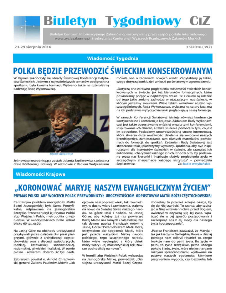 Biuletyn Tygodniowy CIZ Biuletyn Centrum Informacyjnego Zakonów opracowywany przez zespół portalu internetowego www.zyciezakonne.pl i sekretariat Konferencji Wyższych Przełożonych Zakonów Męskich 23-29 sierpnia 2016 35/2016 (392) Wiadomość Tygodnia POLKA BĘDZIE PRZEWODZIĆ ŚWIECKIM KONSEKROWANYM W Rzymie zakończyły się obrady Światowej Konferencji Instytutów Świeckich. Jednym z najważniejszych tematów podjętych na spotkaniu była kwestia formacji. Wybrano także na czteroletnią kadencję Radę Wykonawczą. Jolanta Szpilarewicz Jej nową przewodniczącą została Jolanta Szpilarewicz, stojąca na czele Konferencji Polskiej. W rozmowie z Radiem Watykańskim mówiła ona o zadaniach nowych władz. Zapytaliśmy ją także, czego dotyczą konkluzje i wnioski po światowym zgromadzeniu. „Dotyczą one zarówno pogłębienia tożsamości świeckich konsekrowanych w świecie, jak też kierunków formacyjnych, które powinniśmy podjąć w najbliższym czasie. Te kierunki są zależne od tego jakie zmiany zachodzą w otaczającym nas świecie, w którym jesteśmy zanurzeni. Wiele takich wniosków zostało wyszczególnionych. Rada Wykonawcza, wybrana na cztery lata, ma na ich podstawie wytyczyć kierunki pogłębiającą naszą formację. W ramach Konferencji Światowej istnieją również konferencje kontynentalne i konferencje krajowe. Zadaniem Rady Wykonawczej jest także pozostawanie w ścisłej więzi z tymi konferencjami, inspirowanie ich działań, a także służenie pomocą w tym, co jest im potrzebne. Posiadamy unowocześnioną stronę internetową, która stwarza duże możliwości dzielenia się owocami naszych przedsięwzięć, zamieszczania tam różnych materiałów pomocnych do formacji, do spotkań. Zadaniem Rady Światowej jest stworzenie takiej płaszczyzny wymiany, spotkania, aby być inspirującymi dla instytutów świeckich w świecie, ale szanując ich autonomię i charyzmat każdego z nich. Chodzi o to, by podawane przez nas kierunki i inspiracje służyły pogłębieniu życia w szczególnym charyzmacie każdego instytutu” – powiedziała Szpilarewicz. Za: Radio watykańskie Wiadomości Krajowe „KORONOWAĆ MARYJĘ NASZYM EWANGELICZNYM ŻYCIEM” PRYMAS POLSKI ABP WOJCIECH POLAK PRZEWODNICZYŁ UROCZYSTOŚCIOM ODPUSTOWYM MATKI BOŻEJ CZĘSTOCHOWSKIEJ Centralnym punktem uroczystości Matki Bożej Jasnogórskiej była Suma Pontyfikalna, odprawiana na jasnogórskim Szczycie. Przewodniczył jej Prymas Polski abp Wojciech Polak, metropolita gnieźnieński. W uroczystościach brało udział blisko 60 tys. osób. Na Jasną Górę na obchody uroczystości przybywali przez ostatnie dni piesi pielgrzymi, głównie z archidiecezji częstochowskiej oraz z diecezji sąsiadujących: łódzkiej, katowickiej, sosnowieckiej, radomskiej, gliwickiej i kaliskiej. W sumie pieszo i rowerami dotarło 32 tys. osób. Zebranych powitał o. Arnold Chrapkowski, generał Zakonu Paulinów. Mówił: „Jak ojcowie nasi poprzez wieki, tak również i my, w duchu wiary i zawierzenia, stajemy na nowo na Świętej Górze naszego narodu, na górze łaski i nadziei, na Jasnej Górze, aby kolejny już raz powierzyć Bożej Matce nas samych i całą Polskę. Nie tak dawno papież Franciszek mówił o Jasnej Górze: ‘Przed obrazem Matki Bożej otrzymałem dar spojrzenia Matki, która jest przede wszystkim Matką narodu polskiego, tego szlachetnego narodu, który wiele wycierpiał, a który dzięki mocy wiary i Jej macierzyńskiej ręki zawsze podnosił się na nowo’”. W homilii abp Wojciech Polak, wskazując na Jasnogórską Matkę, powiedział: „Dzisiejsza uroczystość Matki Bożej Często- chowskiej to przecież kolejna okazja, by się do Niej zwrócić. To szansa, aby szukając u Niej wstawiennictwa przed Bogiem, uwierzyć w ożywczą siłę Jej życia, wpatrzeć się w Jej sposób postępowania i zaczerpnąć coś z Jej mocy dla naszego życia i postępowania”. „Papież Franciszek zauważył, że Maryja tak jak kiedyś w Galilejskiej Kanie – dzisiaj pomaga nam odkryć również to, czego brakuje nam do pełni życia. Bo życie w pełni, to życie szczęśliwe, pełne Bożego pokoju i ładu, życie, które nie jest targane różnymi sprzecznościami, wydawane na pastwę naszych egoizmów, karmione pragnieniem wygody, czy beztroską lub 23-29 sierpnia 2016 Biuletyn Tygodniowy CiZ 35/2016 (392) ______________________________________________________________________________________________ obojętnością na drugich” – mówił kaznodzieja. Prymas Polski podkreślił jednak, że „nikt z nas nie jest w stanie sam, jedynie o własnych siłach czy własnym pomysłem uczynić życia pełnym i szczęśliwym”. „Nikt nie przemieni wody w wino, nie dokona uzdrawiającego cudu i nie zapewni innym pełni szczęścia – kontynuował – Widząc jednak to wszystko, czego nam brakuje do pełni życia, nie popadajmy w rozpacz czy bierność, bo widząc zniechęcenie i znużenie tak wielu osób, nie wolno nam mówić, tutaj już nic nie da się zrobić. To nie jest postawa chrześcijanina, trzeba raczej otworzyć ucho na słowo Jezusa: ‘napełnijcie stągwie wodą (…) zaczerpnijcie (…) zanieście staroście weselnemu’. Cud przemiany wody w wino, ten początek znaków, jak mówi św. Jan, które uczynił Jezus w Kanie Galilejskiej, domaga się odpowiedzi i współpracy. Bóg-z-nami, Oblubieniec Kościoła wciąż liczy na naszą odpowiedź. Może właśnie dlatego, kończąc swoją jasnogórską homilię papież Franciszek nas przestrzegał, żebyśmy pamiętali, że tak naprawdę to na niewiele się zda przejście między dziejami przed i po Chrystusie, jeżeli zostanie jedynie datą w kronikach historii. Na niewiele się zda nasze świętowanie kolejnych rocznic chrztu, jeżeli zatrzymamy się tylko na wdzięcznym wspomnieniu przeszłości”. Abp Wojciech Polak zachęcił do pójścia za wzorem Maryi, i życia tak, jak Ona żyła: „Działać w miłości, a nie w nie