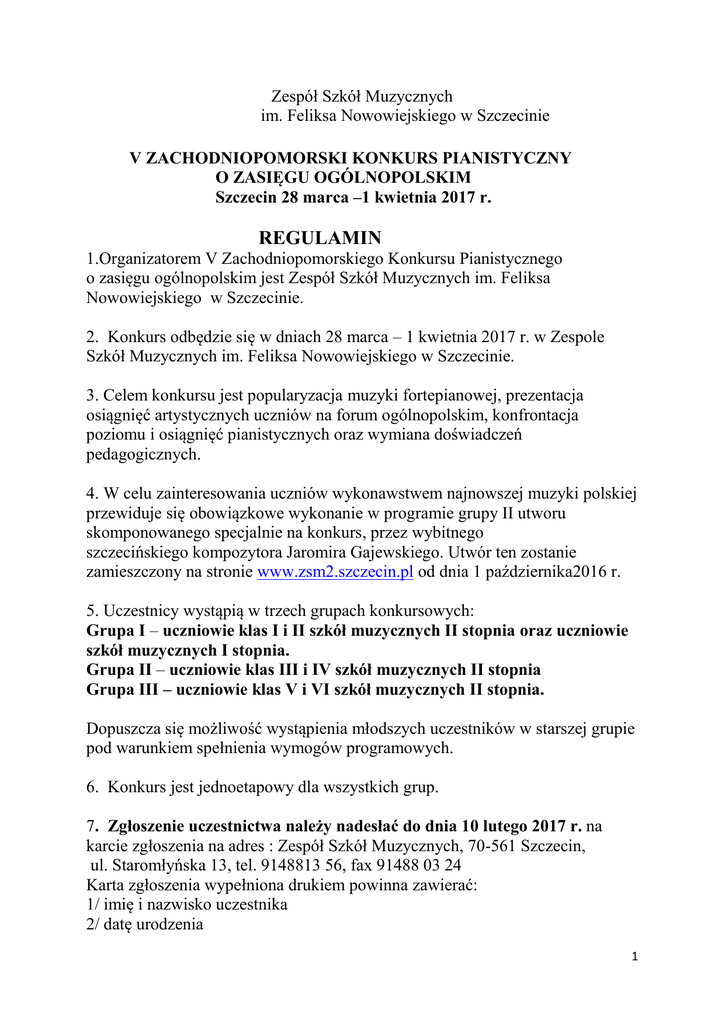Zespół Szkół Muzycznych im. Feliksa Nowowiejskiego w Szczecinie V ZACHODNIOPOMORSKI KONKURS PIANISTYCZNY O ZASIĘGU OGÓLNOPOLSKIM Szczecin 28 marca –1 kwietnia 2017 r. REGULAMIN 1.Organizatorem V Zachodniopomorskiego Konkursu Pianistycznego o zasięgu ogólnopolskim jest Zespół Szkół Muzycznych im. Feliksa Nowowiejskiego w Szczecinie. 2. Konkurs odbędzie się w dniach 28 marca – 1 kwietnia 2017 r. w Zespole Szkół Muzycznych im. Feliksa Nowowiejskiego w Szczecinie. 3. Celem konkursu jest popularyzacja muzyki fortepianowej, prezentacja osiągnięć artystycznych uczniów na forum ogólnopolskim, konfrontacja poziomu i osiągnięć pianistycznych oraz wymiana doświadczeń pedagogicznych. 4. W celu zainteresowania uczniów wykonawstwem najnowszej muzyki polskiej przewiduje się obowiązkowe wykonanie w programie grupy II utworu skomponowanego specjalnie na konkurs, przez wybitnego szczecińskiego kompozytora Jaromira Gajewskiego. Utwór ten zostanie zamieszczony na stronie www.zsm2.szczecin.pl od dnia 1 października2016 r. 5. Uczestnicy wystąpią w trzech grupach konkursowych: Grupa I – uczniowie klas I i II szkół muzycznych II stopnia oraz uczniowie szkół muzycznych I stopnia. Grupa II – uczniowie klas III i IV szkół muzycznych II stopnia Grupa III – uczniowie klas V i VI szkół muzycznych II stopnia. Dopuszcza się możliwość wystąpienia młodszych uczestników w starszej grupie pod warunkiem spełnienia wymogów programowych. 6. Konkurs jest jednoetapowy dla wszystkich grup. 7. Zgłoszenie uczestnictwa należy nadesłać do dnia 10 lutego 2017 r. na karcie zgłoszenia na adres : Zespół Szkół Muzycznych, 70-561 Szczecin, ul. Staromłyńska 13, tel. 9148813 56, fax 91488 03 24 Karta zgłoszenia wypełniona drukiem powinna zawierać: 1/ imię i nazwisko uczestnika 2/ datę urodzenia 1 3/ nazwę i adres szkoły 4/ klasę 5/ grupę konkursową 6/ imię i nazwisko pedagoga 7/ program konkursowy 8/ czas trwania programu 9/ pieczęć i podpis dyrektora szkoły 8. Harmonogram przebiegu konkursu, w tym prób i przesłuchań konkursowych oraz wszelkie istotne informacje zostaną przesłane e-mailem lub faksem najpóźniej na miesiąc przed rozpoczęciem konkursu. 9. Przesłuchania konkursowe dla każdej grupy wiekowej odbywać się będą w kolejności alfabetycznej od wylosowanej wcześniej litery. 10. Koszty związane z konkursem (dojazd, zakwaterowanie, wyżywienie) pokrywają uczestnicy we własnym zakresie. 11. Jury konkursu zostanie powołane przez Dyrektora Centrum Edukacji Artystycznej. 12. Kandydaci oceniani będą w skali 1-25 pkt. 13. Decyzje Jury są ostateczne i niepodważalne. 14. Nie dopuszcza się możliwości uczestniczenia w konkursie ucznia Jurora. 15. Laureaci konkursu to zdobywcy trzech pierwszych miejsc w każdej grupie. Otrzymają oni nagrody oraz dyplomy. Przewidziane są również wyróżnienia. Ponadto wszyscy uczestnicy otrzymają dyplomy uczestnictwa. 16. Jury może przyznać Grand Prix za indywidualność artystyczną. 17. Jury może przyznać Nagrodę Specjalną za najlepsze wykonanie utworu Jaromira Gajewskiego, obowiązkowego dla grupy II. 18. Laureaci mają obowiązek wystąpienia nieodpłatnie w koncercie laureatów, prezentując utwory wybrane przez Jury. 19. Organizatorzy zastrzegają sobie prawo do bezpłatnego fotografowania, a także swobodnej emisji produkcji konkursowych oraz koncertu laureatów przez radio i telewizję. 2 20. Czas trwania występu konkursowego podany w programie konkursu powinien być przestrzegany. Przekroczenie limitu czasu produkcji może spowodować przerwanie występu uczestnika. 21. W przypadku zmian w programie konkursowym należy powiadomić o tym fakcie organizatora przed rozpoczęciem konkursu. 22. Opłatę wpisową wynoszącą 90 zł każdy uczestnik powinien wpłacić do dnia 10 lutego 2017 r. na konto: Rada Rodziców Zespołu Szkół Muzycznych w Szczecinie Bank Ochrony Środowiska o/o Szczecin 26 1540 1085 2030 5302 3326 0001 z dopiskiem,, Konkurs pianistyczny ”, a dowód wpłaty (ksero) przesłać wraz z kartą zgłoszenia na adres organizatora. 23. Wpisowe nie podlega zwrotowi. 24. Zgłoszenie uczestnictwa jest równoznaczne z akceptacją Regulaminu konkursu. 25. Propozycje noclegów (zamawianie we własnym zakresie): – Hotel Akademii Sztuki „Sztukateria” ul. Śląska 4 tel.+48 918511911, 918511944 e-mail: [email protected] – City Hostel ul .Jana Kazimierza 14, Tel. +48 (91) 422 58 88, e-mail: [email protected] – Hotel „Campanile” ul. Wyszyńskiego 30 tel. +48 (91)481 77 00 e-mail: [email protected] – Schronisko Młodzieżowe “CUMA” ul. Monte Cassino 19a tel.91 422 47 61, fax. (91) 423 56 96 – Hotelik Zespołu Szkół Ekonomicznych nr 2 “ELKA-SEN” Al. 3 Maja 1a, tel. (91) 433 56 04, fax.(91) 812 03 98 – Inne hotele i hostele dostępne w Internecie 26. Wszelkie pytania dotyczące konkursu prosimy kierować na adres e- mail: [email protected] tel.: 91 4881356 , 91 4880866 27. W przypadku jakichkolwiek wątpliwości pytania można kierować także do organizatorów: Iwona Kołodzińska, tel.: 661 915 602, e-mail : [email protected] Renata Wilento, tel.: 506 159 376, e-mail : [email protected] 3