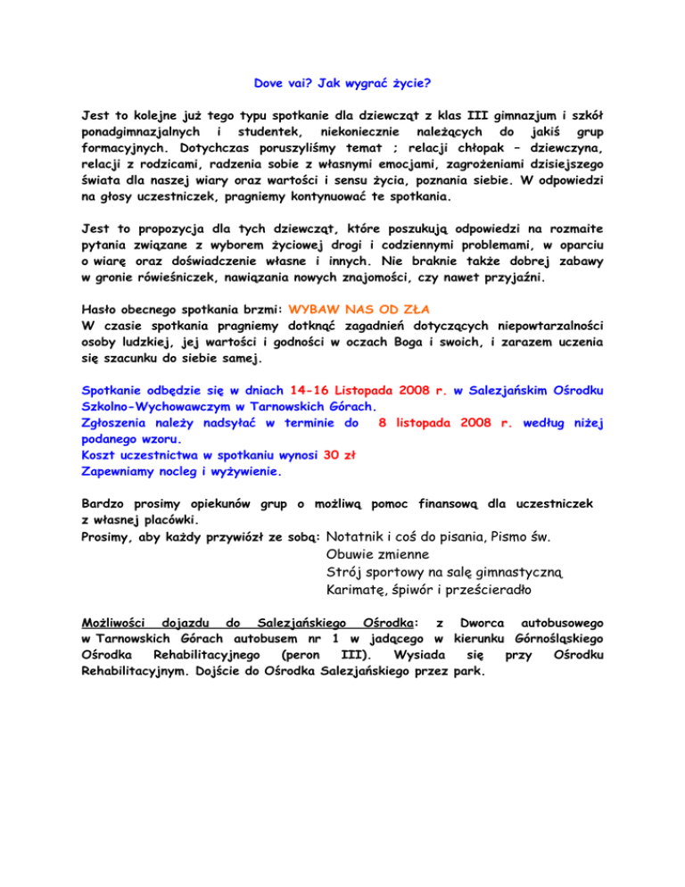 Dove vai? Jak wygrać życie? Jest to kolejne już tego typu spotkanie dla dziewcząt z klas III gimnazjum i szkół ponadgimnazjalnych i studentek, niekoniecznie należących do jakiś grup formacyjnych. Dotychczas poruszyliśmy temat ; relacji chłopak – dziewczyna, relacji z rodzicami, radzenia sobie z własnymi emocjami, zagrożeniami dzisiejszego świata dla naszej wiary oraz wartości i sensu życia, poznania siebie. W odpowiedzi na głosy uczestniczek, pragniemy kontynuować te spotkania. Jest to propozycja dla tych dziewcząt, które poszukują odpowiedzi na rozmaite pytania związane z wyborem życiowej drogi i codziennymi problemami, w oparciu o wiarę oraz doświadczenie własne i innych. Nie braknie także dobrej zabawy w gronie rówieśniczek, nawiązania nowych znajomości, czy nawet przyjaźni. Hasło obecnego spotkania brzmi: WYBAW NAS OD ZŁA W czasie spotkania pragniemy dotknąć zagadnień dotyczących niepowtarzalności osoby ludzkiej, jej wartości i godności w oczach Boga i swoich, i zarazem uczenia się szacunku do siebie samej. Spotkanie odbędzie się w dniach 14-16 Listopada 2008 r. w Salezjańskim Ośrodku Szkolno-Wychowawczym w Tarnowskich Górach. Zgłoszenia należy nadsyłać w terminie do 8 listopada 2008 r. według niżej podanego wzoru. Koszt uczestnictwa w spotkaniu wynosi 30 zł Zapewniamy nocleg i wyżywienie. Bardzo prosimy opiekunów grup o możliwą pomoc finansową dla uczestniczek z własnej placówki. Prosimy, aby każdy przywiózł ze sobą: Notatnik i coś do pisania, Pismo św. Obuwie zmienne Strój sportowy na salę gimnastyczną Karimatę, śpiwór i prześcieradło Możliwości dojazdu do Salezjańskiego Ośrodka: z Dworca autobusowego w Tarnowskich Górach autobusem nr 1 w jadącego w kierunku Górnośląskiego Ośrodka Rehabilitacyjnego (peron III). Wysiada się przy Ośrodku Rehabilitacyjnym. Dojście do Ośrodka Salezjańskiego przez park.