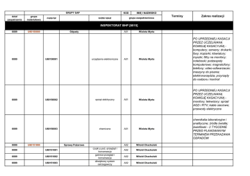 GRUPY SAP dział zaopatrzenia grupa materiałowa materiał KOD IMIĘ I NAZWISKO grupa zaopatrzeniowa krótki tekst Terminy Zakres realizacji INSPEKTORAT BHP [6015] 0009 U60150000 0009 sprzęt elektryczny U60150002 0009 U60150003 U60151000 A01 urządzenia elektroniczne U60150001 0009 0009 Odpady chemiczne Sprawy Pożarowe 0009 U60151001 0009 U60151002 0009 U60151003 czujki p.poż.-przegląd i konserwacja gaśnice-przegląd i konserwacja dźwiękowy system ostrzegawczy Wioleta Myrta Wioleta Myrta PO UPRZEDNIEJ KASACJI PRZEZ UCZELNIANĄ KOMISJĘ KASACYJNĄ komputery; serwery; drukarki; faxy; kopiarki; klawiatury; myszki; filtry na monitory; notebooki; podzespoły komputerowe; magnetofony; telefony; video-odtwarzacze; maszyny do pisania; elektronarzędzia; przyrządy do nadzoru i kontroli Wioleta Myrta PO UPRZEDNIEJ KASACJI PRZEZ UCZELNIANĄ KOMISJĘ KASACYJNĄ monitory; telewizory; sprzęt AGD i RTV; kable sieciowe; przewody elektryczne A01 Wioleta Myrta chemikalia laboratoryjne i analityczne; źródła światła; świetlówki - 2 TYGODNIE PRZED PLANOWANYM TERMINEM PRZEKAZANIA ODPADÓW A02 Witold Chachulski A02 Witold Chachulski A02 Witold Chachulski A02 Witold Chachulski A01 A01 0009 U60152000 Dokumenty tajne i niejawne-niszczenie A01 Wioleta Myrta 0009 U60153000 Deratyzacja i dezynfekcja A01 Wioleta Myrta A01 Wioleta Myrta A05 Bożena Golanka 0009 0009 U60153001 Akcja odszczurzania Pomiary czynników szkodliwych w środowisku pracy U60156000 0009 U60156001 0009 U60156002 0009 U60156003 0009 U60156004 0009 U60156005 czynniki niebezpieczne chemiczne czynniki niebezpieczne biologiczne czynniki niebezpieczne rakotwórcze czynniki niebezpieczne mutagenne czynniki niebezpieczne fizyczne A05 Bożena Golanka A05 Bożena Golanka A05 Bożena Golanka A05 Bożena Golanka A05 Bożena Golanka 0009 U60157000 Badania profilaktyczne pracowników A05 Bożena Golanka 0009 U60158000 Szkolenia BHP i PPOŻ A06 Marcin Robak 0009 U60159000 Kontrole sanitarne A01 Wioleta Myrta czynniki chemiczne; czynniki biologiczne; czynniki rakotwórcze; czynniki mutagenne; czynniki fizyczne - DO 15-GO KAŻDEGO MIESIĄCA BIBLIOTEKA UŚ [9700] 0006 0006 D97000001 0006 0006 0006 Gazety, dzienniki, czasopisma i magazyny D97000000 czasopisma zagraniczne czasopisma polskie D97000002 U97001000 Usługi bazy danych U97001001 bazy danych B01 Aldona GrabiańskaGórnik B01 Aldona GrabiańskaGórnik B07 Gabriela Kuźniewska B01 Aldona GrabiańskaGórnik B01 Aldona GrabiańskaGórnik polskie czasopisma ogólnodostępne 2 miesiące przed wymaganym terminem dostawy ujętym na wniosku) jednorazowy zakup poza przetargiem ogólnodostępne bazy danych, 0006 0006 konsorcja U97001002 U97002000 0006 Usługi introligatorskie oprawa książek i czasopism U97002001 0006 D970030M0 0006 D97004000 0006 D97005002 0006 U97005001 0006 U97005003 B01 Aldona GrabiańskaGórnik B03 Grażyna Grodecka B03 Grażyna Grodecka B04 Krystyna Dyszka B05 Janina Rabięcna B02 Barbara Kuś Dzierżawa książek, czasopism, mikrofilmów B02 Barbara Kuś Zakup usług bibliotecznych B02 Barbara Kuś Druki biblioteczne Zakup książek inwentaryzowanych Zakup kserokopii książek i czasopism 2 miesiące przed złożeniem akcesu do konsorcjum) jednorazowy zakup baz danych objętych prawami autorskimi, wykonywany dla doraźnie tworzonej grupy uczelni wyższych, poza prztargiem 2 miesiące przed złożeniem akcesu do konsorcjum) jednorazowy zakup baz danych objętych prawami autorskimi, wykonywany dla doraźnie tworzonej grupy uczelni wyższych, poza prztargiem rewersy do wypożyczalni; rewersy do czytelni; deklaracja czytelnika; karta biblioteczna tradycyjna; karta biblioteczna elektroniczna; dezyderatka; upomnienie; książka odwiedzin; naklejki z nadrukiem; fascykuły; karta katologowa DZIAŁ ROZLICZEŃ I USŁUG [6060] 0002 0002 Usługi porządkowoczystościowe U60600000 U60600001 C01 Sprzątanie pomieszczeń C01 Iwona Czopor Iwona Czopor 8 miesięcy przed wymaganą datą rozpoczęcia realizacji usługi 0002 U60600002 Specjalistyczne czyszczenie podłóg 0002 U60600003 Usługi mycia okien C02 Joanna Bruch 0002 U60600004 Usługi utrzym.czystości ter. zew. OA C02 Joanna Bruch 0002 U60600005 Usługi pralnicze C02 Joanna Bruch 0002 U60600006 Usługi czyszczenia stroi dla SZPIT C02 Joanna Bruch 0002 U60600007 Usługi czyszczenia wykładzin dywanowych C02 Joanna Bruch C02 Joanna Bruch C02 Joanna Bruch 0002 U60601000 0002 Usługi gastronomiczne Usługi-śniadania w DA3 lub Zajeździe U60601001 C01 Iwona Czopor 0002 U60601500 Usługi szewskie (naprawa obuwia dla SZPiT) C02 Joanna Bruch 0002 U60603000 Usługi najmu dóbr ruchomych C02 Joanna Bruch C02 Joanna Bruch C02 Joanna Bruch 0002 U60603001 0002 U60603002 Usługi najmu tablic posterowych Usługi najmu kostiumów 1 miesiąc przed wymaganą datą rozpoczęcia realizacji usługi 6 miesięcy przed wymaganą datą rozpoczęcia realizacji usługi 6 miesięcy przed wymaganą datą rozpoczęcia realizacji usługi 6 miesięcy przed wymaganą datą rozpoczęcia realizacji usługi 2 miesiące przed wymaganą datą rozpoczęcia realizacji usługi 2 miesiące przed wymaganą datą rozpoczęcia realizacji usługi 2 miesiące przed wymaganą datą rozpoczęcia realizacji usługi 4 miesiące przed wymaganą datą rozpoczęcia realizacji usługi 1 miesiąc przed wymaganą datą rozpoczęcia realizacji usługi 1 miesiąc przed wymaganą datą rozpoczęcia realizacji usługi 0002 U60603003 0002 U60603004 0002 Wynajem obiektów lub pomieszczeń U60604000 0002 U60604001 0002 U60604002 0002 Usługi najemu mat wycieraczkowych Usługi najemu kabin tłumaczeń symult. U60605000 Usługi najmu obiektów na cele sportowe Usługi najmu obiektów na cele dydakt. Usługi meblowe C02 Joanna Bruch C02 Joanna Bruch C02 Joanna Bruch C02 Joanna Bruch C02 Joanna Bruch C02 Joanna Bruch 2 miesiące przed wymaganą datą rozpoczęcia realizacji usługi 1 miesiąc przed wymaganą datą rozpoczęcia realizacji usługi 0002 U60605001 Usługi renowacji mebli C02 Joanna Bruch