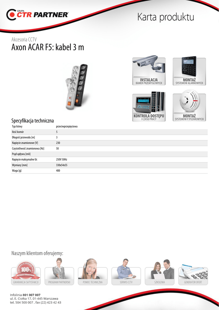 Akcesoria CCTV Axon ACAR F5: kabel 3 m INSTALACJA KAMER PRZEMYSŁOWYCH KONTROLA DOSTĘPU I CZASU PRACY Specyfikacja techniczna Typ listwy przeciwprzepięciowa Ilość komór 5 Długość przewodu [m] 3 Napięcie znamionowe [V] 230 Częstotliwość znamionowa [Hz] 50 MONTAŻ SYSTEMÓW ALARMOWYCH MONTAŻ SYSTEMÓW P.POŻAROWYCH Prąd upływu [mA] Napięcie maksymalne Uc 250V 50Hz Wymiary [mm] 330x54x55 Waga [g] 400 Naszym klientom oferujemy: GWARANCJA SATYSFAKCJI PROGRAM PARTNERSKI POMOC TECHNICZNA SERWIS CCTV SZKOLENIA GENERATOR OFERT