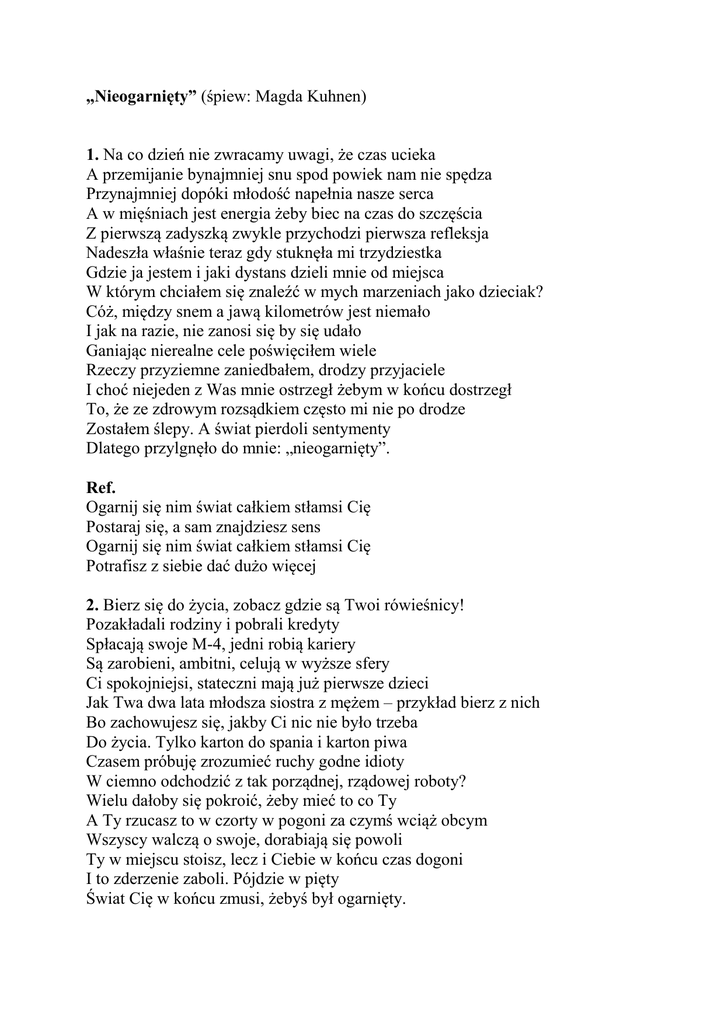 „Nieogarnięty” (śpiew: Magda Kuhnen) 1. Na co dzień nie zwracamy uwagi, że czas ucieka A przemijanie bynajmniej snu spod powiek nam nie spędza Przynajmniej dopóki młodość napełnia nasze serca A w mięśniach jest energia żeby biec na czas do szczęścia Z pierwszą zadyszką zwykle przychodzi pierwsza refleksja Nadeszła właśnie teraz gdy stuknęła mi trzydziestka Gdzie ja jestem i jaki dystans dzieli mnie od miejsca W którym chciałem się znaleźć w mych marzeniach jako dzieciak? Cóż, między snem a jawą kilometrów jest niemało I jak na razie, nie zanosi się by się udało Ganiając nierealne cele poświęciłem wiele Rzeczy przyziemne zaniedbałem, drodzy przyjaciele I choć niejeden z Was mnie ostrzegł żebym w końcu dostrzegł To, że ze zdrowym rozsądkiem często mi nie po drodze Zostałem ślepy. A świat pierdoli sentymenty Dlatego przylgnęło do mnie: „nieogarnięty”. Ref. Ogarnij się nim świat całkiem stłamsi Cię Postaraj się, a sam znajdziesz sens Ogarnij się nim świat całkiem stłamsi Cię Potrafisz z siebie dać dużo więcej 2. Bierz się do życia, zobacz gdzie są Twoi rówieśnicy! Pozakładali rodziny i pobrali kredyty Spłacają swoje M-4, jedni robią kariery Są zarobieni, ambitni, celują w wyższe sfery Ci spokojniejsi, stateczni mają już pierwsze dzieci Jak Twa dwa lata młodsza siostra z mężem – przykład bierz z nich Bo zachowujesz się, jakby Ci nic nie było trzeba Do życia. Tylko karton do spania i karton piwa Czasem próbuję zrozumieć ruchy godne idioty W ciemno odchodzić z tak porządnej, rządowej roboty? Wielu dałoby się pokroić, żeby mieć to co Ty A Ty rzucasz to w czorty w pogoni za czymś wciąż obcym Wszyscy walczą o swoje, dorabiają się powoli Ty w miejscu stoisz, lecz i Ciebie w końcu czas dogoni I to zderzenie zaboli. Pójdzie w pięty Świat Cię w końcu zmusi, żebyś był ogarnięty. Ref. Ogarnij się nim świat całkiem stłamsi Cię Postaraj się, a sam znajdziesz sens Ogarnij się nim świat całkiem stłamsi Cię Potrafisz z siebie dać dużo więcej 3. Gdy miotam się jak idiota próbując zadowolić Oczekiwania rodziny, przyjaciół i znajomych To nie wychodzi, bo nie da się zrobić wszystkim dobrze A tak po prawdzie to sam na tym wychodzę najgorzej „Ogarnij się” – tyle razy słyszałem już ten tekst, że Obojętne, za co się wezmę, to i tak będzie źle Próbuję funkcjonować w tej tak zwanej normalności Ale mi kurwa nie wychodzi, czas się z tym pogodzić Więc sorry, ale może nie być kredytu i dzieci Ani kariery, mogę być biedny a życie zleci Na chwilę obecną zamek z piasku z ziemią zrównałem Odbuduję go albo po swojemu albo wcale I nie zamierzam się tłumaczyć i przepraszać za nic Jak nie podoba się Wam ten plan, to Bóg z wami I do widzenia, życzcie mi szczęścia i powodzenia To tylko moje życie, ja Waszego nie chcę zmieniać. Ref. Ogarnij się nim świat całkiem stłamsi Cię Postaraj się, a sam znajdziesz sens Ogarnij się nim świat całkiem stłamsi Cię Potrafisz z siebie dać dużo więcej