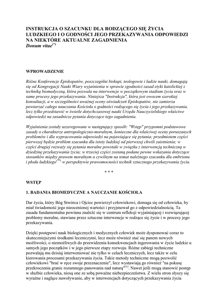 INSTRUKCJA O SZACUNKU DLA RODZĄCEGO SIĘ ŻYCIA LUDZKIEGO I O GODNOŚCI JEGO PRZEKAZYWANIA ODPOWIEDZI NA NIEKTÓRE AKTUALNE ZAGADNIENIA Donum vitae(*) WPROWADZENIE Różne Konferencje Episkopatów, poszczególni biskupi, teologowie i ludzie nauki, domagają się od Kongregacji Nauki Wiary wyjaśnienia w sprawie zgodności zasad etyki katolickiej z techniką biomedyczną, która pozwala na interwencje w początkowym stadium życia oraz w same procesy jego przekazywania. Niniejsza "Instrukcja", która jest owocem szerokiej konsultacji, a w szczególności uważnej oceny oświadczeń Episkopatów, nie zamierza powtarzać całego nauczania Kościoła o godności rodzącego się życia i jego przekazywania, lecz tylko przedstawić w świetle dotychczasowej nauki Urzędu Nauczycielskiego właściwe odpowiedzi na zasadnicze pytania dotyczące tego zagadnienia. Wyjaśnienia zostały uszeregowane w następujący sposób: "Wstęp" przypomni podstawowe zasady o charakterze antropologiczno-moralnym, konieczne dla właściwej oceny poruszanych problemów i dla wypracowania odpowiedzi na pojawiające się pytania; przedmiotem części pierwszej będzie problem szacunku dla istoty ludzkiej od pierwszej chwili zaistnienia; w części drugiej rozważy się pytania moralne powstałe w związku z interwencją techniczną w dziedzinę przekazywania życia; w trzeciej części zostaną podane pewne wskazania dotyczące stosunków między prawem moralnym a cywilnym na temat należnego szacunku dla embrionu i płodu ludzkiego(**) w perspektywie prawomocności technik sztucznego przekazywania życia. *** WSTĘP 1. BADANIA BIOMEDYCZNE A NAUCZANIE KOŚCIOŁA Dar życia, który Bóg Stwórca i Ojciec powierzył człowiekowi, domaga się od człowieka, by miał świadomość jego nieocenionej wartości i przyjmował go z odpowiedzialnością. Ta zasada fundamentalna powinna znaleźć się w centrum refleksji wyjaśniającej i rozwiązującej problemy moralne, stawiane przez sztuczne interwencje w rodzące się życie i w procesy jego przekazywania. Dzięki postępowi nauk biologicznych i medycznych człowiek może dysponować coraz to skuteczniejszymi środkami leczniczymi, lecz może również stać się panem nowych możliwości, o niemożliwych do przewidzenia konsekwencjach ingerowania w życie ludzkie u samych jego początków i w jego pierwsze etapy rozwoju. Różne zabiegi techniczne pozwalają mu dzisiaj interweniować nie tylko w celach leczniczych, lecz także w celu kierowania procesami przekazywania życia. Takie metody techniczne mogą pozwolić człowiekowi "brać w ręce swoje przeznaczenie", lecz wystawiają go również "na pokusę przekroczenia granic rozumnego panowania nad naturą"(1). Nawet jeśli mogą stanowić postęp w służbie człowieka, niosą one ze sobą poważne niebezpieczeństwa. Z wielu stron słyszy się wyraźne i naglące nawoływanie, aby w interwencjach dotyczących przekazywania życia zostały zachowane prawa i wartości osoby ludzkiej. Żądania wyjaśnienia i wskazania nie pochodzą tylko od wierzących, lecz także od tych wszystkich, którzy uznają Kościół za "rzeczoznawcę w sprawach ludzkich"(2), pełniącego misję w służbie "cywilizacji miłości"(3) i życia. Urząd Nauczycielski Kościoła nie zabiera głosu w imię szczególnej kompetencji w dziedzinie nauk doświadczalnych, lecz, uwzględniwszy dane badań naukowych i technicznych, pragnie przedstawić, na mocy własnej misji ewangelicznej i swojego urzędu apostolskiego, naukę moralną odpowiadającą godności osoby i jej integralnemu powołaniu, wykładając kryteria osądu moralnego o stosowaniu badań naukowych i technicznych, w szczególności do tego, co odnosi się do życia ludzkiego i jego początków. Tymi kryteriami są szacunek, obrona i rozwój człowieka, jego "pierwszorzędne i podstawowe prawo" do życia(4), jego godność jako osoby, obdarzonej duszą rozumną i odpowiedzialnością moralną(5) oraz powołanej do uszczęśliwiającej komunii z Bogiem. Interwencja Kościoła również i w tę dziedzinę jest motywowana miłością, którą Kościół jest dłużny człowiekowi pomagając mu w rozpoznaniu i poszanowaniu jego praw i obowiązków. Miłość ta karmi się u źródeł miłości Chrystusa: kontemplując misterium Słowa Wcielonego, Kościół poznaje również "misterium człowieka"(6); głosząc Ewangelię zbawienia, objawia człowiekowi jego godność i zaprasza go do odkrycia w pełni prawdy o sobie. Tak więc Kościół przedstawia prawo Boże, by realizować dzieło prawdy i wyzwolenia. Jest prawdą, że Bóg z dobroci daje ludziom swoje przykazania i łaskę dla ich zachowania, z dobroci również ofiaruje zawsze wszystkim ludziom przebaczenie, by pomóc im wytrwać na tej drodze. Chrystus lituje się nad naszymi słabościami. On jest naszym Stwórcą i Zbawicielem. Oby Jego Duch otworzył nasze serca na dar Bożego pokoju i na zrozumienie Jego przykazań. 2. WIEDZA I TECHNIKA W SŁUŻBIE OSOBY LUDZKIEJ Bóg stworzył człowieka na swój obraz i podobieństwo: "stworzył mężczyznę i niewiastę" (Rdz 1, 27), powierzając im zadanie "panowania nad ziemią" (Rdz 1, 28). Podstawowe badania naukowe, jak i badania stosowane stanowią istotny wyraz owego panowania człowieka nad stworzeniem. Wiedza i technika, drogocenne środki człowieka, kiedy są użyte w jego służbie i przyczyniają się do integralnego i dobroczynnego rozwoju wszystkich, nie mogą jednak same z siebie wykazać sensu istnienia i postępu ludzkiego. Będąc skierowane do człowieka, od którego biorą początek oraz wzrost i dzięki któremu się rozwijają, czerpią z osoby i jej moralnych wartości wskazania co do swojej celowości oraz świadomość swoich granic. Dlatego byłoby czymś złudnym domagać się neutralności moralnej badań naukowych i ich zastosowań; z drugiej zaś strony nie można wyprowadzać kryteriów postępowania z prostej skuteczności technicznej, z pożyteczności, jaką 