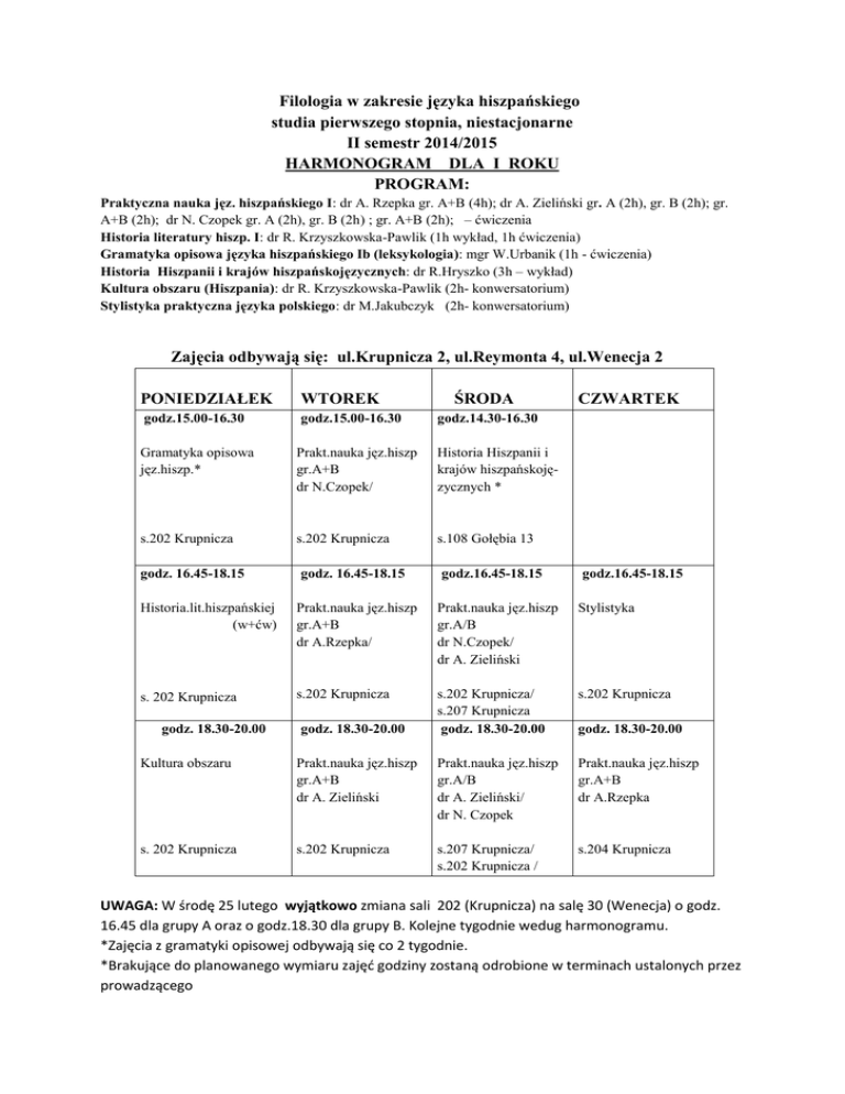 Filologia w zakresie języka hiszpańskiego studia pierwszego stopnia, niestacjonarne II semestr 2014/2015 HARMONOGRAM DLA I ROKU PROGRAM: Praktyczna nauka jęz. hiszpańskiego I: dr A. Rzepka gr. A+B (4h); dr A. Zieliński gr. A (2h), gr. B (2h); gr. A+B (2h); dr N. Czopek gr. A (2h), gr. B (2h) ; gr. A+B (2h); – ćwiczenia Historia literatury hiszp. I: dr R. Krzyszkowska-Pawlik (1h wykład, 1h ćwiczenia) Gramatyka opisowa języka hiszpańskiego Ib (leksykologia): mgr W.Urbanik (1h - ćwiczenia) Historia Hiszpanii i krajów hiszpańskojęzycznych: dr R.Hryszko (3h – wykład) Kultura obszaru (Hiszpania): dr R. Krzyszkowska-Pawlik (2h- konwersatorium) Stylistyka praktyczna języka polskiego: dr M.Jakubczyk (2h- konwersatorium) Zajęcia odbywają się: ul.Krupnicza 2, ul.Reymonta 4, ul.Wenecja 2 PONIEDZIAŁEK WTOREK godz.15.00-16.30 godz.15.00-16.30 ŚRODA godz.14.30-16.30 Gramatyka opisowa jęz.hiszp.* Prakt.nauka jęz.hiszp gr.A+B dr N.Czopek/ Historia Hiszpanii i krajów hiszpańskojęzycznych * s.202 Krupnicza s.202 Krupnicza s.108 Gołębia 13 godz. 16.45-18.15 godz. 16.45-18.15 CZWARTEK godz.16.45-18.15 godz.16.45-18.15 Historia.lit.hiszpańskiej (w+ćw) Prakt.nauka jęz.hiszp gr.A+B dr A.Rzepka/ Prakt.nauka jęz.hiszp gr.A/B dr N.Czopek/ dr A. Zieliński Stylistyka s. 202 Krupnicza s.202 Krupnicza s.202 Krupnicza/ s.207 Krupnicza godz. 18.30-20.00 s.202 Krupnicza godz. 18.30-20.00 godz. 18.30-20.00 godz. 18.30-20.00 Kultura obszaru Prakt.nauka jęz.hiszp gr.A+B dr A. Zieliński Prakt.nauka jęz.hiszp gr.A/B dr A. Zieliński/ dr N. Czopek Prakt.nauka jęz.hiszp gr.A+B dr A.Rzepka s. 202 Krupnicza s.202 Krupnicza s.207 Krupnicza/ s.202 Krupnicza / s.204 Krupnicza UWAGA: W środę 25 lutego wyjątkowo zmiana sali 202 (Krupnicza) na salę 30 (Wenecja) o godz. 16.45 dla grupy A oraz o godz.18.30 dla grupy B. Kolejne tygodnie wedug harmonogramu. *Zajęcia z gramatyki opisowej odbywają się co 2 tygodnie. *Brakujące do planowanego wymiaru zajęć godziny zostaną odrobione w terminach ustalonych przez prowadzącego Filologia w zakresie języka hiszpańskiego studia pierwszego stopnia, niestacjonarne II semestr 2014/2015 HARMONOGRAM DLA II ROKU PROGRAM: Praktyczna nauka jęz. hiszpańskiegoII : dr M. Jędrusiak gr. A+B (2h), mgr S. Balches A+B (4h), mgr J. Vidal – pisanie gr. A+B (2h) - ćwiczenia Praktyczna nauka II jęz. romańskiego I: francuski: mgr E. Krakowska-Krzemińska (4h - ćwiczenia) Historia lit. hiszpańskiej II: dr R. Krzyszkowska-Pawlik (1h- wykład, 2h - ćwiczenia ) Historia lit. latynoamerykańskiej: dr hab. E.Nawrocka (2h - wykład) Gramatyka opisowa języka hiszpańskiego IIb (składnia): mgr M.Jędrusiak (1h - wykład, 1h - ćwiczenia) Gramatyka kontrastywna pl/hiszp.: dr A.Zieliński (1h - wykład) Tłumaczenia pisemne (literackie): dr P. Fornelski (2h- ćwiczenia) Podstawy łaciny: mgr J. Chmielewska (2h - ćwiczenia) Zajęcia odbywają się: ul.Krupnicza 2, ul.Reymonta 4, ul.Wenecja 2 PONIEDZIAŁEK WTOREK godz.15.00-16.30 godz.15.00-16.30 ŚRODA CZWARTEK godz.15.00-16.30 godz.15.00-16.30 Gramatyka opisowa Prakt.nauka jęz.hiszp. gr.A+B dr M. Jędrusiak Gram.kontrastywna/ Tłumacz. pisemne Historia lit.hiszp. (w)* s.201 Krupnicza s.529 Reymonta s. 207 Krupnicza godz. 16.45-18.15 godz. 16.45-18.15 godz.16.45-18.15 s.529 Reymonta godz.16.45-18.15 Historia lit.latynoamer. Prakt.nauka jęz. franc. Historia lit.hiszp.(ćw ) Prakt.nauka jęz. franc. s.201 Krupnicza s.531 Reymonta godz. 18.30-20.00 godz. 18.30-20.00 s.207 Krupnicza s.529 Reymonta godz. 18.30-20.00 godz. 18.30-20.00 Prakt.nauka jęz.hiszp. gr.A+B mgr J.Vidal . Prakt.nauka jęz.hiszp. gr.A+B mgr S. Balches Prakt.nauka jęz.hiszp. gr.A+B mgr S.Balches Podstawy łaciny s.201 Krupnicza s.531 Reymonta s.13 Wenecja s.529 Reymonta *Zajęcia z historii literatury hiszpańskiej zaplanowane są na pierwszych 7 tygodni, a na drugą połowę semestru - wykłady z gramatyki kontrastywnej. Filologia w zakresie języka hiszpańskiego studia pierwszego stopnia, niestacjonarne II semestr 2014/2015 HARMONOGRAM DLA III ROKU PROGRAM: Praktyczna nauka jęz. hiszpańskiego III: dr M. Jędrusiak (2h), mgr S. Balches (4h) - ćwiczenia Praktyczna nauka II jęz. romańskiego II: francuski: mgr B. Grzywacz (4h- ćwiczenia), włoski: mgr L. Palmarini (4h- ćwiczenia) Historia literatury hiszpańskiej III: dr P. Fornelski (1h- wykład, 2h -ćwiczenia) Historia literatury latynoamerykańskiej: dr hab. E. Nawrocka (2h -ćwiczenia) Tłumaczenia pisemne: mgr S. Balches (2h - ćwiczenia), dr B.Wisłocka (2h -ćwiczenia) Seminarium licencjackie językoznawcze: dr N. Czopek (2h - konwersatorium) Seminarium licencjackie literackie: dr P. Fornelski (2h - konwersatorium) Zajęcia odbywają się: ul.Krupnicza 2, ul.Reymonta 4, ul.Wenecja 2 PONIEDZIAŁEK godz.15.00-16.30 WTOREK godz.15.00-16.30 ŚRODA CZWARTEK godz.15.00-16.30 godz.15.00-16.30 Hist.lit.latynoameryk. Prakt.nauka jęz.hiszp mgr S.Balches Sem.lic.literackie Prakt.nauka jęz.hiszp. dr M.Jędrusiak s.207 Krupnicza s.531 Reymonta s.30 Wenecja s. 530 Reymonta godz. 16.45-18.15 godz. 16.45-18.15 godz.16.45-18.15 godz.16.45-18.15 Tłumaczenia pisemne mgr S.Balches Sem.lic.językozn. Hist.lit.hiszpańskiej (ćw.) Prakt.nauka jęz.fr./ prakt.nauka jęz.wł. s.207 Krupnicza s.25 Wenecja s.13 Wenecja s.13 Wenecja/ s.506 Reymonta godz. 18.30-19.15 godz. 18.30-20.00 godz. 18.30-20.00 godz. 18.30-20.00 Prakt.nauka jęz.hiszp mgr S.Balches Prakt.nauka jęz.fr./ prakt.nauka jęz.wł. Hist.lit.hiszpańskiej Tłumaczenia pisemne (ćw.) dr B.Wisłocka s.207 Krupnicza s.13 /s. 2 Wenecja s.26 Wenecja *Zajęcia odbywają się co 2 tygodnie s. 531 Reymonta