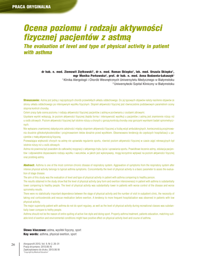PRACA ORYGINALNA Ocena poziomu i rodzaju aktywności fizycznej pacjentów z astmą The evaluation of level and type of physical activity in patient with asthma dr hab. n. med. Ziemowit Ziętkowski1, dr n. med. Roman Skiepko1, lek. med. Urszula Skiepko1, mgr Monika Perkowska2, prof. dr hab. n. med. Anna Bodzenta-Łukaszyk1 1 Klinika Alergologii i Chorób Wewnętrznych Uniwersytetu Medycznego w Białymstoku 2 Uniwersytecki Szpital Kliniczny w Białymstoku Streszczenie: Astma jest jedną z najczęstszych chorób przewlekłych układu oddechowego. Do jej typowych objawów należy nasilenie objawów ze strony układu oddechowego po intensywnym wysiłku fizycznym. Stopień aktywności fizycznej jest równocześnie podstawowym parametrem oceny stopnia kontroli choroby. Celem pracy była ocena poziomu i rodzaju aktywności fizycznej pacjentów z astmą w porównaniu z osobami zdrowymi. Uzyskane wyniki wskazują, że poziom aktywności fizycznej (każda forma i intensywność wysiłku) u pacjentów z astmą jest znamiennie niższy niż u osób zdrowych. Poziom aktywności fizycznej był istotnie niższy u chorych z gorszą kontrolą choroby oraz gorszymi wynikami badań spirometrycznych. Nie wykazano znamiennej statystycznie zależności między stopniem aktywności fizycznej a liczbą wizyt ambulatoryjnych, koniecznością przyjmowania doustnie glikokortykosteroidów i przyjmowaniem leków doraźnie przed wysiłkiem. Obserwowano tendencję do częstszych hospitalizacji u pacjentów z małą aktywnością fizyczną. Przeważająca większość chorych na astmę nie uprawiała regularnie sportu, również poziom aktywności fizycznej w czasie zajęć rekreacyjnych był istotnie niższy niż u osób zdrowych. Astma nie powinna być powodem do całkowitej rezygnacji z aktywnego trybu życia i uprawiania sportu. Prawidłowe leczenie astmy, edukacja pacjentów i odpowiednie dopasowanie rodzaju wysiłku i warunków, w jakich jest wykonywany, mogą korzystnie wpływać na poziom aktywności fizycznej oraz przebieg astmy. Abstract: Asthma is one of the most common chronic disease of respiratory system. Aggravation of symptoms from the respiratory system after intense physical activity belongs to typical asthma symptoms. Concomitantly the level of physical activity is a basic parameter to asses the evaluation of stage disease. The aim of this study was the evaluation of level and type of physical activity in patient with asthma compering to healthy person. The results obtained in the study show that the level of physical activity (any form and exertion intensiveness) in patient with asthma is substantially lower compering to healthy people. The level of physical activity was substantially lower in patients with worse control of the disease and worse spirometry results. There were no statistically important dependence between the stage of physical activity and the number of visit in outpatient clinic, the necessity of taking oral corticosteroids and rescue medication before exertion. A tendency to more frequent hospitalization was observed in patients with low physical activity. The major superiority patient with asthma do not do sport regulary, as well as the level of physical activity during recreational classes was substantially lower compare to helthy people. Asthma should not be the reason of entire quiting of active live style and doing sport. Properly asthma treatment, patients education, matching suitable kind of exertion and environmental conditions might have positive effect on physical activity level and course of asthma. Słowa kluczowe: astma, wysiłek fizyczny, sport Key words: asthma, physical exertion, sport 26 Alergoprofil 2013, Vol. 9, Nr 2, 26-31 Pracę otrzymano: 2013.06.16 Zaakceptowano do druku: 2013.06.18 “Copyright by Medical Education” PRACA ORYGINALNA Wstęp Astma należy do najczęstszych chorób przewlekłych układu oddechowego. Choroba ta może istotnie wpływać na funkcjonowanie pacjenta w społeczeństwie, jego aktywność, uprawianie sportu, zdolność do prowadzenia aktywnego trybu życia. Nasilenie objawów ze strony układu oddechowego po intensywnym wysiłku fizycznym należy do typowych objawów astmy. Równocześnie stopień aktywności fizycznej jest podstawowym parametrem oceny stopnia kontroli choroby [1]. U chorych na astmę typowy jest przemijający wzrost oporu dróg oddechowych w następstwie intensywnego wysiłku. Duszność powysiłkowa pojawia się u 50–80% chorych na astmę. Pomimo dużego znaczenia klinicznego patofizjologia powysiłkowego skurczu oskrzeli nie została w pełni poznana i budzi wiele wątpliwości [2]. W patomechanizmie tego zjawiska decydujące znaczenie może mieć wynikający z utraty wody wzrost osmolarności błony śluzowej, który powoduje uwolnienie mediatorów z komórek tucznych, skurcz mięśni gładkich oraz uszkodzenie komórek nabłonkowych [3]. Coraz więcej danych wskazuje, że powysiłkowy skurcz oskrzeli związany jest z procesem zapalnym leżącym u podłoża astmy i może mieć wpływ na stopień jego nasilenia [4]. Przekonanie pacjentów, że z powodu astmy nie są zdolni do prowadzenia aktywnego trybu życia oraz obawa przed występowaniem i nasileniem powysiłkowych objawów bardzo często prowadzą do ograniczenia przez nich aktywności fizycznej, co niekorzystnie wpływa na ich ogólny stan zdrowia oraz wydolność układu oddechowego. Celem pracy była ocena poziomu i rodzaju aktywności fizycznej pacjentów z astmą w porównaniu z osobami zdrowymi. Podjęto również próbę oceny zależności pomiędzy stopniem kontroli choroby, liczbą wizyt ambulatoryjnych, hospitalizacji, ciężkich zaostrzeń i stosowanych leków doraźnych oraz wartości spirometrycznych a poziomem aktywności fizycznej chorych. Materiał i metody Badanie prowadzono w Klinice Alergologii i Chorób Wewnętrznych Uniwersyteckiego Szpitala Klinicznego w Białymstoku od czerwca 2012 r. do kwietnia 2013 r. W obserwacji tej wzięło udzia