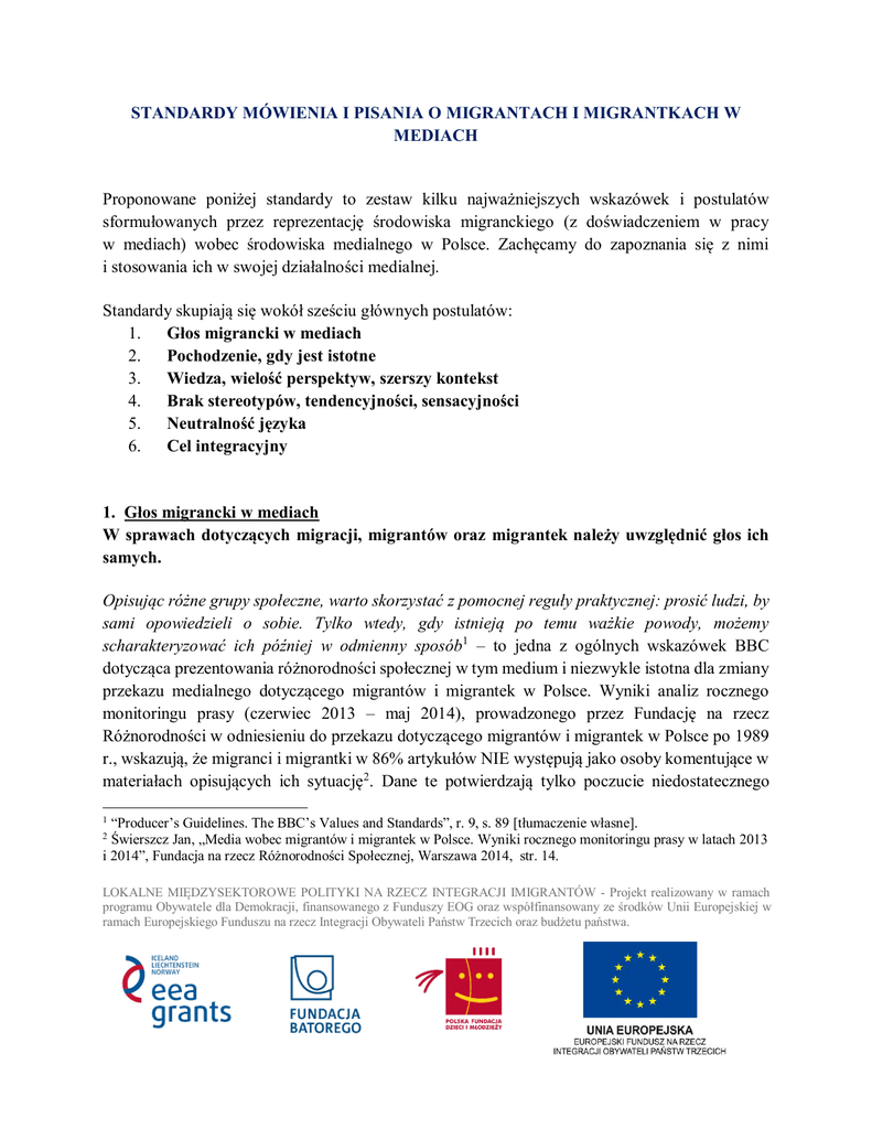 STANDARDY MÓWIENIA I PISANIA O MIGRANTACH I MIGRANTKACH W MEDIACH Proponowane poniżej standardy to zestaw kilku najważniejszych wskazówek i postulatów sformułowanych przez reprezentację środowiska migranckiego (z doświadczeniem w pracy w mediach) wobec środowiska medialnego w Polsce. Zachęcamy do zapoznania się z nimi i stosowania ich w swojej działalności medialnej. Standardy skupiają się wokół sześciu głównych postulatów: 1. Głos migrancki w mediach 2. Pochodzenie, gdy jest istotne 3. Wiedza, wielość perspektyw, szerszy kontekst 4. Brak stereotypów, tendencyjności, sensacyjności 5. Neutralność języka 6. Cel integracyjny 1. Głos migrancki w mediach W sprawach dotyczących migracji, migrantów oraz migrantek należy uwzględnić głos ich samych. Opisując różne grupy społeczne, warto skorzystać z pomocnej reguły praktycznej: prosić ludzi, by sami opowiedzieli o sobie. Tylko wtedy, gdy istnieją po temu ważkie powody, możemy scharakteryzować ich później w odmienny sposób1 – to jedna z ogólnych wskazówek BBC dotycząca prezentowania różnorodności społecznej w tym medium i niezwykle istotna dla zmiany przekazu medialnego dotyczącego migrantów i migrantek w Polsce. Wyniki analiz rocznego monitoringu prasy (czerwiec 2013 – maj 2014), prowadzonego przez Fundację na rzecz Różnorodności w odniesieniu do przekazu dotyczącego migrantów i migrantek w Polsce po 1989 r., wskazują, że migranci i migrantki w 86% artykułów NIE występują jako osoby komentujące w materiałach opisujących ich sytuację 2. Dane te potwierdzają tylko poczucie niedostatecznego “Producer’s Guidelines. The BBC’s Values and Standards”, r. 9, s. 89 [tłumaczenie własne]. Świerszcz Jan, „Media wobec migrantów i migrantek w Polsce. Wyniki rocznego monitoringu prasy w latach 2013 i 2014”, Fundacja na rzecz Różnorodności Społecznej, Warszawa 2014, str. 14. 1 2 LOKALNE MIĘDZYSEKTOROWE POLITYKI NA RZECZ INTEGRACJI IMIGRANTÓW - Projekt realizowany w ramach programu Obywatele dla Demokracji, finansowanego z Funduszy EOG oraz współfinansowany ze środków Unii Europejskiej w ramach Europejskiego Funduszu na rzecz Integracji Obywateli Państw Trzecich oraz budżetu państwa. reprezentowania głosu migranckiego w mediach w Polsce. Jest to tym bardziej znaczące, że głos ten nie jest przyznawany przez media głównego nurtu migrantom i migrantkom w sytuacji, gdy przekaz dotyczy właśnie ich. Dlaczego to jest ważne? ● Wprowadzenie głosu migranckiego do materiału medialnego zapewnia ujęcie tematu z wielu perspektyw, a tym samym wzmacnia rzetelność i obiektywność przekazu. ● Informowanie o współczesnym świecie oznacza informowanie o jego różnorodności i wymaga zebrania głosu różnych stron istotnych dla materiału – perspektywa urzędnicza to tylko jedna ze stron. ● Umożliwia się danym grupom współtworzenie własnego wizerunku w społeczeństwie (pomyśl o emocjach, które wywołują niektóre przekazy o Polsce, Polakach i Polkach w mediach zagranicznych). ● Wzmacnia się równy udział w przestrzeni publicznej grup niedostatecznie reprezentowanych. ● Osoby bez doświadczenia migracyjnego, występujące w roli eksperckiej w takich materiałach, nie zawsze rozumieją specyfikę kulturową danych miejsc lub grup, o których się wypowiadają. 2. Pochodzenie, gdy jest istotne O cechach związanych z pochodzeniem (etniczność, narodowość, kolor skóry) i religią można wspominać tylko wtedy, gdy są one istotne dla przekazu. Nie mówimy, że cechy takie jak etniczność, narodowość, kolor skóry czy religia w ogóle nie mają znaczenia, ale warto się zastanowić, jaka jest ich wartość informacyjna dla danego tematu, materiału. Czy określona informacja jest informacją ze względu na samo wydarzenie czy ze względu na cechy osób, które są w to wydarzenie zaangażowane? Czy konieczne jest eksponowanie różnicy w przypadku mniejszości – podkreślanie pochodzenia innego niż polskie, koloru skóry innego niż biały, wyznania, gdy nie jest rzymsko-katolickie…? Cechy większości wydają się przezroczyste – (…) zapytaj się za każdym razem: czy powiedziałbyś, czy powiedziałabyś biała lub biały w podobnej sytuacji?3. 3 “Producer’s Guidelines. The BBC’s Values and Standards”, r. 9, s. 90 [tłumaczenie własne]. LOKALNE MIĘDZYSEKTOROWE POLITYKI NA RZECZ INTEGRACJI IMIGRANTÓW - Projekt realizowany w ramach programu Obywatele dla Demokracji, finansowanego z Funduszy EOG oraz współfinansowany ze środków Unii Europejskiej w ramach Europejskiego Funduszu na rzecz Integracji Obywateli Państw Trzecich oraz budżetu państwa. Dlaczego to jest ważne? ● Akcentując cechę związaną z pochodzeniem w danym kontekście, wpływasz na wizerunek grupy, o której piszesz lub mówisz, a którą dana osoba reprezentuje. Pamiętaj, że ludzie są jednostkami z indywidualnymi cechami. ● Ekspozycja danej cechy różnicującej, np. koloru skóry, wskazuje, że dana różnica ma znaczenie, tym samym możesz przyczyniać się do utrzymywania postaw różnicujących ludzi ze względu na pochodzenie czy religię. 3. Wiedza, wielość perspektyw, szerszy kontekst Przekaz dotyczący migrantów i migrantek należy poprzeć wiedzą, wielością perspektyw, umieszczać w szerszym kontekście opisywanego zjawiska. W przypadku tematów, które nie są dobrze znane większości społeczeństwa, jak tematyka migracji, na mediach spoczywa tym większa odpowiedzialność za przekaz i jego rzetelność. Selekcja i weryfikacja informacji i źródeł do materiału ma zatem szczególne znaczenie, by przekaz informacyjny został odpowiednio rozumiany. Jeżeli piszesz lub mówisz o ludziach i miejscach poza Polską czy poza Europą, pamiętaj, że to może mieć wpływ na postrzeganie osób i grup, które z tymi miejscami są kojarzone4. Kiedy piszesz lub mówisz o danych grupach migrantów i migrantek, uważaj na wła