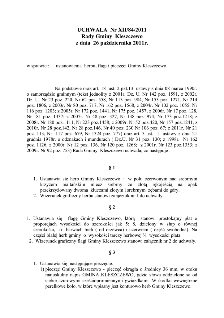 UCHWAŁA Nr XII/84/2011 Rady Gminy Kleszczewo z dnia 26 października 2011r. w sprawie : ustanowienia herbu, flagi i pieczęci Gminy Kleszczewo. Na podstawie oraz art. 18 ust. 2 pkt.13 ustawy z dnia 08 marca 1990r. o samorządzie gminnym (tekst jednolity z 2001r. Dz. U. Nr 142 poz. 1591, z 2002r. Dz. U. Nr 23 poz. 220, Nr 62 poz. 558, Nr 113 poz. 984, Nr 153 poz. 1271, Nr 214 poz. 1806, z 2003r. Nr 80 poz. 717, Nr 162 poz. 1568, z 2004r. Nr 102 poz. 1055, Nr 116 poz. 1203; z 2005r. Nr 172 poz. 1441, Nr 175 poz. 1457; z 2006r. Nr 17 poz. 128, Nr 181 poz. 1337; z 2007r. Nr 48 poz. 327, Nr 138 poz. 974, Nr 173 poz.1218; z 2008r. Nr 180 poz.1111, Nr 223 poz.1458; z 2009r. Nr 52 poz.420, Nr 157 poz.1241; z 2010r. Nr 28 poz.142, Nr 28 poz.146, Nr 40 poz. 230 Nr 106 poz. 67; z 2011r. Nr 21 poz. 113, Nr 117 poz. 679, Nr 1324 poz. 777) oraz art. 3 ust. 1 ustawy z dnia 21 grudnia 1978r. o odznakach i mundurach ( Dz.U. Nr 31 poz. 130; z 1998r. Nr 162 poz. 1126, z 2000r. Nr 12 poz. 136, Nr 120 poz. 1268; z 2001r. Nr 123 poz.1353; z 2009r. Nr 92 poz. 753) Rada Gminy Kleszczewo uchwala, co następuje : §1 1. Ustanawia się herb Gminy Kleszczewo : w polu czerwonym nad srebrnym krzyżem maltańskim miecz srebrny ze złotą rękojeścią na opak przekrzyżowany dwoma kluczami złotym i srebrnym zębami do góry. 2. Wizerunek graficzny herbu stanowi załącznik nr 1 do uchwały. §2 1. Ustanawia się flagę Gminy Kleszczewo, którą stanowi prostokątny płat o proporcjach wysokości do szerokości jak 5: 8, dzielony w słup o równej szerokości, o barwach bieli ( od drzewca) i czerwieni ( część swobodna). Na części białej herb gminy o wysokości tarczy herbowej ¾ wysokości płata. 2. Wizerunek graficzny flagi Gminy Kleszczewo stanowi załącznik nr 2 do uchwały. §3 1. Ustanawia się następujące pieczęcie: 1) pieczęć Gminy Kleszczewo - pieczęć okrągła o średnicy 36 mm, w otoku majuskulny napis GMINA KLESZCZEWO, gdzie słowa oddzielone są od siebie ażurowymi sześciopromiennymi gwiazdkami. W środku wewnętrzne perełkowe koło, w które wpisany jest konturowo herb Gminy Kleszczewo. 2) pieczęć Wójta Gminy Kleszczewo - pieczęć okrągła o średnicy 36 mm, w otoku majuskulny napis WÓJT GMINY KLESZCZEWO, gdzie słowa oddzielone są od siebie ażurowymi sześciopromiennymi gwiazdkami. W środku wewnętrzne perełkowe koło, w które wpisany jest konturowo herb Gminy Kleszczewo. 3) pieczęć Urzędu Gminy Kleszczewo - pieczęć okrągła o średnicy 36 mm, w otoku majuskulny napis URZĄD GMINY KLESZCZEWO, gdzie słowa oddzielone są od siebie ażurowymi sześciopromiennymi gwiazdkami. W środku wewnętrzne perełkowe koło, w które wpisany jest konturowo herb Gminy Kleszczewo. 2. Wzory pieczęci, o których mowa w ust.1 zawierają załączniki: a) wzór pieczęci Gmina Kleszczewo – załącznik nr 3 do uchwały, b) wzór pieczęci Wójt Gminy Kleszczewo – załącznik nr 4 do uchwały, c) wzór pieczęci Urząd Gminy Kleszczewo – załącznik nr 5 do uchwały. §4 Wykonanie uchwały powierza się Wójtowi Gminy. §5 Uchwała wchodzi w życie po upływie 14 dni od dnia jej ogłoszenia w Dzienniku Urzędowym Województwa Wielkopolskiego. Przewodniczący Rady Gminy Henryk Lesiński UZASADNIENIE do Uchwały Nr XII/84/2011 Rady Gminy Kleszczewo z dnia 26 października 2011r. Korzystając z kompetencji Rady Gminy wynikających z art. 18 ust. 2 pkt 13 ustawy z dnia 08 marca 1990r. o samorządzie gminnym ( tekst jednolity z 2001 r. Dz.U. Nr 142 poz. 1591 ze zmianami), ustanawia się herb Gminy, flagę i pieczęcie Gminy Kleszczewo. Projekt herbu sporządzony został przez Pana Roberta Szydlika. Uzasadnienie herbu GODŁO GÓRNE: Miecz na opak przekrzyżowany dwoma kluczami złotym i srebrnym zębami do góry nawiązuje bezpośrednio do godła kapituły poznańskiej. W ikonografii i heraldyce są to symbole śśw. Piotra i Pawła. Ci dwaj apostołowie są patronami kapituły poznańskiej, jako że pierwszym biskupstwem na ziemiach polskich było właśnie biskupstwo misyjne w Poznaniu powołane w roku 968 do życia bullą papieża Jana XIII1. To pierwsze biskupstwo obejmowało całe państwo Mieszka I i nie podlegało żadnemu metropolicie, a bezpośrednio Stolicy Apostolskiej. Tym też dyktowany był wybór patronów – śśw. Piotra i Pawła2. Umieszczenie symboli patronów kapituły poznańskiej w herbie Gminy Kleszczewo wiąże się ściśle z tym, że w skład ziemskich dóbr kapituły poznańskiej w różnym okresie wchodziła większa część obszaru dzisiejszej gminy3 – na pewno miejscowości: Śródka (1383-1793), Tanibórz (12924-1793), Krzyżowniki, Tulce (ok. 1140 – XIV w.), Markowice (1388-1793), Nagradowice (1268-1793)5 i Krerowo (1287-1793)6. Nie o każdej z wymienionych miejscowości zachowały się dokładniejsze dane, ale wiadomo, że Śródkę w roku 1383 r. biskup poznański Jan przekazał wraz z innymi włościami proboszczom katedralnym (to jest: kapitule). Wspomina o tym m.in. Słownik Geograficzny 1 S. Trawkowski: Początki Kościoła w Polsce za panowania Mieszka I, (w:) Civitas Schinesghe. Mieszko I i początki państwa polskiego. Poznań - Gniezno 2004, s. 49-70 2 W. Abraham, Organizacja kościoła w Polsce do połowy wieku XII, Poznań 1962 3 W. Sobisiak, Rozwój latyfundium biskupstwa poznańskiego w XVI do XVIII wieku, Poznań 1960. 4 Data pierwsza podawana w nawiasie oznacza nie pocz ątek przynależności do dóbr kapituły poznańskiej, a pierwszą wzmiankę potwierdzającą taki stan rzeczy w źródłach. 5 J. Nowacki, Dzieje archidiecezji poznańskiej, t. II, Poznań 1959. 6 W 1793 r. w związku z zajęciem omawianego terenu przez Prusy (II rozbiór) dobra kościelne zostały skonfiskowane i przeszły na skarb pruski. Królestwa Polskiego, gdzie napisano: Środka była własnością kapituły poznańskiej; zabrana przez rząd pruski, wcielona do domeny Swarzędz.7 Z kolei Tanibórz w roku 1292 wymieniany jest w składzie dóbr kapitulnych8 i takż