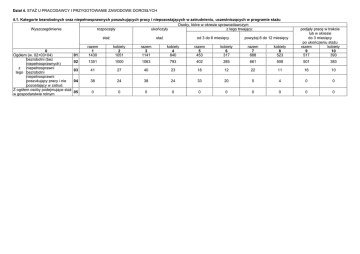 Dział 4. STAŻ U PRACODAWCY I PRZYGOTOWANIE ZAWODOWE DOROSŁYCH 4.1. Kategorie bezrobotnych oraz niepełnosprawnych poszukujących pracy i niepozostających w zatrudnieniu, uczestniczących w programie stażu Osoby, które w okresie sprawozdawczym Wyszczególnienie rozpoczęły ukończyły z tego trwający: staż 0 Ogółem (w. 02+03+04) bezrobotni (bez niepełnosprawnych) z niepełnosprawni tego bezrobotni niepełnosprawni poszukujący pracy i nie pozostający w zatrud. Z ogółem osoby podejmujące staż w gospodarstwie rolnym staż od 3 do 6 miesięcy powyżej 6 do 12 miesięcy podjęły pracę w trakcie lub w okresie do 3 miesięcy po ukończeniu stażu razem kobiety 9 10 517 393 01 razem 1 1430 kobiety 2 1051 razem 3 1141 kobiety 4 840 razem 5 453 kobiety 6 317 razem 7 688 kobiety 8 523 02 1351 1000 1063 793 402 285 661 508 501 383 03 41 27 40 23 18 12 22 11 16 10 04 38 24 38 24 33 20 5 4 0 0 05 0 0 0 0 0 0 0 0 0 0 4.2. Kategorie osób bezrobotnych oraz poszukujących pracy uczestniczących w programie przygotowania zawodowego dorosłych z uwzględnieniem jego formy rozpoczęły program ukończyły program zdobyły świadectwo lub zaświadczenie Wyszczególnienie 0 Osoby uczestniczące w programie ogółem (w.07+15) razem (w.08+09) bezrobotni Praktyczn poszukujący pracy (w.10+11 do 14) a otrzymujący świadczenie nauka z socjalne zawodu tego uczestniczący w zajęciach w z Centrum Integracji Społecznej tego żołnierze rezerwy pobierający rentę szkoleniową pobierający świadczenie szkoleniowe razem (w.16+17) bezrobotni Przyuczen poszukujący pracy (w.18+19 do 22) ie otrzymujący świadczenie do z socjalne pracy tego uczestniczący w zajęciach w z Centrum Integracji Społecznej tego żołnierze rezerwy pobierający rentę szkoleniową pobierający świadczenie szkoleniowe podjęły pracę w trakcie lub w okresie do 3 miesięcy po ukończeniu programu razem kobiety 7 8 0 0 0 0 0 0 06 07 08 razem 1 0 0 0 kobiety 2 0 0 0 razem 3 0 0 0 kobiety 4 0 0 0 razem 5 0 0 0 kobiety 6 0 0 0 09 0 0 0 0 0 0 0 0 0 0 0 0 0 0 0 0 11 0 0 0 0 0 0 0 0 12 13 0 0 0 0 0 0 0 0 0 0 0 0 0 0 0 0 14 0 0 0 0 0 0 0 0 15 16 17 0 0 0 0 0 0 0 0 0 0 0 0 0 0 0 0 0 0 0 0 0 0 0 0 0 0 0 0 0 0 0 0 19 0 0 0 0 0 0 0 0 20 21 22 0 0 0 0 0 0 0 0 0 0 0 0 0 0 0 0 0 0 0 0 0 0 0 0 10 18 4.3. Osoby, które ukończyły staż i przygotowanie zawodowe dorosłych według wieku, poziomu wykształcenia i czasu trwania programu Osoby, które ukończyły przygotowanie Wyszczególnienie z tego staż zawodowe praktyczną naukę zawodu dorosłych z tego ogółem ogółem ogółem bezrobotni poszukujący pracy 0 1 2 3 4 5 6 23 1141 0 0 0 0 0 Ogółem 24 370 0 0 0 0 0 18-24 25 538 0 0 0 0 0 wiek 25-34 26 89 0 0 0 0 0 35-44 27 144 0 0 0 0 0 45 lat i więcej 28 484 0 0 0 0 0 wyższe policealne i średnie 29 245 0 0 0 0 0 wykzawodowe ształ30 317 0 0 0 0 0 średnie ogólnokształcące 31 29 0 0 0 0 0 cenie zasadnicze zawodowe 32 66 0 0 0 0 0 gimnazjalne i poniżej 33 X 0 X X X 0 czas 3-4 34 X 0 X X X 0 trwania 5-6 35 X 0 0 0 0 X programu 12-14 36 X 0 0 0 0 X w miesiącach 15-16 37 X 0 0 0 0 X 17-18 przyuczenie do pracy z tego 7 0 0 0 0 0 0 poszukujący pracy 8 0 0 0 0 0 0 0 0 0 0 0 0 0 X X X 0 0 0 0 0 X X X bezrobotni 4.4. Obszary zawodowe, w których bezrobotni odbyli program stażu lub przygotowania zawodowego dorosłych osoby, które w okresie sprawozdawczym Wyszczególnienie 0 Ogółem osoby uczestniczące w programie (w. 39+40 do 68) szkolenie nauczycieli i nauka o kształceniu sztuka, kultura, rzemiosło artystyczne nauki humanistyczne (bez języków obcych) i społeczne (w tym: ekonomia, socjologia, psychologia, politologia, etnologia, geografia) języki obce dziennikarstwo i informacja naukowo-techniczna sprzedaż, marketing, public relations, handel nieruchomościami rachunkowość, księgowość, bankowość, ubezpieczenia, analiza inwestycyjna zarządzanie i administrowanie z prace sekretarskie i biurowe tego prawo nauki o życiu i nauki przyrodnicze (w tym: biologia, zoologia, chemia, fizyka) matematyka i statystyka informatyka i wykorzystanie komputerów technika i handel artykułami technicznymi (w tym: mechanika, metalurgia, energetyka, elektryka, elektronika, telekomunikacja, miernictwo, naprawa i konserwacja pojazdów) górnictwo i przetwórstwo przemysłowe (w tym: przemysł spożywczy, lekki, chemiczny) architektura i budownictwo rolnictwo, leśnictwo, rybołówstwo weterynaria opieka zdrowotna opieka społeczna (w tym: opieka nad osobami niepełnosprawnymi, starszymi, dziećmi, wolontariat) ochrona własności i osób ochrona środowiska usługi hotelarskie, turystyka i rekreacja usługi gastronomiczne usługi fryzjerskie, kosmetyczne usługi krawieckie, obuwnicze usługi stolarskie, szklarskie usługi transportowe (w tym kursy prawa jazdy) pozostałe usługi inne obszary zawodowe ukończyły staż podjęły pracę w trakcie lub w okresie do 3 miesięcy po ukończeniu stażu ukończyły przygotowanie zawodowe dorosłych z tego praktyczną naukę zawodu podjęły pracę w trakcie lub w okresie do 3 miesięcy po ukończeniu przygotowania zawodowego dorosłych razem kobiety 9 10 0 0 0 0 0 0 38 39 40 razem 1 1103 2 3 kobiety 2 816 2 3 razem 3 517 1 0 kobiety 4 393 1 0 razem 5 0 0 0 kobiety 6 0 0 0 razem 7 0 0 0 kobiety 8 0 0 0 41 1 1 1 1 0 0 0 0 0 42 43 44 0 0 43 0 0 32 0 0 18 0 0 14 0 0 0 0 0 0 0 0 0 0 0 0 45 5 4 1 1 0 0 0 46 47 48 0 252 2 0 189 2 0 120 0 0 90 0 0 0 0 0 0 0 49 2 2 1 1 0 50 51 0 11 0 2 0 6 0 2 52 1 0 0 53 1 1 54 55 56 57 8 1 2 10 58 59 60 61 62 63 64 65 66 67 68 z tego praktyczną naukę zawodu razem 11 0 0 0 kobiety 12 0 0 0 0 0 0 0 0 0 0 0 0 0 0 0 0 0 0 0 0 0 0 0 0 0 0 0 0 0 0 0 0 0 0 0 0 0 0 0 0 0 0 0 0 0 0 0 0 0 0 0 0 0 0 0 0 0 0 0 0 0 0 0 0 0 0 0 0 0 0 0 0 0 1 1 0 0 0 0 0 0 0 0 3 0 2 9 2 0 2 3 1 0 2 3 0 0 0 0 0 0 0 0 0 0 0 0 0 0 0 0 0 0 0 0 0 0 0 0 0 0 0 0 0 0 0 0 9 9 6 6 0 0 0 0 0 0 0 0 0 1 2 4 23 3 1 1 8 707 0 1 2 4 23 2 0 1 5 517 0 1 0 3 9 1 0 1 3 337 0 1 0 3 9 0 0 1 2 254 0 0 0 0 0 0 0 0 0 0 0 0 0 0 