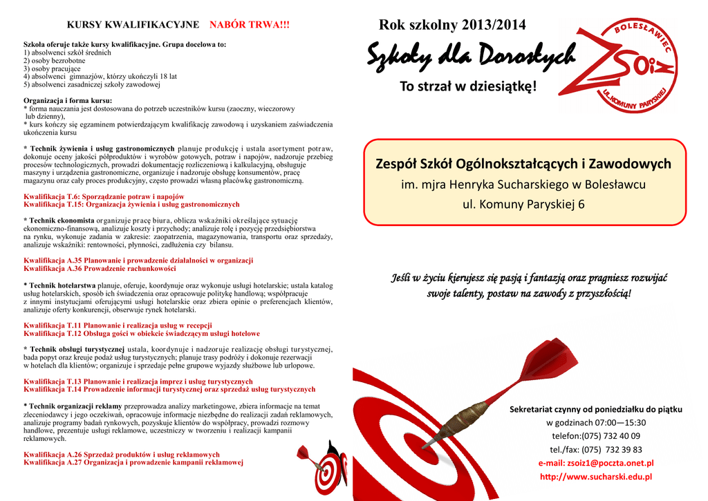 KURSY KWALIFIKACYJNE NABÓR TRWA!!! Szkoła oferuje także kursy kwalifikacyjne. Grupa docelowa to: 1) absolwenci szkół średnich 2) osoby bezrobotne 3) osoby pracujące 4) absolwenci gimnazjów, którzy ukończyli 18 lat 5) absolwenci zasadniczej szkoły zawodowej Rok szkolny 2013/2014 Szkoły dla Dorosłych To strzał w dziesiątkę! Organizacja i forma kursu: * forma nauczania jest dostosowana do potrzeb uczestników kursu (zaoczny, wieczorowy lub dzienny), * kurs kończy się egzaminem potwierdzającym kwalifikację zawodową i uzyskaniem zaświadczenia ukończenia kursu * Technik żywienia i usług gastronomicznych planuje pr odukcję i ustala asor tyment potr aw, dokonuje oceny jakości półproduktów i wyrobów gotowych, potraw i napojów, nadzoruje przebieg procesów technologicznych, prowadzi dokumentację rozliczeniową i kalkulacyjną, obsługuje maszyny i urządzenia gastronomiczne, organizuje i nadzoruje obsługę konsumentów, pracę magazynu oraz cały proces produkcyjny, często prowadzi własną placówkę gastronomiczną. Kwalifikacja T.6: Sporządzanie potraw i napojów Kwalifikacja T.15: Organizacja żywienia i usług gastronomicznych Zespół Szkół Ogólnokształcących i Zawodowych im. mjra Henryka Sucharskiego w Bolesławcu ul. Komuny Paryskiej 6 * Technik ekonomista or ganizuje pr acę biur a, oblicza wskaźniki okr eślające sytuację ekonomiczno-finansową, analizuje koszty i przychody; analizuje rolę i pozycję przedsiębiorstwa na rynku, wykonuje zadania w zakresie: zaopatrzenia, magazynowania, transportu oraz sprzedaży, analizuje wskaźniki: rentowności, płynności, zadłużenia czy bilansu. Kwalifikacja A.35 Planowanie i prowadzenie działalności w organizacji Kwalifikacja A.36 Prowadzenie rachunkowości * Technik hotelarstwa planuje, oferuje, koordynuje oraz wykonuje usługi hotelarskie; ustala katalog usług hotelarskich, sposób ich świadczenia oraz opracowuje politykę handlową; współpracuje z innymi instytucjami oferującymi usługi hotelarskie oraz zbiera opinie o preferencjach klientów, analizuje oferty konkurencji, obserwuje rynek hotelarski. Jeśli w życiu kierujesz się pasją i fantazją oraz pragniesz rozwijać swoje talenty, postaw na zawody z przyszłością! Kwalifikacja T.11 Planowanie i realizacja usług w recepcji Kwalifikacja T.12 Obsługa gości w obiekcie świadczącym usługi hotelowe * Technik obsługi turystycznej ustala, koor dynuje i nadzor uje r ealizację obsługi tur ystycznej, bada popyt oraz kreuje podaż usług turystycznych; planuje trasy podróży i dokonuje rezerwacji w hotelach dla klientów; organizuje i sprzedaje pełne grupowe wyjazdy służbowe lub urlopowe. Kwalifikacja T.13 Planowanie i realizacja imprez i usług turystycznych Kwalifikacja T.14 Prowadzenie informacji turystycznej oraz sprzedaż usług turystycznych * Technik organizacji reklamy przeprowadza analizy marketingowe, zbiera informacje na temat zleceniodawcy i jego oczekiwań, opracowuje informacje niezbędne do realizacji zadań reklamowych, analizuje programy badań rynkowych, pozyskuje klientów do współpracy, prowadzi rozmowy handlowe, prezentuje usługi reklamowe, uczestniczy w tworzeniu i realizacji kampanii reklamowych. Kwalifikacja A.26 Sprzedaż produktów i usług reklamowych Kwalifikacja A.27 Organizacja i prowadzenie kampanii reklamowej Sekretariat czynny od poniedziałku do piątku w godzinach 07:00—15:30 telefon:(075) 732 40 09 tel./fax: (075) 732 39 83 e-mail: [email protected] http://www.sucharski.edu.pl Liceum Ogólnokształcące dla Dorosłych to propozycja dla osób, które chcą zdobyć średnie wykształcenie nie rezygnując z pracy i codziennych obowiązków. Wiemy jak istotną rolę odgrywa dzisiaj ukończenie szkoły średniej i świadectwo dojrzałości. Daje ono szansę na zdobycie lepszej pracy, otwiera drogę do dalszego kształcenia. Wszystkim chętnym zapewniamy bezpłatną możliwość kontynuowania nauki w Powiatowej Szkole Policealnej- zaocznej na kierunkach: technik administracji i technik rachunkowości. Nasze liceum ma uprawnienia szkoły publicznej. Liceum Ogólnokształcące dla Dorosłych to szkoła dla tych, którzy zakończyli edukację na poziomie ośmioletniej szkoły podstawowej, gimnazjum lub ukończyli zasadniczą szkołę zawodową. Nauka trwa 3 lata. Osoby, które ukończyły ZSZ mogą rozpocząć naukę od klasy drugiej. Zapraszamy każdego, kto ukończył 18 lat. Zajęcia odbywają się w systemie zaocznym co dwa tygodnie. Rekrutacja: bez egzaminów wstępnych, decyduje kolejność zgłoszeń! Podania można składać w sekretariacie szkoły przy ul. Komuny Paryskiej 6 Termin składania podań upływa 29 sierpnia 2013 roku. Właściwie skompletowane dokumenty zawierają: 1. Podanie. 2. Świadectwo ukończenia szkoły stanowiącej podbudowę. 3.. Kserokopia dowodu osobistego. 4. Dwie podpisane fotografie. Powiatowa Szkoła Policealna- zaoczna, 2-letnia TECHNIK RACHUNKOWOŚCI Absolwent potrafi: - samodzielnie ewidencjonować operacje gospodarcze w obrocie krajowym i zagranicznym - dokonywać rozliczeń walutowych - prowadzić rejestr transakcji finansowych przedsiębiorstw - wykonywać bilanse i raporty finansowe -dokonywać rozliczeń z fiskusem - ewidencjonować dokumenty finansowe - archiwizować dokumenty - wykonywać typowe czynności planistyczne i analityczne - prowadzić własną działalność gospodarczą - obsługiwać programy komputerowe z zakresu gospodarki magazynowej, sprzedaży, księgowości i kadr -postępować zgodnie z zasadami etyki i kultury zawodu Zawody dostępne dla absolwenta: - pracownik działu finansowo- księgowego - pracownik biura rachunkowego - pracownik banku - pracownik sektora ubezpieczeniowego - pracownik urzędu skarbowego - księgowy - specjalista ds. finansów - specjalista ds. kadr i płac TECHNIK ADMINISTRACJI Absolwent potrafi: - interpretować i stosować przepisy prawa, - kierować się zasadami praworządności - przygotowywać projekty umów