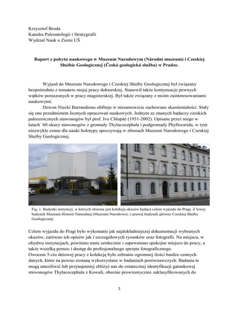 Krzysztof Broda Katedra Paleontologii i Stratygrafii Wydział Nauk o Ziemi UŚ Raport z pobytu naukowego w Muzeum Narodowym (Národní muzeum) i Czeskiej Służbie Geologicznej (Česká geologická služba) w Pradze. Wyjazd do Muzeum Narodowego i Czeskiej Służby Geologicznej był związany bezpośrednio z tematem mojej pracy doktorskiej. Stanowił także kontynuacje pewnych wątków poruszonych w pracy magisterskiej. Był także związany z moim zainteresowaniami naukowymi. Dewon Niecki Barrandienu obfituje w niesamowicie zachowane skamieniałości. Stały się one przedmiotem licznych opracowań naukowych. Jednym ze znanych badaczy czeskich paleozoicznych stawonogów był prof. Ivo Chlupáč (1931-2002). Opisane przez niego w latach `60 okazy stawonogów z gromady Thylacocephala i podgromady Phyllocarida, w tym niezwykle cenne dla nauki holotypy spoczywają w zbiorach Muzeum Narodowego i Czeskiej Służby Geologicznej. Fig. 1. Budynki instytucji, w których złożona jest kolekcja okazów będąca celem wyjazdu do Pragi. Z lewej: budynek Muzeum Historii Naturalnej (Muzeum Narodowe); z prawej budynek główny Czeskiej Służby Geologicznej. Celem wyjazdu do Pragi było wykonanie jak najdokładniejszej dokumentacji wybranych okazów, zarówno ich opisów jak i szczegółowych rysunków oraz fotografii. Na miejscu, w obydwu instytucjach, powitano mnie serdecznie i zapewniono spokojne miejsce do pracy, a także wszelką pomoc i dostęp do profesjonalnego sprzętu fotograficznego. Owocem 5-cio dniowej pracy z kolekcją było zebranie ogromnej ilości bardzo cennych danych, które na pewno zostaną wykorzystane w badaniach porównawczych. Badania te mogą umożliwić lub przynajmniej zbliżyć nas do ostatecznej identyfikacji gatunkowej stawonogów Thylacocephala z Kowali, obecnie prowizorycznie zaklasyfikowanych do 1 gatunku Concavicaris sp. aff. C. bradleyi. W podobny sposób zostaną wykorzystane dane pochodzące z przedstawicieli Phyllocarida. Fig. 2. Czeska Służba Geologiczna. Z lewej: fragment badanej kolekcji; z prawej: sprzęt fotograficzny, na który wykonano dokumentacje fotograficzną. Jednakże wizyta nie ograniczyła się jedynie do badań nad kolekcją. Dzięki uprzejmości dra Petra Budila miałem okazję zwiedzić wystawę paleontologiczną w budynku Służby. Składają się na nią okazy z całego terytorium Republiki Czeskiej, z większości okresów geologicznych. Niezwykłe wrażenie robią płyty wapieni zawierające niezliczone muszle łodzików zorientowane (prawdopodobnie dzięki działaniu prądów morskich) w jednym kierunku. Wystawa zawierała także pokaźny zbiór skamieniałości stawonogów, nie tylko tych będących przedmiotem wyjazdu. Królowały przede wszystkim trylobity, ale także wspaniałe okazy skorupiaków. Fig. 3. Czeska Służba Geologiczna, wystawa muzealna. Z lewej: wapień głowonogowy ze zorientowanymi kierunkowo muszlami łodzików Kopaninoceras sp. ; z prawej: prawie kompletny okaz homara Enoplocythia leachi (Praga, turon). W trakcie wyjazdu nawiązałem współpracę ze wspomnianym doktorem Petrem Budilem, co zaowocowało zaproszeniem do wspólnej pracy nad przedstawicielami Phyllocarida z paleozoiku niecki Barrandienu. Podsumowując, wyjazd naukowy do Muzeum Narodowego i Czeskiej Służby Geologicznej okazał się bardzo owocny. Zebrane zostały bardzo cenne dane, kluczowe do 2 rozstrzygnięcia wielu kwestii dotyczących przedstawicieli Thylacocephala i Phyllocarida z dewonu Gór Świętokrzyskich. Nawiązano współprace naukową z doświadczonym naukowcem spoza Polski. Udało mi się także, co ważne, poszerzyć własną wiedzę i horyzonty. Wyjazd został dofinansowany ze środków Centrum Studiów Polarnych Uniwersytetu Śląskiego – Krajowego Naukowego Ośrodka Wiodącego (KNOW) w zakresie nauk o Ziemi 2014-2018. Wyrażam zgodę na upublicznienie raportu na stronie: www.polarknow.us.edu.pl oraz na wykorzystanie i rozpowszechnianie załączonych fotografii w celu promocji KNOW. Krzysztof Broda 3