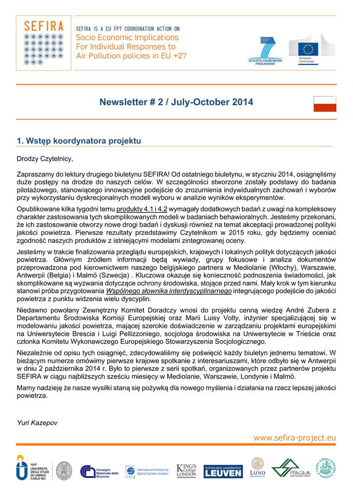 Newsletter # 2 / July-October 2014 1. Wstęp koordynatora projektu Drodzy Czytelnicy, Zapraszamy do lektury drugiego biuletynu SEFIRA! Od ostatniego biuletynu, w styczniu 2014, osiągnęliśmy duże postępy na drodze do naszych celów. W szczególności stworzone zostały podstawy do badania pilotażowego, stanowiącego innowacyjne podejście do zrozumienia indywidualnych zachowań i wyborów przy wykorzystaniu dyskrecjonalnych modeli wyboru w analizie wyników eksperymentów. Opublikowane kilka tygodni temu produkty 4.1 i 4.2 wymagały dodatkowych badań z uwagi na kompleksowy charakter zastosowania tych skomplikowanych modeli w badaniach behawioralnych. Jesteśmy przekonani, że ich zastosowanie otworzy nowe drogi badań i dyskusji również na temat akceptacji prowadzonej polityki jakości powietrza. Pierwsze rezultaty przedstawimy Czytelnikom w 2015 roku, gdy będziemy oceniać zgodność naszych produktów z istniejącymi modelami zintegrowanej oceny. Jesteśmy w trakcie finalizowania przeglądu europejskich, krajowych i lokalnych polityk dotyczących jakości powietrza. Głównym źródłem informacji będą wywiady, grupy fokusowe i analiza dokumentów przeprowadzona pod kierownictwem naszego belgijskiego partnera w Mediolanie (Włochy), Warszawie, Antwerpii (Belgia) i Malmö (Szwecja) . Kluczowa okazuje się konieczność podnoszenia świadomości, jak skomplikowane są wyzwania dotyczące ochrony środowiska, stojące przed nami. Mały krok w tym kierunku stanowi próba przygotowania Wspólnego słownika interdyscyplinarnego integrującego podejście do jakości powietrza z punktu widzenia wielu dyscyplin. Niedawno powołany Zewnętrzny Komitet Doradczy wnosi do projektu cenną wiedzę André Zubera z Departamentu Środowiska Komisji Europejskiej oraz Marii Luisy Volty, inżynier specjalizującej się w modelowaniu jakości powietrza, mającej szerokie doświadczenie w zarządzaniu projektami europejskimi na Uniwersytecie Brescia i Luigi Pellizzoniego, socjologa środowiska na Uniwersytecie w Trieście oraz członka Komitetu Wykonawczego Europejskiego Stowarzyszenia Socjologicznego. Niezależnie od opisu tych osiągnięć, zdecydowaliśmy się poświęcić każdy biuletyn jednemu tematowi. W bieżącym numerze omówimy pierwsze krajowe spotkanie z interesariuszami, które odbyło się w Antwerpii w dniu 2 października 2014 r. Było to pierwsze z serii spotkań, organizowanych przez partnerów projektu SEFIRA w ciągu najbliższych sześciu miesięcy w Mediolanie, Warszawie, Londynie i Malmö. Mamy nadzieję że nasze wysiłki staną się pożywką dla nowego myślenia i działania na rzecz lepszej jakości powietrza. Yuri Kazepov 2. Antwerpia – stadium przypadku (Anneleen Kenis i Maarten Loopmans, K.U. Leuven) 2.1. Drugie spotkanie plenarne i pierwsze spotkanie interesariuszy w Antwerpii (Belgia) Od 1 do 3 października 2014 r. w Antwerpii (Belgia) odbyło się drugie spotkanie plenarne w ramach projektu SEFIRA. Towarzyszyło mu pierwsze krajowe spotkanie interesariuszy. Dzięki temu połączeniu krajowe spotkanie podniosło swoją rangę , ułatwiając wymianę poglądów na temat jakości powietrza między krajowymi, regionalnymi i lokalnymi interesariuszami, jak również stwarzając możliwość spotkania z ekspertami międzynarodowymi. Finałem spotkania był wieczorny otwarty wykład dotyczący związku natężenia komunikacji z jakością powietrza, połączony z krótkimi wystąpieniami ekspertów SEFIRA oraz z oficjalnym rozpoczęciem programu SEFIRA w Belgii (patrz ryc. 1). Wieczorny wykład był współorganizowany przez organizacje pozarządowe Stratengeneraal i Ademloos jako jeden z serii wykładów Horta, największego publicznego forum służącego rozpowszechnianiu informacji na temat badań dotyczących jakości powietrza. Przy okazji tego już piętnastego wykładu, eksperci SEFIRY mieli okazję do wypowiedzi przed ponad 300-osobową publicznością zebraną w pięknej auli wykładowej Horta w Antwerpii, jak również w mediach regionalnych oraz portalach społecznościowych. Spotkanie w Antwerpii, mieście wybranym jako jedno z czterech objętych badaniem (obok Mediolanu, Malmö i Warszawy), dało również możliwość kontaktu z wieloma podmiotami działającymi na rzecz jakości powietrza. Zarówno publiczne, jak i kuluarowe dyskusje uczestników spotkania dostarczyły nam wielu trafnych spostrzeżeń, które zostaną wykorzystane w procesie badawczym i uwzględnione przy analizie dokumentów i wywiadów z głównymi interesariuszami oraz mieszkańcami Antwerpii i jej okolic. 1. Zdjęcia ze spotkania interesariuszy i konferencji Horta 2.2. Przypadek Antwerpii Studia przypadków mają na celu uzyskanie dogłębnej wiedzy, zarówno związanej z procesami przekładania europejskiego prawodawstwa i polityk na szczebel krajowy, regionalny i lokalny, a także z reakcją obywateli na politykę jakości powietrza. Przypadek Antwerpii pokazuje, że zaangażowanie obywateli nie tylko prowadzi do zmiany indywidualnych zachowań, ale również, co może być jeszcze ważniejsze, wiąże się z aktywnym ich udziałem w kształtowaniu polityki mającej na celu wdrażanie prawodawstwa europejskiego na poziomie krajowym, regionalnym i lokalnym. Antwerpia leży w jednym z najbardziej zanieczyszczonych regionów w Europie (patrz ryc. 2). Dzienne wartości dopuszczalne dla pyłu PM10 i roczny 2: Mapa sytuujaca Antwerpie na tle Europy limit dla NO2 są często przekraczane. Również obecność PM2.5 jest znacznie wyższa niż średnia europejska. W rezultacie obywatele Antwerpii są narażeni na poważne problemy zdrowotne i znaczne skrócenie oczekiwanej długości życia. Jest to spowodowane z jednej strony wysokim natężeniem ruchu w samym mieście, a z drugiej strony wiąże się z istnieniem dużego obszaru przemysłowego na terenie portu i ze związanym z tym ruchem komunikacyjnym. Historycznie ukształtowana lokalizacja infrastruktury drogowej w mieście zwiększa