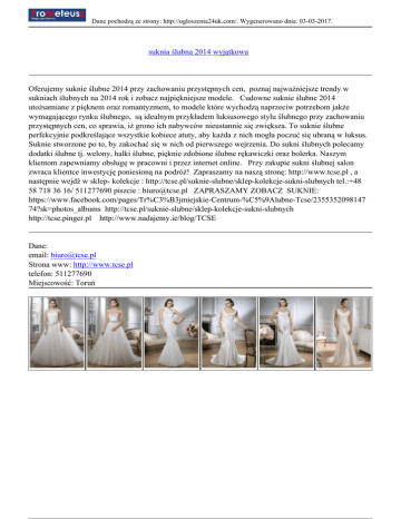 Dane pochodzą ze strony: http://ogloszenia24uk.com/. Wygenerowano dnia: 03-03-2017. suknia ślubna 2014 wyjątkowa Oferujemy suknie ślubne 2014 przy zachowaniu przystępnych cen, poznaj najważniejsze trendy w sukniach ślubnych na 2014 rok i zobacz najpiękniejsze modele. Cudowne suknie ślubne 2014 utożsamiane z pięknem oraz romantyzmem, to modele które wychodzą naprzeciw potrzebom jakże wymagającego rynku ślubnego, są idealnym przykładem luksusowego stylu ślubnego przy zachowaniu przystępnych cen, co sprawia, iż grono ich nabywców nieustannie się zwiększa. To suknie ślubne perfekcyjnie podkreślające wszystkie kobiece atuty, aby każda z nich mogła poczuć się ubraną w luksus. Suknie stworzone po to, by zakochać się w nich od pierwszego wejrzenia. Do sukni ślubnych polecamy dodatki ślubne tj. welony, halki ślubne, pięknie zdobione ślubne rękawiczki oraz bolerka. Naszym klientom zapewniamy obsługę w pracowni i przez internet online. Przy zakupie sukni ślubnej salon zwraca klientce inwestycję poniesioną na podróż! Zapraszamy na naszą stronę: http://www.tcse.pl , a następnie wejdź w sklep- kolekcje : http://tcse.pl/suknie-slubne/sklep-kolekcje-sukni-slubnych tel.:+48 58 718 36 16/ 511277690 piszcie : [email protected] ZAPRASZAMY ZOBACZ SUKNIE: https://www.facebook.com/pages/Tr%C3%B3jmiejskie-Centrum-%C5%9Alubne-Tcse/2355352098147 74?sk=photos_albums http://tcse.pl/suknie-slubne/sklep-kolekcje-sukni-slubnych http://tcse.pinger.pl http://www.nadajemy.ie/blog/TCSE Dane: email: [email protected] Strona www: http://www.tcse.pl telefon: 511277690 Miejscowość: Toruń
