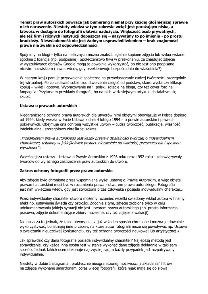 Temat praw autorskich powraca jak bumerang niemal przy każdej głośniejszej sprawie o ich naruszenie. Niestety wiedza w tym zakresie wciąż jest porażająco niska, a łatwość w dostępie do fotografii ułatwia nadużycia. Większość osób prywatnych, ale też firm i różnych instytucji dopuszcza się – nazywajmy to po imieniu - po prostu kradzieży. Nieświadomość nie jest żadnym usprawiedliwieniem – brak znajomości prawa nie zwalnia od odpowiedzialności. Spójrzmy na blogi - tylko na nielicznych można znaleźć legalnie kupione zdjęcia lub wykorzystane zgodnie z licencją (np. podpisane). Społeczeństwo tkwi w przekonaniu, że znajdując zdjęcie w wyszukiwarce obrazów Google mogą je dowolnie wykorzystać, bo nie jest ono podpisane niczyim nazwiskiem (nawet wtedy, gdy przekierowuje bezpośrednio do właściciela?). W naszym kraju panuje przyzwolenie społeczne na przywłaszczanie cudzej twórczości, szczególnie tej wirtualnej. Po co zadawać sobie trud stworzenia czegoś od podstaw, skoro wystarczy kliknąć kopiuj – wklej i gotowe. Wypracowanie na j. polski, zdjęcie na bloga, czy też cover foto na fanpage'a. Przytaczam przykłady fotografii, bo na nich w dzisiejszym artykule chciałabym się skupić. Ustawa o prawach autorskich Nieograniczona ochrona prawa autorskich dla utworów nimi objętymi obowiązuje w Polsce dopiero od 1994, kiedy weszła w życie Ustawa z dnia 4 lutego 1994 r. o prawie autorskim i prawach pokrewnych. Obejmuje ona ochroną wszystkie utwory – cudzą twórczość, publikacje, własność intelektualną i szczegółowo określa jej zakres. „Przedmiotem prawa autorskiego jest każdy przejaw działalności twórczej o indywidualnym charakterze, ustalony w jakiejkolwiek postaci, niezależnie od wartości, przeznaczenia i sposobu wyrażenia ”1 Wcześniejsza ustawy - Ustawa o Prawie Autorskim z 1926 roku oraz 1952 roku - zobowiązywały twórców do wyraźnego zastrzeżenia praw autorskich do utworu. Zakres ochrony fotografii przez prawo autorskie Aby zdjęcie było chronione przez wspomnianą wyżej Ustawę o Prawie Autorskim, a więc objęte prawami autorskimi musi być w rozumieniu prawa - utworem prawa autorskiego. Fotografia jest nim wyłącznie wtedy, gdy jest stworzona przez człowieka i posiada indywidualny charakter. 2 Przez indywidualny charakter utworu możemy rozumieć wszelki świadomy wkład autora w finalny efekt np. ustawienie światła czy ostrości. Zgodnie z tym, zdjęcie zrobione tylko w celu udokumentowania jakiejś sytuacji nie jest utworem prawa autorskiego (np. prosta informacja prasowa, zdjęcie dokumentujące zbiory muzealne, czy też zdjęcie z wakacji) Nie oznacza to jednak, że takie utwory nie są już w żaden sposób chronione i można je dowolnie wykorzystywać, bo istnieją inne przepisy, na które autor fotografii może się powoływać np. Ustawa o zwalczaniu nieuczciwej konkurencji3, czy też ochrona twórczości naukowej lub artystycznej. 4 Jak sprawdzić czy dana fotografia posiada indywidualny charakter? Najlepszą metodą jest sprawdzenie, czy każda inna osoba jest w stanie wykonać dane zdjęcie dokładnie w taki sam sposób. Jednak takich ocen dokonuje najczęściej sąd, a każdy przypadek jest rozpatrywany indywidualnie. Niestety w dobie Instagrama i praktycznie nieograniczonej możliwości „nakładania” filtrów na zdjęcia wykonane smartfonami coraz więcej fotografii, które nijak mają się do słowa „profesjonalna”, takie prawa autorskie będą posiadać. Wspomniane wyżej zdjęcie z wakacji poddane obróbce – również. Chciałabym w tym miejscu przytoczyć dwa wyroki sądów w sprawach dotyczących uznania praw autorskich, które dodatkowo rozwieją Wasze wątpliwości: „Naruszenie praw majątkowych do utworu fotograficznego polega zwykle na wykorzystaniu go wprost w całości lub we fragmentach. Ochronie może też jednak podlegać, w przypadku zdjęć pozowanych, ich szczególna kompozycja, w twórczy sposób wykorzystująca odpowiedni układ osób, przedmiotów, elementów krajobrazu itp. Natomiast, co do zasady, nie podlega ochronie, również w przypadku fotografii "pozowanych", samo wykorzystanie w niej konkretnych osób, rekwizytów itp.”5 „Prawa autorskie dotyczą utworu, a więc nie wizerunku danej osoby lecz jego przedstawienia w określonej formie będącej utworem w rozumieniu tego prawa. Wizerunek danej osoby staje się utworem, będącym przedmiotem prawa autorskiego, dopiero wówczas, gdy stanowi przejaw działalności twórczej o indywidualnym charakterze, ustalony w jakiejkolwiek postaci, niezależnie od wartości, przeznaczenia i sposobu wyrażenia. Prawo do wizerunku, a więc własnego wyglądu, nie jest również prawem pokrewnym w rozumieniu ustawy o prawie autorskim, skoro niewątpliwie nie stanowi artystycznego wykonania utworu (…) ” 6 Dozwolony użytek osobisty Art 23 „Bez zezwolenia twórcy wolno nieodpłatnie korzystać z już rozpowszechnionego utworu w zakresie własnego użytku osobistego (...)” 7 Jak wynika z powyższego artykułu bez zezwolenia twórcy wolno nieodpłatnie korzystać z już rozpowszechnionego utworu w zakresie własnego użytku osobistego (wyłącznie do celów prywatnych), ale konieczne jest oznaczenie twórcy i źródła, z którego pochodzi fotografia (nie wystarczy Internet, ale dokładny adres URL). Celem własnego użytku osobistego może to być cel rozrywkowy, kolekcjonerski, naukowy lub archiwalny. Zakres obejmuje korzystanie z pojedynczych egzemplarzy utworu przez osoby pozostające w związku osobistym, w szczególności pokrewieństwa, powinowactwa lub stosunku towarzyskiego (stosunek towarzyski zachodzi wtedy, czy wszyscy członkowie znają się i utrzymują ze sobą relacje towarzyskie – jak widać nie można tego odnieść np. do bloga, gdzie nie wszyscy czytelnicy się znają, nie mówiąc już o jakichkolwiek wspólnych relacjach). To tyle na dziś! Mamy nadzieję, że informacje zawarte w naszy