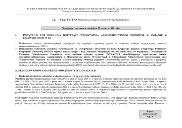 RAPORT W SPRAWIE DOSTOSOWAŃ INSTYTUCJONALNYCH W POLSCE DO WYMOGÓW CZŁONKOSTWA W UNII EUROPEJSKIEJ Przyjęty przez Komitet Integracji Europejskiej 10 kwietnia 2002 r. ____________________________________________________________________________________________________________________________________________ 12. STATYSTYKA (Instytucja wiodąca: Główny Urząd Statystyczny) Negocjacje tymczasowo zamknięte 22 czerwca 1999 roku I. INSTYTUCJE LUB DZIAŁANIA DOTYCZĄCE WZMOCNIENIA ADMINISTRACYJNEGO NIEZBĘDNE W ZWIĄZKU Z CZŁONKOSTWEM W UE 1. Doskonalenie struktur administracyjnych zajmujących się statystyką regionalną zgodnie ze zmianami struktury organizacyjnej statystyki przeprowadzonymi w 1999 r.; 2. Doskonalenie wybranych systemów statystycznych (w szczególności: utworzenie na bazie Krajowego Rejestru Urzędowego Podmiotów Gospodarki Narodowej REGON rejestru statystycznego – Bazy Jednostek Statystycznych); wdrażanie m.in. we współpracy z Ministerstwem Finansów, Ministerstwem Gospodarki oraz służbami celnymi systemu INTRASTAT umożliwiającego rejestrowanie handlu wewnątrzwspólnotowego; współdziałanie z Ministerstwem Spraw Wewnętrznych i Administracji, Ministerstwem Infrastruktury oraz Ministerstwem Finansów we wdrażaniu systemu centralnej ewidencji pojazdów i kierowców); rzetelne, zgodne z procedurami i przepisami narodowymi (które powinny być zharmonizowane z przepisami wspólnotowymi) oraz terminowe obliczanie wysokości poszczególnych elementów środków własnych w zakresie dochodu narodowego brutto (DNB) oraz danych statystycznych niezbędnych dla obliczeń średnioważonej stawki VAT. II. STAN ZAAWANSOWANIA PRZYGOTOWAŃ INSTYTUCJONALNYCH 1. Doskonalenie struktur administracyjnych zajmujących się statystyką regionalną Podstawa prawna: Rozporządzenie Rady Ministrów z dnia 24 lipca 2001 r. w sprawie programu badań statystycznych statystyki publicznej na rok 2002 (Dz.U. z 2001 r. Nr 97, poz. 1052, z późn. zm.) – weszło w życie 26 września 2001 r.; rozporządzenie Rady Ministrów z dnia 13 lipca 2000 r. w sprawie wprowadzenia Nomenklatury Jednostek Terytorialnych do Celów Statystycznych (NTS) (Dz.U. z 2000 r. Nr 58, poz. 685 z późn. zm.) – weszło w życie 8 sierpnia 2000 r.; ustawa z dnia 26 października 2000 r. o sposobie obliczania wartości rocznego produktu krajowego brutto (Dz.U. z 2000 r. Nr 114, poz. 1188) – weszła w życie 4 stycznia 2001 r.; ustawa z dnia 30 czerwca 2000 r. o warunkach dopuszczalności i nadzorowaniu pomocy publicznej dla przedsiębiorców (Dz. U. z 2000 Nr 60, poz. 704 z późn. zm.) – weszła w życie 1 stycznia 2001 r. Stan obecny: Wdrożono Nomenklaturę Jednostek Terytorialnych do Celów Statystycznych (NTS). GUS opracowuje i publikuje szacunki produktu krajowego brutto i jego elementów w ujęciu regionalnym. Poczynając od programu badań statystycznych statystyki publicznej w 2002 r. Nomenklatura jest wdrażana do praktyki statystycznej. Urzędy statystyczne prowadziły specjalistyczne prace związane ze statystyką regionalną: Poznań- statystyka miast, Katowice – Raport instytucjonalny 12 - 1 RAPORT W SPRAWIE DOSTOSOWAŃ INSTYTUCJONALNYCH W POLSCE DO WYMOGÓW CZŁONKOSTWA W UNII EUROPEJSKIEJ Przyjęty przez Komitet Integracji Europejskiej 10 kwietnia 2002 r. ____________________________________________________________________________________________________________________________________________ rachunki regionalne, Wrocław – Bank Danych Regionalnych. Wszystkie urzędy statystyczne uczestniczą w procesie badań statystycznych, a dla potrzeb regionalnych – prowadzą działalność publikacyjną i udostępnianie informacji. W ramach programu Phare‘2000 (projekt PL 0003.14 statystyka regionalna), w części twinningowej realizowanej z INSEE, realizowane są nastepujące cele: Dostosowanie metodologii badań statystyki regionalnej do wymogów UE, z uwzglednieniem krajowej Nomenklatury Jednostek Terytorialnych do Celów Statystycznych (NTS) – realizowane są misje ekspertów francuskich i niemieckich w obszarach: statystyki miast, ochrony środowiska, turystyki, rachunków regionalnych, transportu, rolnictwa, rynku pracy (konieczne jest wypracowanie metodologii i wprowadzenie do praktyki statystycznej podstawowych kategorii z zakresu rynku pracy w celu uzyskania danych nt. stopy bezrobocia wg BAEL (LFS) na poziomie NTS III). Wzmocnienie kompetencji urzędów statystycznych oraz ich zdolności wykonawczych – w ramach porozumienia bliźniaczego realizowane są misje ekspertów francuskich z Regionalnych Dyrekcji INSEE do urzędów statystycznych i misje ekspertów UE (do urzędów statystycznych i ośrodków szkoleniowych GUS) w zakresie technologii informatycznych i wizyty studialne dla polskich specjalistów we francuskich dyrekcjach regionalnych. Modernizacja i rozwój dedykowanego systemu informacyjnego statystyki regionalnej – misje ekspertów szwedzkich i francuskich do właściwych jednostek GUS w celu udzielenia wsparcia w przygotowaniu inwestycji w zakresie modernizacji i rozwoju systemu informacyjnego statystyki regionalnej obejmujacego wdrożenie do statystyki regionalnej koncepcji GIS i modernizację rejestru TERYT i Banku Danych Regionalnych zgodnie z bazą danych Eurostatu REGIO. W ramach realizowanej umowy twinningowej zaplanowano przeprowadzenie szkoleń statystycznych w nastepujacych blokach tematycznych: Zadania statystyki publicznej w zakresie programowania, wdrażania i monitorowania rozwoju regionalnego; Dostosowanie polskiej statystyki regionalnej do wymagań UE – szkolenie ogólne; Dostosowanie polskiej statystyki regionalnej do wymagań UE – dla specjalistów w dziedzinach statystyki rynku pracy, rolnictwa, ochrony środowiska, transportu, turystyki, statystyki miast; Rachunki regionalne dla użytkowników w jednostkach GUS; Metody analizy zróżnicowania regionalnego zjawisk i procesów społeczno-gospodarczych. • • Stan docelowy: Uwzględnienie w pr