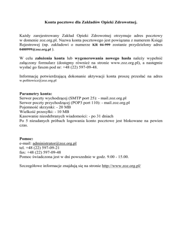 Konta pocztowe dla Zakładów Opieki Zdrowotnej. KaŜdy zarejestrowany Zakład Opieki Zdrowotnej otrzymuje adres pocztowy w domenie zoz.org.pl. Nazwa konta pocztowego jest powiązana z numerem Księgi Rejestrowej (np. zakładowi o numerze KR 04-999 zostanie przydzielony adres [email protected] ). W celu załoŜenia konta lub wygenerowania nowego hasła naleŜy wypełnić załączony formularz (dostępny równieŜ na stronie www.zoz.org.pl), a następnie wysłać go faxem pod nr: +48 (22) 597-09-48. Informację potwierdzającą dokonanie aktywacji konta proszę przesłać na adres [email protected] Parametry konta: Serwer poczty wychodzącej (SMTP port 25): - mail.zoz.org.pl Serwer poczty przychodzącej (POP3 port 110): - mail.zoz.org.pl Pojemność skrzynki: - 20 MB Wielkość przesyłki: - 10 MB Kasowanie nieodebranych wiadomości: - po 31 dniach Po 5 nieudanych próbach logowania konto pocztowe jest blokowane na pewien czas. Pomoc: e-mail: [email protected] tel. +48 (22) 597-09-21 fax: +48 (22) 597-09-48 Pomoc świadczona jest w dni powszednie w godz. 9.00 - 15.00. Szczegółowe informacje znajdują się na stronie http://www.zoz.org.pl/