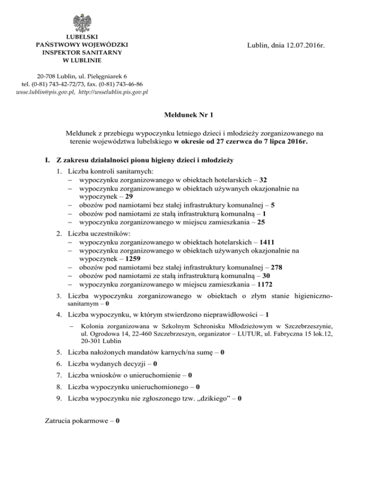 Meldunek Nr 1 z przebiegu wypoczynku letniego dzieci i młodzieży