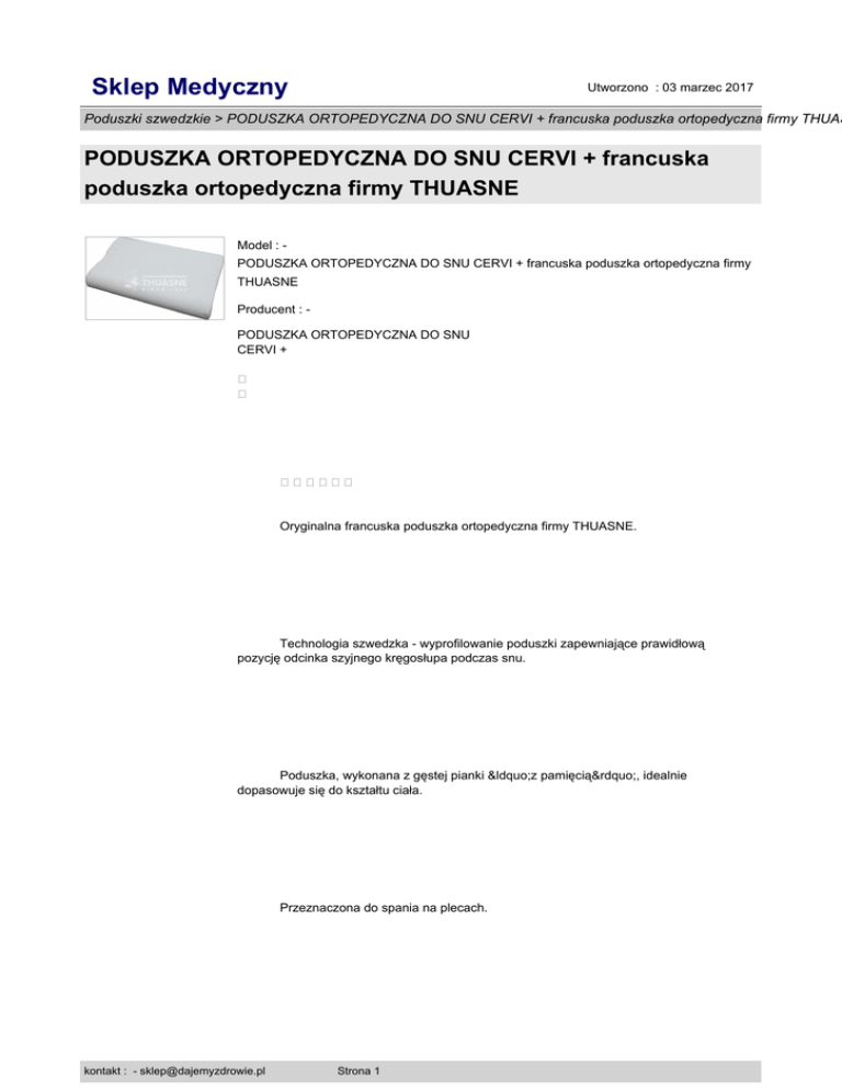Sklep Medyczny Utworzono : 03 marzec 2017 Poduszki szwedzkie > PODUSZKA ORTOPEDYCZNA DO SNU CERVI + francuska poduszka ortopedyczna firmy THUAS PODUSZKA ORTOPEDYCZNA DO SNU CERVI + francuska poduszka ortopedyczna firmy THUASNE Model : PODUSZKA ORTOPEDYCZNA DO SNU CERVI + francuska poduszka ortopedyczna firmy THUASNE Producent : PODUSZKA ORTOPEDYCZNA DO SNU CERVI + � � ������ Oryginalna francuska poduszka ortopedyczna firmy THUASNE. Technologia szwedzka - wyprofilowanie poduszki zapewniające prawidłową pozycję odcinka szyjnego kręgosłupa podczas snu. Poduszka, wykonana z gęstej pianki “z pamięcią”, idealnie dopasowuje się do kształtu ciała. Przeznaczona do spania na plecach. kontakt : - [email protected] Strona 1 Sklep Medyczny Utworzono : 03 marzec 2017 Poduszki szwedzkie > PODUSZKA ORTOPEDYCZNA DO SNU CERVI + francuska poduszka ortopedyczna firmy THUAS PODUSZKA ORTOPEDYCZNA DO SNU CERVI + francuska poduszka ortopedyczna firmy THUASNE Przeznaczona do spania na boku. � Stosowanie poduszki ortopedycznej zapewnia prawidłowe ułożenie szyi w trakcie snu, tym samym likwidując przyczynę: � dolegliwości związanych z bólami kręgosłupa � problemy z bezsennością � problemy z chrapaniem � napięcia nerwowych � Efekty działania poduszki: � już po kilku dniach snu na poduszce będziemy się budzić bardziej wypoczęci i zrelaksowani � następuje zmniejszenie lub całkowite zlikwidowanie ucisku tętnic szyjnych � poduszka likwiduje napięcie mięśni szyi i karku, zapobiegając tym samym występowaniu bólów migrenowych � poduszka zapewnia anatomiczne ułożenie kręgosłupa Anatomiczna poduszka dostosowuje się do kształtu głowy i szyi, bez względu na to czy osoba śpi na wznak czy na boku. Głowa zatapia się w piance: powierzchnia kontaktu ciała z podłożem zwiększa się a dzięki temu zmniejszana jest siła nacisku. � Pianka zapamiętuje kształt głowy i wywiera delikatny ucisk przeciwny grawitacji: następuje poprawa krążenia krwi. Poduszka zmniejsza niewłaściwe obciążenie odcinka szyjnego kręgosłupa i barków podczas snu, przeciwdziałając niepożądanym naprężeniom. 3 letnia gwarancja na sprężystość pianki. Wymiary - 32 x 50 x 10,5 /8 cm kontakt : - [email protected] Strona 2 Sklep Medyczny Utworzono : 03 marzec 2017 Poduszki szwedzkie > PODUSZKA ORTOPEDYCZNA DO SNU CERVI + francuska poduszka ortopedyczna firmy THUAS PODUSZKA ORTOPEDYCZNA DO SNU CERVI + francuska poduszka ortopedyczna firmy THUASNE Gęstość - 75 kg / m3 Cena : 119,00 zł Brutto ( 97,54 zł Netto) Dostępność: Produkt dostępny w naszym sklepie od 30 sierpień 2012 kontakt : - [email protected] Strona 3