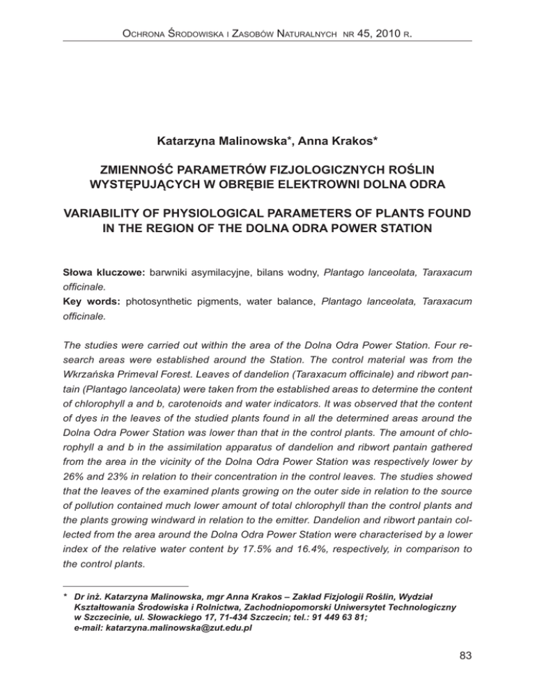 Ochrona Środowiska i Zasobów Naturalnych nr 45, 2010 r. Katarzyna Malinowska*, Anna Krakos* ZMIENNOŚĆ PARAMETRÓW FIZJOLOGICZNYCH ROŚLIN WYSTĘPUJĄCYCH W OBRĘBIE ELEKTROWNI DOLNA ODRA VARIABILITY OF PHYSIOLOGICAL PARAMETERS OF PLANTS FOUND IN THE REGION OF THE DOLNA ODRA POWER STATION Słowa kluczowe: barwniki asymilacyjne, bilans wodny, Plantago lanceolata, Taraxacum officinale. Key words: photosynthetic pigments, water balance, Plantago lanceolata, Taraxacum officinale. The studies were carried out within the area of the Dolna Odra Power Station. Four research areas were established around the Station. The control material was from the Wkrzańska Primeval Forest. Leaves of dandelion (Taraxacum officinale) and ribwort pantain (Plantago lanceolata) were taken from the established areas to determine the content of chlorophyll a and b, carotenoids and water indicators. It was observed that the content of dyes in the leaves of the studied plants found in all the determined areas around the Dolna Odra Power Station was lower than that in the control plants. The amount of chlorophyll a and b in the assimilation apparatus of dandelion and ribwort pantain gathered from the area in the vicinity of the Dolna Odra Power Station was respectively lower by 26% and 23% in relation to their concentration in the control leaves. The studies showed that the leaves of the examined plants growing on the outer side in relation to the source of pollution contained much lower amount of total chlorophyll than the control plants and the plants growing windward in relation to the emitter. Dandelion and ribwort pantain collected from the area around the Dolna Odra Power Station were characterised by a lower index of the relative water content by 17.5% and 16.4%, respectively, in comparison to the control plants. * Dr inż. Katarzyna Malinowska, mgr Anna Krakos – Zakład Fizjologii Roślin, Wydział Kształtowania Środowiska i Rolnictwa, Zachodniopomorski Uniwersytet Technologiczny w Szczecinie, ul. Słowackiego 17, 71-434 Szczecin; tel.: 91 449 63 81; e-mail: [email protected] 83 Katarzyna Malinowska, Anna Krakos 1. WPROWADZENIE Zespół Elektrowni Dolna Odra w Nowym Czarnowie jest podstawowym źródłem energii elektrycznej w województwie zachodniopomorskim oraz zasila w ciepło miasto Gryfino. Osiem bloków energetycznych zakładu emituje do atmosfery dwutlenek siarki, tlenki azotu oraz pyły. Emisja zanieczyszczeń wynikająca z działalności Elektrowni Dolna Odra mieści się jednak w obowiązujących w naszym kraju normach, traktujących o zanieczyszczeniu powietrza [Landsberg-Uczciwek i in. 2009]. Do określania stanów stresowych roślin stosuje się wiele metod badawczych. Do najbardziej powszechnych i jednocześnie dokładnych należą metody opierające się na pomiarach procesów fizjologicznych: fotosyntezy, oddychania i transpiracji, a także na określeniu parametrów biochemicznych [Kalaji, Rutkowska 2004]. Podstawowe procesy fizjologiczne roślin oraz zawartość barwników fotosyntetycznych wykazują zaburzenia w warunkach skażonego środowiska [Sawicka-Kapusta 1990, Farmer 2004, Legge, Krupa 2004, Woźny 2004, Zimny 2006]. Wykorzystanie parametrów fizjologicznych roślin odgrywa zatem znaczącą rolę w ocenie zasięgu gazowych i pyłowych zanieczyszczeń [Brej i in. 1982, Zimny, Żukowska-Wieszczek 1983]. Zastosowanie roślin wskaźnikowych odgrywa ważną rolę w śledzeniu zasięgu skażenia powietrza atmosferycznego. Mniszek pospolity (Taraxacum officinale, Weber) i babka lancetowata (Plantago lanceolata, Weber) – ze względu na powszechność występowania w naszej strefie geograficzno-klimatycznej, stosunkowo dużą masę ulistnienia oraz dużą zdolność kumulacji zanieczyszczeń chemicznych w liściach – są wykorzystywane w monitoringu biologicznym. Rośliny posiadające wymienione cechy ułatwiają prowadzenie badań porównawczych w różnych regionach kraju [Kabata-Pendias, Dudka 1991, Czarnowska, Milewska 2000, Motowicka-Terelak, Terelak 2000, Królak, Raczuk 2001, Jankowska i in. 2007]. Celem przeprowadzonych badań było określenie zawartości barwników asymilacyjnych i bilansu wodnego u mniszka pospolitego i babki lancetowatej, występujących wokół Elektrowni Dolna Odra, oraz wykazanie przydatności badanych parametrów fizjologicznych w monitoringu zasięgu zanieczyszczeń. 2. MATERIAŁ I METODY Do badań wykorzystano dwa gatunki roślin: mniszka pospolitego (Taraxacum officinale) i babkę lancetowatą (Plantago lanceolata). Badania przeprowadzono wokół Elektrowni Dolna Odra oraz na obszarze Puszczy Wkrzańskiej. Wyznaczono pięć obszarów badawczych o powierzchni około 600 m2, w różnych odległościach i kierunkach od źródła emisji: nr 1 – Puszcza Wkrzańska (punkt kontrolny), nr 2 – obszar w kierunku północnym od emitora (okolice wsi Nowe Czarnowo), nr 3 – obszar w kierunku południowym od emitora (są- 84 Zmienność parametrów fizjologicznych roślin występujących w obrębie elektrowni Dolna Odra siedztwo wsi Krajnik), nr 4 – obszar w kierunku wschodnim 0,5 km od emitora (okolice składowiska popiołu i żużlu), nr 5 – obszar w kierunku zachodnim, 0,6 km od emitora (okolice bramy wjazdowej zakładu). Z wyznaczonych obszarów badawczych, trzykrotnie w czasie wegetacji roślin (czerwiec, lipiec, sierpień) pobierano po 12 roślin do analiz laboratoryjnych. Zawartość barwników asymilacyjnych (chlorofil a i b, całkowity i karotenoidy) w liściach oznaczono metodą Lichtenthalera i Welburna [1983]. Bilans wodny określano na podstawie dwóch wskaźników RWC (względnej zawartości wody) i WSD (deficytu wysycenia wodą) [Bandurska 1991]. RWC – to stosunek aktualnej zawartości wody w tkance lub pędu (Wakt.) do zawartości wody w tych tkankach, gdy wykazują pełny turgor, czyli są w pełni wysycane wodą (Ws), WSD natomiast określa ile wody brakuje w tkance do pełnego jej wysycenia. Uzyskane wyniki opracowano metodą dwucz