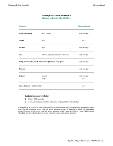 Miesięcznik Brać Łowiecka Okresy polowań Miesięcznik Brać Łowiecka Okresy polowań dla 02.2014 Gatunek Okres polowań Jeleń szlachetny byki, cielęta Daniel byki do 2 Muflon tryki cały miesiąc Dzik odyńce, wycinki, przelatki, warchlaki cały miesiąc cały miesiąc Kuny, tchórz, Lis, Jenot, norka amerykańska, szop pracz cały miesiąc Piżmak cały miesiąc Bażant koguty cały miesiąc kury do 2 1 Gęsi: zbożowa i białoczelna2 do 2 Wyjaśnienia przypisów: 1 - tylko w OHZ bażanta 2 - w woj. zachodniopomorskim, lubuskim, wielkopolskim i dolnośląskim W obwodach, w których w ostatnich dwóch latach kalendarzowych prowadzono zasiedlenia zajęcy, bażantów lub kuropatw, przez cały rok wolno polować na lisy. W obwodach, w których występują głuszce lub cietrzewie, przez cały rok wolno polować na lisy, borsuki, tchórze i kuny. Na terenach rybackich obrębów hodowlanych przez cały rok wolno polować na piżmaki. (C) 2014 Oficyna Wydawnicza "OIKOS" Sp. z o.o.