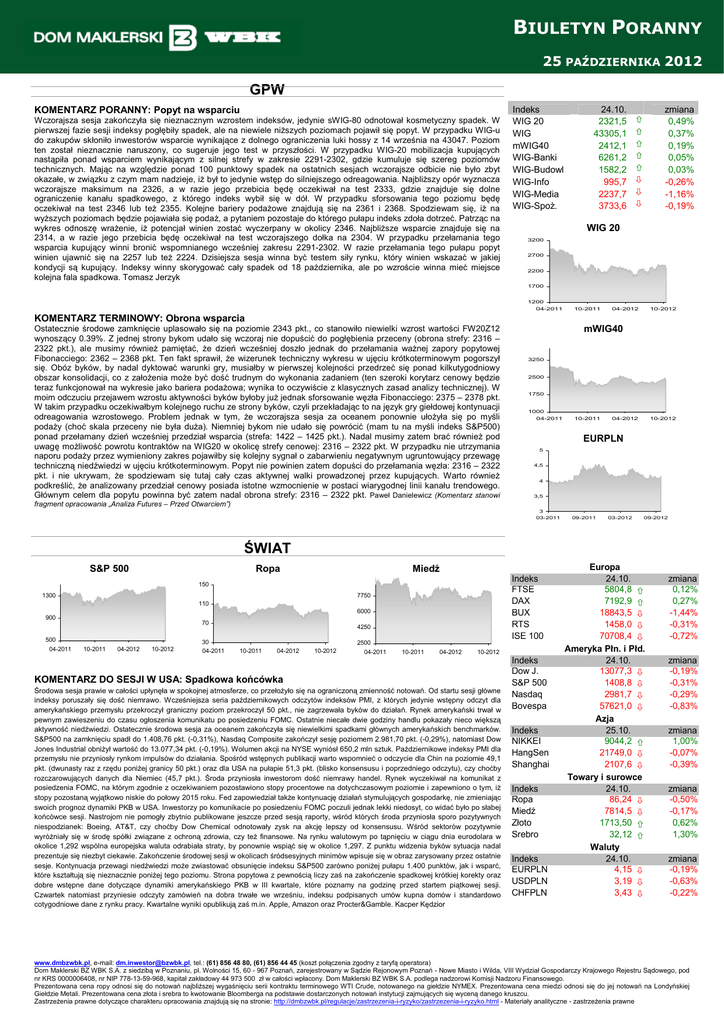 BIULETYN PORANNY o 25 PAŹDZIERNIKA 2012 GPW KOMENTARZ PORANNY: Popyt na wsparciu Wczorajsza sesja zakończyła się nieznacznym wzrostem indeksów, jedynie sWIG-80 odnotował kosmetyczny spadek. W pierwszej fazie sesji indeksy pogłębiły spadek, ale na niewiele niŜszych poziomach pojawił się popyt. W przypadku WIG-u do zakupów skłoniło inwestorów wsparcie wynikające z dolnego ograniczenia luki hossy z 14 września na 43047. Poziom ten został nieznacznie naruszony, co sugeruje jego test w przyszłości. W przypadku WIG-20 mobilizacja kupujących nastąpiła ponad wsparciem wynikającym z silnej strefy w zakresie 2291-2302, gdzie kumuluje się szereg poziomów technicznych. Mając na względzie ponad 100 punktowy spadek na ostatnich sesjach wczorajsze odbicie nie było zbyt okazałe, w związku z czym mam nadzieje, iŜ był to jedynie wstęp do silniejszego odreagowania. NajbliŜszy opór wyznacza wczorajsze maksimum na 2326, a w razie jego przebicia będę oczekiwał na test 2333, gdzie znajduje się dolne ograniczenie kanału spadkowego, z którego indeks wybił się w dół. W przypadku sforsowania tego poziomu będę oczekiwał na test 2346 lub teŜ 2355. Kolejne bariery podaŜowe znajdują się na 2361 i 2368. Spodziewam się, iŜ na wyŜszych poziomach będzie pojawiała się podaŜ, a pytaniem pozostaje do którego pułapu indeks zdoła dotrzeć. Patrząc na wykres odnoszę wraŜenie, iŜ potencjał winien zostać wyczerpany w okolicy 2346. NajbliŜsze wsparcie znajduje się na 2314, a w razie jego przebicia będę oczekiwał na test wczorajszego dołka na 2304. W przypadku przełamania tego wsparcia kupujący winni bronić wspomnianego wcześniej zakresu 2291-2302. W razie przełamania tego pułapu popyt winien ujawnić się na 2257 lub teŜ 2224. Dzisiejsza sesja winna być testem siły rynku, który winien wskazać w jakiej kondycji są kupujący. Indeksy winny skorygować cały spadek od 18 października, ale po wzroście winna mieć miejsce kolejna fala spadkowa. Tomasz Jerzyk Indeks WIG 20 WIG mWIG40 WIG-Banki WIG-Budowl WIG-Info WIG-Media WIG-SpoŜ. 24.10. 2321,5 43305,1 2412,1 6261,2 1582,2 995,7 2237,7 3733,6 zmiana 0,49% 0,37% 0,19% 0,05% 0,03% -0,26% -1,16% -0,19% WIG 20 3200 2700 2200 1700 1200 04-2011 10-2011 04-2012 10-2012 KOMENTARZ TERMINOWY: Obrona wsparcia Ostatecznie środowe zamknięcie uplasowało się na poziomie 2343 pkt., co stanowiło niewielki wzrost wartości FW20Z12 wynoszący 0.39%. Z jednej strony bykom udało się wczoraj nie dopuścić do pogłębienia przeceny (obrona strefy: 2316 – 2322 pkt.), ale musimy równieŜ pamiętać, Ŝe dzień wcześniej doszło jednak do przełamania waŜnej zapory popytowej Fibonacciego: 2362 – 2368 pkt. Ten fakt sprawił, Ŝe wizerunek techniczny wykresu w ujęciu krótkoterminowym pogorszył się. Obóz byków, by nadal dyktować warunki gry, musiałby w pierwszej kolejności przedrzeć się ponad kilkutygodniowy obszar konsolidacji, co z załoŜenia moŜe być dość trudnym do wykonania zadaniem (ten szeroki korytarz cenowy będzie teraz funkcjonował na wykresie jako bariera podaŜowa; wynika to oczywiście z klasycznych zasad analizy technicznej). W moim odczuciu przejawem wzrostu aktywności byków byłoby juŜ jednak sforsowanie węzła Fibonacciego: 2375 – 2378 pkt. W takim przypadku oczekiwałbym kolejnego ruchu ze strony byków, czyli przekładając to na język gry giełdowej kontynuacji odreagowania wzrostowego. Problem jednak w tym, Ŝe wczorajsza sesja za oceanem ponownie ułoŜyła się po myśli podaŜy (choć skala przeceny nie była duŜa). Niemniej bykom nie udało się powrócić (mam tu na myśli indeks S&P500) ponad przełamany dzień wcześniej przedział wsparcia (strefa: 1422 – 1425 pkt.). Nadal musimy zatem brać równieŜ pod uwagę moŜliwość powrotu kontraktów na WIG20 w okolicę strefy cenowej: 2316 – 2322 pkt. W przypadku nie utrzymania naporu podaŜy przez wymieniony zakres pojawiłby się kolejny sygnał o zabarwieniu negatywnym ugruntowujący przewagę techniczną niedźwiedzi w ujęciu krótkoterminowym. Popyt nie powinien zatem dopuści do przełamania węzła: 2316 – 2322 pkt. i nie ukrywam, Ŝe spodziewam się tutaj cały czas aktywnej walki prowadzonej przez kupujących. Warto równieŜ podkreślić, Ŝe analizowany przedział cenowy posiada istotne wzmocnienie w postaci wiarygodnej linii kanału trendowego. Głównym celem dla popytu powinna być zatem nadal obrona strefy: 2316 – 2322 pkt. Paweł Danielewicz (Komentarz stanowi mWIG40 3250 2500 1750 1000 04-2011 10-2011 04-2012 10-2012 EURPLN 5 4,5 4 3,5 fragment opracowania „Analiza Futures – Przed Otwarciem”) 3 03-2011 09-2011 03-2012 09-2012 ŚWIAT S&P 500 Ropa Miedź Indeks FTSE DAX BUX RTS ISE 100 150 1300 7750 110 6000 900 70 500 04-2011 4250 30 10-2011 04-2012 10-2012 04-2011 2500 10-2011 04-2012 10-2012 04-2011 10-2011 04-2012 10-2012 KOMENTARZ DO SESJI W USA: Spadkowa końcówka Środowa sesja prawie w całości upłynęła w spokojnej atmosferze, co przełoŜyło się na ograniczoną zmienność notowań. Od startu sesji główne indeksy poruszały się dość niemrawo. Wcześniejsza seria październikowych odczytów indeksów PMI, z których jedynie wstępny odczyt dla amerykańskiego przemysłu przekroczył graniczny poziom przekroczył 50 pkt., nie zagrzewała byków do działań. Rynek amerykański trwał w pewnym zawieszeniu do czasu ogłoszenia komunikatu po posiedzeniu FOMC. Ostatnie niecałe dwie godziny handlu pokazały nieco większą aktywność niedźwiedzi. Ostatecznie środowa sesja za oceanem zakończyła się niewielkimi spadkami głównych amerykańskich benchmarków. S&P500 na zamknięciu spadł do 1.408,76 pkt. (-0,31%), Nasdaq Composite zakończył sesję poziomem 2.981,70 pkt. (-0,29%), natomiast Dow Jones Industrial obniŜył wartość do 13.077,34 pkt. (-0,19%). Wolumen akcji na NYSE wyniósł 650,2 mln sztuk. Październikowe indeksy PMI dla przemysłu nie przynios
