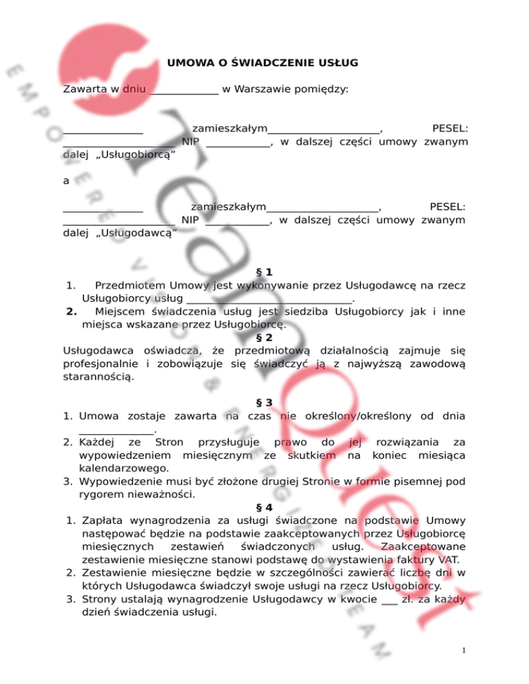 UMOWA O ŚWIADCZENIE USŁUG Zawarta w dniu _____________ w Warszawie pomiędzy: _______________ zamieszkałym_____________________, PESEL: _____________________ NIP ____________, w dalszej części umowy zwanym dalej „Usługobiorcą” a _______________ zamieszkałym_____________________, PESEL: _____________________ NIP ____________, w dalszej części umowy zwanym dalej „Usługodawcą” §1 1. Przedmiotem Umowy jest wykonywanie przez Usługodawcę na rzecz Usługobiorcy usług _______________________________. 2. Miejscem świadczenia usług jest siedziba Usługobiorcy jak i inne miejsca wskazane przez Usługobiorcę. §2 Usługodawca oświadcza, że przedmiotową działalnością zajmuje się profesjonalnie i zobowiązuje się świadczyć ją z najwyższą zawodową starannością. §3 1. Umowa zostaje zawarta na czas nie określony/określony od dnia ______________. 2. Każdej ze Stron przysługuje prawo do jej rozwiązania za wypowiedzeniem miesięcznym ze skutkiem na koniec miesiąca kalendarzowego. 3. Wypowiedzenie musi być złożone drugiej Stronie w formie pisemnej pod rygorem nieważności. §4 1. Zapłata wynagrodzenia za usługi świadczone na podstawie Umowy następować będzie na podstawie zaakceptowanych przez Usługobiorcę miesięcznych zestawień świadczonych usług. Zaakceptowane zestawienie miesięczne stanowi podstawę do wystawienia faktury VAT. 2. Zestawienie miesięczne będzie w szczególności zawierać liczbę dni w których Usługodawca świadczył swoje usługi na rzecz Usługobiorcy. 3. Strony ustalają wynagrodzenie Usługodawcy w kwocie ___ zł. za każdy dzień świadczenia usługi. 1 4. Usługobiorca zapłaci Usługodawcy wynagrodzenie wskazane w ust. 3 powyżej także w przypadku nie świadczenia usługi przez Usługodawcę do 15 dni w ciągu roku pod warunkiem uprzedniego (co najmniej __ dni) poinformowania Usługobiorcy o braku świadczenia usługi we wskazanych terminach. 5. Wynagrodzenie należne Usługodawcy z tytułu realizacji obowiązków wynikających z Umowy będzie uiszczone z dołu w terminie __ dni od dnia otrzymania prawidłowo wystawionej faktury VAT. 6. Usługodawca oświadcza, iż jest zarejestrowanym podatnikiem podatku VAT, posiada NIP numer . 7. Usługobiorca oświadcza, iż jest zarejestrowanym podatnikiem podatku VAT, posiada NIP numer . §5 1. W celu wykonania obowiązków wynikających z Umowy, Usługobiorca powierza Usługodawcy przetwarzanie danych osobowych znajdujących się w bazie danych osobowych Usługobiorcy. Strony zawrą w tym celu odrębną umowę. 2. W związku z zawarciem umowy Usługodawca zobowiązuje się do przestrzegania zasad przetwarzania danych osobowych zgodnie z ustawą o ochronie danych osobowych. 3. W przypadku gdy do naruszenia ochrony danych osobowych dojdzie z przyczyn leżących po stronie Usługodawcy, Usługodawca zapłaci Usługobiorcy karę umowną w wysokości _____ zł. za każdy przypadek naruszenia. 4. Dodatkowo Usługodawca zwróci Usługobiorcy koszty postępowań związanych z naruszeniem danych osobowych leżących po stronie Usługodawcy. Usługobiorca ma również prawo do dochodzenia odszkodowania na zasadach ogólnych przenoszącego wysokość kary umownej. 5. Obowiązek ochrony danych osobowych jest nieograniczony w czasie. §6 1. W celu wykonania obowiązków wynikających z Umowy, Usługobiorca powierza Usługodawcy informacje stanowiące tajemnicę przedsiębiorstwa w rozumieniu ustawy o zwalczaniu nieuczciwej konkurencji. 2. W związku z zawarciem umowy Usługodawca zobowiązuje się do ochrony tajemnicy przedsiębiorstwa Usługobiorcy. 3. W przypadku gdy do naruszenia tajemnicy przedsiębiorstwa Usługobiorcy dojdzie z przyczyn leżących po stronie Usługodawcy, Usługodawca zapłaci Usługobiorcy karę umowną w wysokości _____ zł. za każdy przypadek naruszenia. 2 4. Dodatkowo Usługodawca zwróci Usługobiorcy koszty postępowań związanych z naruszeniem tajemnicy przedsiębiorstwa leżących po stronie Usługodawcy. Usługobiorca ma również prawo do dochodzenia odszkodowania na zasadach ogólnych przenoszącego wysokość kary umownej. 5. Z zastrzeżeniem ust. 3, za tajemnice przedsiębiorstwa Strony uważać będą wszelkie informacje udostępnione przez Usługobiorcę, w zakresie wynikającym z Umowy, jak również informacje uzyskane przez Usługodawcę przy okazji i w związku z wykonywaniem Umowy. W szczególności za tajemnicę przedsiębiorstwa Strony uważać będą informacje techniczne, technologiczne, handlowe lub organizacyjne Usługobiorcy. 6. Strony uzgadniają, iż nie będą stanowić tajemnicy przedsiębiorstwa następujące informacje: 1) powszechnie znane lub publicznie dostępne, chyba że stały się powszechnie znane lub publicznie dostępne na skutek naruszenia przez Usługodawcę postanowień Umowy, 2) uzyskane przez Usługodawcę od osoby trzeciej, pod warunkiem, iż Usługodawca jest w stanie udowodnić powyższą okoliczność, 3) ujawnione przez Usługodawcę osobom trzecim po uzyskaniu pisemnej pod rygorem nieważności zgody Usługobiorcy. 7. Strony uzgadniają następujące zasady postępowania w odniesieniu do tajemnicy przedsiębiorstwa. W okresie obowiązywania Umowy, jak i po jej ustaniu niezależnie od przyczyny, Usługodawca zobowiązuje się nie ujawniać ani nie przekazywać tajemnicy przedsiębiorstwa, pośrednio ani bezpośrednio, osobom trzecim, nie kopiować, nie powielać ani w inny sposób nie reprodukować tajemnicy przedsiębiorstwa ani nie wykorzystywać ich dla celów innych, niż związane z wykonywaniem Umowy i w zakresie przewidzianym w Umowie. Jednakże Strony uprawnione są do przekazania tajemnicy przedsiębiorstwa na zgodne z prawem żądanie organów administracji państwowej lub sądów, w zakresie objętym tym żądaniem. 8. Zobowiązanie usługodawcy wynikające z niniejszego paragrafu będą wiążące przez okres Umowy oraz 5 lat po jej ustaniu. §7 1. Usługodawca zobowiązuje się nie prowadzić dzi