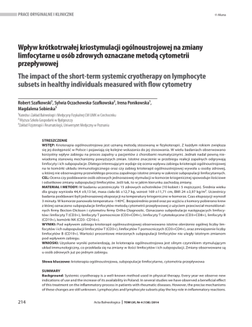 PRACE ORYGINALNE I KLINICZNE © Aluna Wpływ krótkotrwałej kriostymulacji ogólnoustrojowej na zmiany limfocytarne u osób zdrowych oznaczane metodą cytometrii przepływowej The impact of the short-term systemic cryotherapy on lymphocyte subsets in healthy individuals measured with flow cytometry Robert Szafkowski¹, Sylwia Oczachowska-Szafkowska², Irena Ponikowska¹, Magdalena Sobieska³ ¹Katedra i Zakład Balneologii i Medycyny Fizykalnej CM UMK w Ciechocinku ² Wyższa Szkoła Gospodarki w Bydgoszczy ³Zakład Fizjoterapii i Reumatologii, Uniwersytet Medyczny w Poznaniu STRESZCZENIE WSTĘP: Krioterapia ogólnoustrojowa jest uznaną metodą stosowaną w fizykoterapii. Z każdym rokiem zwiększa się jej dostępność w Polsce i pojawiają się kolejne wskazania do jej stosowania. W wielu badaniach obserwowano korzystny wpływ zabiegu na proces zapalny u pacjentów z chorobami reumatycznymi. Jednak nadal pewną niewiadomą stanowią mechanizmy powyższych zmian. Istotne znaczenie w przebiegu reakcji zapalnych odgrywają limfocyty i ich subpopulacje. Dlatego interesującym wydaje się ocena wpływu zabiegu krioterapii ogólnoustrojowej na te komórki układu immunologicznego oraz czy zabieg krioterapii ogólnoustrojowej wywoła u osoby zdrowej, u której nie obserwujemy przewlekłego procesu zapalnego istotne zmiany w zakresie subpopulacji limfocytarnych. CEL: Ocena czy poddawanie osób zdrowych jednorazowej stymulacji w komorze kriogenicznej spowoduje ilościowe i odsetkowe zmiany subpopulacji limfocytów. Jeśli tak, to w jakim kierunku zachodzą zmiany. MATERIAŁ I METODY: W badaniu uczestniczyło 15 zdrowych ochotników (10 kobiet i 5 mężczyzn). Średnia wieku dla grupy wyniosła 44,4 ±9,13 lat, masa ciała 66 ±12,7 kg, wzrost 169 ±11,71 cm, BMI 24 ±3,97 kg/m². Uczestnicy badania poddawani byli jednorazowej ekspozycji na temperatury kriogeniczne w komorze. Czas ekspozycji wynosił 3 minuty. W komorze panowała temperatura -140ºC. Bezpośrednio przed oraz po wyjściu z komory pobierano krew z której oznaczono subpopulacje limfocytów metodą cytometrii przepływowej z użyciem przeciwciał monoklonalnych firmy Becton-Dickson i cytometru firmy Ortho Diagnositc. Oznaczano subpobulacje następujacych limfocytów: limfocyty T (CD3+), limfocyty T pomocnicze (CD3+CD4+), limfocyty T cytotoksyczne (CD3+CD8+), limfocyty B (CD19+), komórki NK (CD3- CD16+). WYNIKI: Pod wpływem zabiegu krioterapii ogólnoustrojowej obserwowano istotne obniżenie ogólnej liczby limfocytów i ich subpopulacji limfocytów T (CD3+), limfocytów T pomocniczych (CD3+CD4+), oraz zmniejszenie liczby limfocytów B (CD19+). Wartości procentowe mierzonych subpopulacji limfocytów nie uległy istotnym zmianom pod wpływem zabiegu. WNIOSKI: Uzyskane wyniki potwierdzają, że krioterapia ogólnoustrojowa jest silnym czynnikiem stymulującym układ immunologiczny, co przekłada się na zmiany w ilości limfocytów i ich subpopulacji. Zmiany obserwowane są u osób zdrowych już po jednym zabiegu. Słowa kluczowe: krioterapia ogólnoustrojowa, subpopulacje limfocytarne, cytometria przepływowa SUMMARY Background: Systemic cryotherapy is a well-known method used in physical therapy. Every year we observe new indications of use and the increase of its availability in Poland. In several studies we have observed a beneficial effect of this treatment on the inflammatory process in patients with rheumatic diseases. However, the precise mechanisms of these changes are still unknown. Lymphocytes and lymphocyte subsets play the key role in inflammatory reactions. 214 Acta Balneologica TOM LVI, Nr 4 (138) /2014 Wpływ krótkotrwałej kriostymulacji ogólnoustrojowej na zmiany limfocytarne u osób zdrowych oznaczane metodą cytometrii przepływowej Therefore, it seems to be interesting to observe the impact of a systemic cryotherapy on the immune system cells. It seems to be interesting to assess whether systemic cryotherapy treatment will make any changes in lymphocyte subsets in healthy individuals without any active inflammatory process. AIM: The assessment of the impact of the systemic cryotherapy on lymphocyte subsets in healthy individuals and the direction of possible changes. MATERIAL AND METHODS: The study group consisted of 15 healthy volunteers (10 women and 5 men) with the average age of 44.4 ±9,13 years, the weight of 66 ± 12.7 kg, the height of 169 ± 11,71 cm, BMI 24 ± 3.97 kg/m². The participants were subjected to a single exposure to cryogenic temperatures in the chamber. The exposure time was 3 minutes and the temperature in the chamber -1400C. Blood tests were done immediately before going in and after leaving the chamber. Lymphocytes research was done using flow cytometry with monoclonal antibodies from Becton-Dickenson and a flow cytometer from Ortho Diagnostic company. The following subsets were examined: lymphocytes T cells (CD3+), lymphocytes T helper (CD3+ CD4+), lymphocytes T cytotoxic (CD8+ CD3+), lymphocytes B cells (CD19+), natural killer cells (CD3-CD16+). RESULTS: Under the influence of systemic cryotherapy treatment, significant reductions in the total number of lymphocytes and their subpopulations were observed: lymphocytes T cells (CD3+), lymphocytes T helper (CD3+ CD4+), lymphocytes T cytotoxic (CD8+ CD3+), as well as a decrease of lymphocytes B cells (CD19+). There were no relevant changes in the percentage value. CONCLUSIONS: Based on the obtained results, it might be concluded that the systemic cryotherapy is a strong factor stimulating immune system, which causes significant changes in the lymphocyte subsets of peripheral blood. These changes were observed in healthy individuals after one treatment in cryogenic chamber. Key words: whole body cryotherapy, lymphocyte subsets, flow cytometry Acta Balneol., TOM LVI, Nr 4 (138)/2014, s. 214-219 WSTĘP Krioterapia ogólnoustrojowa jest uznaną metodą stosowaną w fizykoterapii. Metodę tę jako pierwszy do praktyki lekarskiej wprowadz