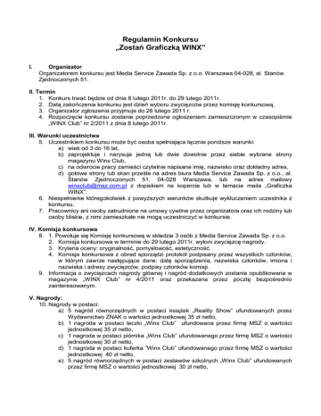 Regulamin Konkursu „Zostań Graficzką WINX” I. Organizator Organizatorem konkursu jest Media Service Zawada Sp. z o.o. Warszawa 04-028, al. Stanów Zjednoczonych 51. II. Termin 1. Konkurs trwać będzie od dnia 8 lutego 2011r. do 29 lutego 2011r. 2. Datą zakończenia konkursu jest dzień wyboru zwycięzców przez komisję konkursową. 3. Organizator zgłoszenia przyjmuje do 26 lutego 2011 r. 4. Rozpoczęcie konkursu zostanie poprzedzone ogłoszeniem zamieszczonym w czasopiśmie „WINX Club” nr 2/2011 z dnia 8 lutego 2011r. III. Warunki uczestnictwa 5. Uczestnikiem konkursu może być osoba spełniająca łącznie poniższe warunki: a) wiek od 3 do 16 lat, b) zaprojektuje i narysuje jedną lub dwie dowolnie przez siebie wybrane strony magazynu Winx Club, c) na odwrocie pracy zamieści czytelnie napisane imię, nazwisko oraz dokładny adres, d) gotowe strony lub skan prześle na adres biura Media Service Zawada Sp. z o.o., al. Stanów Zjednoczonych 51, 04-028 Warszawa, lub na adres mailowy [email protected] z dopiskiem na kopercie lub w temacie maila „Graficzka WINX”. 6. Niespełnienie któregokolwiek z powyższych warunków skutkuje wykluczeniem uczestnika z konkursu. 7. Pracownicy ani osoby zatrudnione na umowy cywilne przez organizatora oraz ich rodziny lub osoby bliskie, z nimi zamieszkałe nie mogą uczestniczyć w konkursie. IV. Komisja konkursowa 8. 1. Powołuje się Komisję konkursową w składzie 3 osób z Media Service Zawada Sp. z o.o. 2. Komisja konkursowa w terminie do 29 lutego 2011r. wyłoni zwycięzcę nagrody. 3. Kryteria oceny: oryginalność, pomysłowość, estetyczność. 4. Komisja konkursowa z obrad sporządzi protokół podpisany przez wszystkich członków, w którym zawrze następujące dane: datę sporządzenia, nazwiska członków, imiona i nazwiska i adresy zwycięzców, podpisy członków komisji. 9. Informacja o zwycięzcach nagrody głównej i nagród dodatkowych zostanie opublikowana w magazynie „WINX Club” nr 4/2011 oraz przekazana przez pocztę bezpośrednio zainteresowanym. V. Nagrody: 10. Nagrody w postaci: a) 5 nagród równorzędnych w postaci książek „Reality Show” ufundowanych przez Wydawnictwo ZNAK o wartości jednostkowej 35 zł netto, b) 1 nagroda w postaci teczki „Winx Club” ufundowana przez firmę MSZ o wartości jednostkowej 35 zł netto, c) 1 nagroda w postaci piórnika „Winx Club” ufundowanego przez firmę MSZ o wartości jednostkowej 30 zł netto, d) 1 nagroda w postaci kuferka ”Winx Club” ufundowanego przez firmę MSZ o wartości jednostkowej 40 zł netto, e) 5 nagród równorzędnych w postaci zestawów szkolnych „Winx Club” ufundowanych przez firmę MSZ o wartości jednostkowej 30 zł netto, f) 4 nagrody równorzędne w postaci breloków z aplikatorem perfum ufundowanych przez firmę Sephora o wartości jednostkowej 30 zł netto, g) 5 nagród równorzędnych w postaci zestawów ciasteczek z czarodziejską puszką ufundowanych przez firmę Artur o wartości jednostkowej 20 zł netto. 11. Nagroda nie może zostać zamieniona na nagrodę pieniężną lub inną rzeczową. 12. Jeden uczestnik może zostać laureatem jednej nagrody. 13. Odbiór nagrody: nagroda zostanie przesłana pocztą – listem poleconym w terminie 6 tygodni od momentu wyłonienia zwycięzców przez Komisję Konkursową.