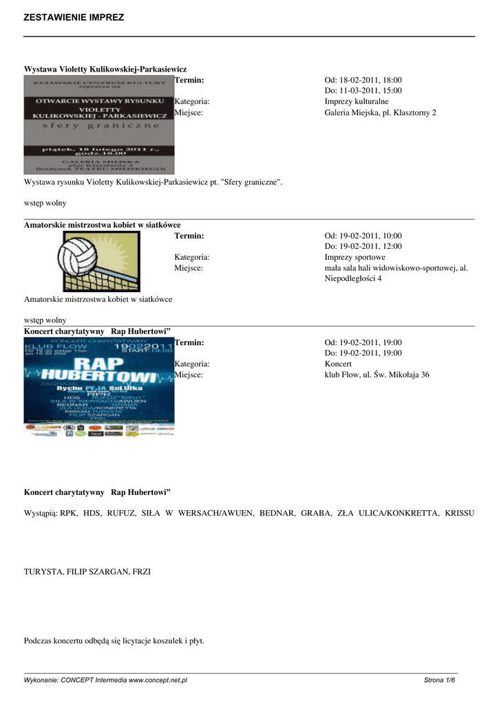 ZESTAWIENIE IMPREZ Wystawa Violetty Kulikowskiej-Parkasiewicz Termin: Kategoria: Miejsce: Od: 18-02-2011, 18:00 Do: 11-03-2011, 15:00 Imprezy kulturalne Galeria Miejska, pl. Klasztorny 2 Wystawa rysunku Violetty Kulikowskiej-Parkasiewicz pt. "Sfery graniczne". wstęp wolny Amatorskie mistrzostwa kobiet w siatkówce Termin: Kategoria: Miejsce: Od: 19-02-2011, 10:00 Do: 19-02-2011, 12:00 Imprezy sportowe mała sala hali widowiskowo-sportowej, al. Niepodległości 4 Amatorskie mistrzostwa kobiet w siatkówce wstęp wolny Koncert charytatywny „Rap Hubertowi” Termin: Kategoria: Miejsce: Od: 19-02-2011, 19:00 Do: 19-02-2011, 19:00 Koncert klub Flow, ul. Św. Mikołaja 36 Koncert charytatywny „Rap Hubertowi” Wystąpią: RPK, HDS, RUFUZ, SIŁA W WERSACH/AWUEN, BEDNAR, GRABA, ZŁA ULICA/KONKRETTA, KRISSU TURYSTA, FILIP SZARGAN, FRZI Podczas koncertu odbędą się licytacje koszulek i płyt. Wykonanie: CONCEPT Intermedia www.concept.net.pl Strona 1/6 ZESTAWIENIE IMPREZ wstęp płatny, dochód z koncertu będzie przeznaczony na leczenie chorego na nowotwór mózgu Huberta Koncert zespołów Strefa Hałas i Wiśnia 3 PE Termin: Kategoria: Miejsce: Od: 19-02-2011, 21:00 Do: 19-02-2011, 23:00 Koncert klub "Harlem", ul. Toruńska 60 Koncert lokalnych zespołów hip-hopowych - Strefa Hałas i Wiśnia 3 PE - w klubie "Harlem" w sobotę, 19 lutego br. o godz. 21.00. wstęp płatny - 5 zł mecz koszykówki - III liga Termin: Kategoria: Miejsce: Od: 20-02-2011, 12:00 Do: 20-02-2011, 14:00 Imprezy sportowe hala widowiskowo-sportowa, al. Niepodległości 4 mecz koszykówki mężczyzn - III liga, Domino Inowrocław - AZT UMK Toruń wstęp wolny IV Inowrocławska Gala Ślubna Termin: Kategoria: Miejsce: Od: 20-02-2011, 11:00 Do: 20-02-2011, 17:00 Festyny, imprezy promocyjne hala widowiskowo-sportowa, al. Niepodległości 4 Inowrocławska Gala Ślubna – targi dla przyszłych nowożeńców Podczas targów zaprezentują się firmy z branży ślubnej: damska i męska moda ślubna, dekoracje ślubne, auta ślubne, salony fryzjerskie i kosmetyczne, usługi fotograficzne, kamerzyści, zespoły muzyczne i inni. Dzień Kota Termin: Od: 20-02-2011, 10:00 Do: 20-02-2011, 16:00 Wykonanie: CONCEPT Intermedia www.concept.net.pl Strona 2/6 ZESTAWIENIE IMPREZ Kategoria: Miejsce: Inne Młodzieżowy Dom Kultury, ul. NMP 14-16 Fundacja Kocia Dolina, Cat Club Animals z Bydgoszczy i Młodzieżowy Dom Kultury im. J. Korczaka w Inowrocławiu zapraszają na obchody Dnia Kota w Inowrocławiu. Jest to impreza charytatywna, której celem jest zwrócenie uwagi na problem bezdomności zwierząt oraz propagowanie adopcji bezdomnych kotów. W programie: pokaz rasowych kotów, stoiska z akcesoriami dla kotów, występ grupy „Freedom Breakers”. wstęp płatny – 3 zł Turniej charytatywny Termin: Kategoria: Miejsce: Od: 20-02-2011, 9:00 Do: 20-02-2011, 12:00 Akcje społeczne Powiatowa Hala Sportowa "Kujawianka", ul. Konopnickiej Charytatywny turniej koszykówki na rzecz chorego na nowotwór Huberta. W imprezie wezmą udział 4 drużyny - ISSK, Inenergia, ZESTAWIENIE IMPREZ Kibice Noteci i "Wodociągi". Turniej organizują Inowrocławskie Stowarzyszenie Sympatyków Koszykówki, Młodzieżowa Rada Miasta Inowrocławia, Sinners Tattoo, Fundacja Feniks Anny Borowiak, Starostwo Powiatowe i MPK Inowrocław. Spotkania z filmem Termin: Kategoria: Miejsce: Od: 21-02-2011, 18:00 Do: 21-02-2011, 20:00 Imprezy kulturalne Czytelnia Biblioteki Miejskiej, ul. Kilińskiego 16 ZESTAWIENIE IMPREZ Spotkania prowadzone przez Łukasza Oliwkowskiego. Prezentowane podczas spotkań dzieła klasyki kina i najnowsze dzieła filmowe (zwłaszcza ekranizacje utworów literackich) są punktem wyjścia do rozmowy na temat kultury współczesnej. Tym razem tematem spotkania będzie film Wojciecha Smarzowskiego pt. "Dom zły". wstęp wolny Koncert w ramach IX Festiwalu Laureatów Konkursów Muzycznych Termin: Kategoria: Miejsce: Od: 21-02-2011, 18:00 Do: 21-02-2011, 20:00 Koncert Sala Koncertowa im. Ireny Dubiskiej, ul. Kilińskiego 16 Koncert w ramach IX Festiwalu Laureatów Konkursów Muzycznych, który promuje wybitnie utalentowanych adeptów sztuki muzycznej. Wyst?pi?: - Maciej Zakrzewski – organy, Wykonanie: CONCEPT Intermedia www.concept.net.pl Strona 5/6 ZESTAWIENIE IMPREZ - Micha? Szymanowski – fortepian, - Inowroc?awska Orkiestra Symfoniczna „Pro Arte” - Zygmunt Rychert – dyrygent wst?p wolny, wej?ciówki do odbioru w KCK, szkole muzycznej i Inowroc?awskiej Lokalnej Organizacji Turystycznej Wykonanie: CONCEPT Intermedia www.concept.net.pl Strona 6/6