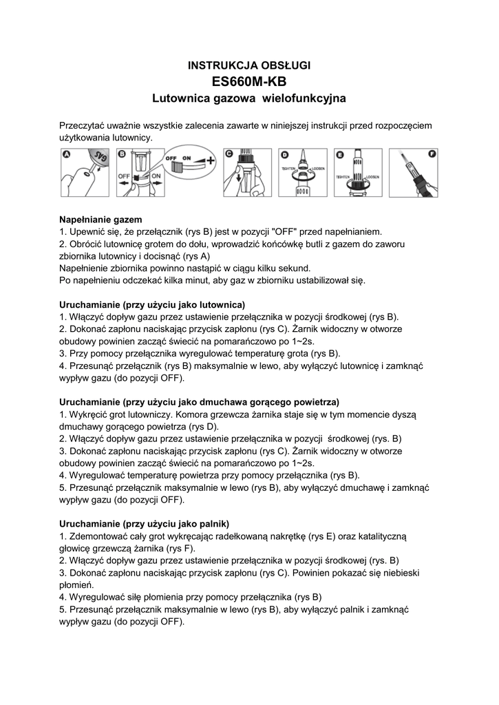 INSTRUKCJA OBSŁUGI ES660M-KB Lutownica gazowa wielofunkcyjna Przeczytać uważnie wszystkie zalecenia zawarte w niniejszej instrukcji przed rozpoczęciem użytkowania lutownicy. Napełnianie gazem 1. Upewnić się, że przełącznik (rys B) jest w pozycji "OFF" przed napełnianiem. 2. Obrócić lutownicę grotem do dołu, wprowadzić końcówkę butli z gazem do zaworu zbiornika lutownicy i docisnąć (rys A) Napełnienie zbiornika powinno nastąpić w ciągu kilku sekund. Po napełnieniu odczekać kilka minut, aby gaz w zbiorniku ustabilizował się. Uruchamianie (przy użyciu jako lutownica) 1. Włączyć dopływ gazu przez ustawienie przełącznika w pozycji środkowej (rys B). 2. Dokonać zapłonu naciskając przycisk zapłonu (rys C). Żarnik widoczny w otworze obudowy powinien zacząć świecić na pomarańczowo po 1~2s. 3. Przy pomocy przełącznika wyregulować temperaturę grota (rys B). 4. Przesunąć przełącznik (rys B) maksymalnie w lewo, aby wyłączyć lutownicę i zamknąć wypływ gazu (do pozycji OFF). Uruchamianie (przy użyciu jako dmuchawa gorącego powietrza) 1. Wykręcić grot lutowniczy. Komora grzewcza żarnika staje się w tym momencie dyszą dmuchawy gorącego powietrza (rys D). 2. Włączyć dopływ gazu przez ustawienie przełącznika w pozycji środkowej (rys. B) 3. Dokonać zapłonu naciskając przycisk zapłonu (rys C). Żarnik widoczny w otworze obudowy powinien zacząć świecić na pomarańczowo po 1~2s. 4. Wyregulować temperaturę powietrza przy pomocy przełącznika (rys B). 5. Przesunąć przełącznik maksymalnie w lewo (rys B), aby wyłączyć dmuchawę i zamknąć wypływ gazu (do pozycji OFF). Uruchamianie (przy użyciu jako palnik) 1. Zdemontować cały grot wykręcając radełkowaną nakrętkę (rys E) oraz katalityczną głowicę grzewczą żarnika (rys F). 2. Włączyć dopływ gazu przez ustawienie przełącznika w pozycji środkowej (rys. B) 3. Dokonać zapłonu naciskając przycisk zapłonu (rys C). Powinien pokazać się niebieski płomień. 4. Wyregulować siłę płomienia przy pomocy przełącznika (rys B) 5. Przesunąć przełącznik maksymalnie w lewo (rys B), aby wyłączyć palnik i zamknąć wypływ gazu (do pozycji OFF). Budowa grota Groty lutownicze są formowane z miedzianej szyny, a następnie pokrywane powłoką ochronną z żelaza. Mimo, że w celu osiągniecia lepszej trwałości powłoka jest gruba, wykazuje ona dobrą przewodność cieplną pomagającą w szybszym powrocie do zadanej temperatury. 1. Bezprzewodowa, zasilana butanem lutownica ES660M-KB 3w1 (z grotem stożkowatym 1,6mm). 2. Mini klucz 3. Grot dłuto 2,4mm (5 warstw profesjonalnej powłoki) 4. Grot gorący nóż 5. Grot rozpraszający 6. Pojemnik z lutowiem 7. Gąbka do czyszczenia grotów 8. Pokrywa lutownicy OSTRZEŻENIA W trakcie prac lutowniczych i podobnych emitowane są substancje chemiczne, które w kontakcie z ludźmi mogą powodować wzrost zagrożenia chorobami nowotworowymi lub uszkodzeniami płodu oraz mieć ujemny wpływ na organy płciowe. 2 OSTRZEŻENIA Zgodnie z międzynarodowymi uregulowaniami zabronione jest przewożenie butanu i innych palnych gazów w transporcie lotniczym osobowym. Dotyczy to zarówno bagażu podręcznego i rejestrowanego. Użytkować i przechowywać z dala od dzieci. Upewnić się, że płomień został całkowicie wygaszony po zakończeniu pracy. Nie wystawiać na temperatury powyżej 49˚C lub przedłużone działanie promieni słonecznych. Używać z dala od twarzy i ubrań. SPECYFIKACJA Masa: 162g (przy pustym zbiorniku na gaz) Zasilanie: butan (gaz do zapalniczek) Pojemność zbiornika na gaz: 15ml Czas pracy: 45~60min Wymiary: Ø25, 250mm (dł) Przybliżone temperatury: 200~400˚C (lutownica) do 450˚C (dmuchawa gorącego powietrza) do 1300˚C (palnik) 3 UTYLIZACJA Urządzenie podlega dyrektywie WEEE 2002/96/EC. Symbol jak obok (umieszczony na obudowie przyrządu) oznacza, że produkt musi być utylizowany oddzielnie i powinien być dostarczany do odpowiedniego punktu zbierającego odpady. Nie należy go wyrzucać razem z odpadami gospodarstwa domowego. Aby uzyskać więcej informacji, należy skontaktować się z punktem sprzedaży detalicznej tego wyrobu, lokalnymi władzami odpowiedzialnymi za zarządzanie odpadami lub przedstawicielem przedsiębiorstwa. MM:2015-10-14 ES660M-KB nr kat. 202512 Lutownica gazowa zestaw Wyprodukowano na Tajwanie Importer: BIALL Sp. z o.o. Ul. Barniewicka 54C 80-299 Gdańsk www.biall.com.pl 4