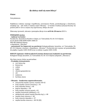 By dalecy stali się nam bliscy! Plakat Pod plakatem: Najbliższa rodzina naszego współbrata, nowicjusza Pawła, pochodzącego z Charkowa, znajduje się – jak wielu w tamtej części Ukrainy – w bardzo trudnej sytuacji.Chcemy im pomóc.Jeśli w sercu czujesz się zaproszony, dołącz do nas! Zbieramy żywność, ubrania i pieniądze.Akcja trwa od 8 do 28 marca 2015 r. PIENIĄDZE można wpłacać na konto: Parafia Św. Stanisława Kostki w Gdyni, ul. Tatrzańska 35, 81‐313 Gdynia 6110 2018 5300 0090 0200 1068 23 PKO BP Oddział Gdynia z dopiskiem: „Ukraina” pozostawić (w kopercie) na portierni KolegiumKsięży Jezuitów, ul. Tatrzańska 35, 81‐313 Gdynia, również z dopiskiem: „Ukraina”. Portiernia jest czynna od poniedziałku do piątku w godz. 8.00‐18.00 oraz w soboty w godz. 8.00‐14.00. RZECZY (opisane i dobrej jakości!) można dostarczać/nadsyłać na portiernię Kolegium Księży Jezuitów, ul. Tatrzańska 35, 81‐313 Gdynia (dopisek: „Ukraina”) Oto lista rzeczy, które są potrzebne: Produkty żywnościowe: • ryż, kasza itp. • konserwy • cukier • mąka • chemia gospodarcza • sól • makaron • herbata, kawa Ubrania – konkretne zapotrzebowanie: • marynarka męska czarna, rozmiar 40‐42 • buty męskie czarne (wiosna), r. 41 • buty damskie letnie, r. 40 • kapcie damskie, r. 38 • buty męskie wiosna‐jesień, r.41 • męskie tenisówki (adidasy), r.41 • jakakolwiek odzież męska (kurtka itp.), r. 48 • męskie buty zimowe, r. 40 • buty zimowe damskie, r. 37 • męska kurtka zimowa, r. 48‐50 (M) • • • • • • • • • • • • • • • • • • • • • buty męskie (wiosna‐jesień), r. 40 sandały letnie dla kobiet, r. 37 zimowe buty dla chłopców, r. 25 letnie buty dla chłopców, r. 24 buty dla dziewczyny (letnie) r. 34‐35; buty dla dziewczyny (wiosna‐jesień), r. 34‐35; jakakolwiek odzież ‐ dziewczyna 9 lat, wzrost 140 cm buty damskie (wiosna‐jesień), r. 37 kurtka dla chłopca (wiosna‐jesień), wzrost 110 cm jakakolwiek odzież dla chłopca 3 lata, wzrost 130 cm jakiekolwiek obuwie dla chłopca 3 lata, wzrost 130 cm jakakolwiek odzież dla chłopca 2 lata, wzrost 100 cm jakiekolwiek obuwie dla chłopca 2 lata, wzrost 100 cm zimowy sweter damski, r. 48 dżinsy męskie, r. 48‐49 trampki (adidasy) męskie, r. 43‐44 męskie buty (wiosna‐jesień), r. 44 damskie buty (wiosna‐jesień), r. 41 damskie obuwie (wiosna‐lato), r. 38, jeśli możliwe szerokie i miękkie (dla starszej pani) dla chłopca: jakakolwiek odzież, wzrost 120 cm, jakiekolwiek obuwie, r. 26 dla dziewczyny: jakakolwiek odzież, wzrost 135‐140 cm, jakiekolwiek obuwie, r. 34 Za wszelką pomoc i wsparcie serdecznie dziękujemy!