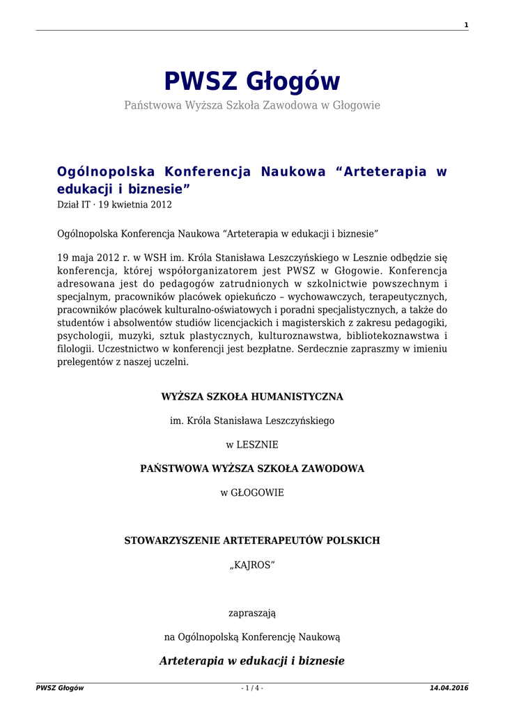 1 PWSZ Głogów Państwowa Wyższa Szkoła Zawodowa w Głogowie Ogólnopolska Konferencja Naukowa “Arteterapia w edukacji i biznesie” Dział IT · 19 kwietnia 2012 Ogólnopolska Konferencja Naukowa “Arteterapia w edukacji i biznesie” 19 maja 2012 r. w WSH im. Króla Stanisława Leszczyńskiego w Lesznie odbędzie się konferencja, której współorganizatorem jest PWSZ w Głogowie. Konferencja adresowana jest do pedagogów zatrudnionych w szkolnictwie powszechnym i specjalnym, pracowników placówek opiekuńczo – wychowawczych, terapeutycznych, pracowników placówek kulturalno-oświatowych i poradni specjalistycznych, a także do studentów i absolwentów studiów licencjackich i magisterskich z zakresu pedagogiki, psychologii, muzyki, sztuk plastycznych, kulturoznawstwa, bibliotekoznawstwa i filologii. Uczestnictwo w konferencji jest bezpłatne. Serdecznie zapraszmy w imieniu prelegentów z naszej uczelni. WYŻSZA SZKOŁA HUMANISTYCZNA im. Króla Stanisława Leszczyńskiego w LESZNIE PAŃSTWOWA WYŻSZA SZKOŁA ZAWODOWA w GŁOGOWIE STOWARZYSZENIE ARTETERAPEUTÓW POLSKICH „KAJROS” zapraszają na Ogólnopolską Konferencję Naukową Arteterapia w edukacji i biznesie PWSZ Głogów -1/4- 14.04.2016 2 organizowaną 19 maja 2012 r. w Wyższej Szkole Humanistycznej im. Króla Stanisława Leszczyńskiego w Lesznie Oferta placówek edukacyjnych, w tym placówek specjalnych czy opiekuńczowychowawczych powinna zawierać winny być propozycje działań służących wykorzystywaniu spontanicznej ekspresji czy twórczego potencjału dla poprawy jakości życia. W ofercie takiej niewątpliwie powinna znaleźć się arteterapia wykorzystująca proces tworzenia w szeroko pojętej edukacji, także edukacji człowieka dorosłego. Celem organizatorów konferencji jest stworzenie płaszczyzny do wymiany doświadczeń i refleksji dotyczących upowszechniania działań terapeutycznoartystycznych rozwijających twórcze możliwości człowieka. Konferencja adresowana jest do pedagogów zatrudnionych w szkolnictwie powszechnym i specjalnym, pracowników placówek opiekuńczo – wychowawczych, terapeutycznych, pracowników placówek kulturalno-oświatowych i poradni specjalistycznych, a także do studentów i absolwentów studiów licencjackich i magisterskich z zakresu pedagogiki, psychologii, muzyki, sztuk plastycznych, kulturoznawstwa, bibliotekoznawstwa i filologii. Prelegentami podczas Konferencji ARTETERAPIA W EDUKACJI I BIZNESIE są specjaliści, praktycy i teoretycy tej dyscypliny. Komitet Naukowy Prof. zw. dr hab. Aleksander Zandecki (WSH Leszno, WSE UAM Poznań) Prof. PWSZ dr hab. Stanisław Czaja (PWSZ Głogów) Prof. PWSZ dr hab. Wita Szulc (Prezes Stowarzyszenia Arteterapeutów Polskich „Kajros”; PWSZ Legnica) Prof. UAM dr hab. Andrzej Twardowski (WSE UAM Poznań) Prof. WSH dr hab. Marian Marcinkowski (WSH Leszno) Doc. dr Anna Bartkowiak (WSH Leszno) Dr Beata Skwarek ( PWSZ Głogów) Dr Anita Stefańska (WPA UAM Kalisz, PWSZ Głogów) Komitet Organizacyjny PWSZ Głogów -2/4- 14.04.2016 3 Doc. dr Anna Bartkowiak Dr Beata Skwarek Dr Anita Stefańska Mgr Violetta Marcinkowska PROGRAM KONFERENCJI: 9.00 Otwarcie konferencji – prof. zw. dr hab. Aleksander Zandecki, prof. dr hab. Stanisław Czaja 9.15-9.45 Wykład inauguracyjny: ARTETERAPIA DLA WSZYSTKICH, CZYLI DLA KOGO? – prof. dr hab. Wita Szulc (PWSZ w Legnicy) 9.45-10.10 KREATYWNA AKTYWNOŚĆ SŁOWNA JAKO SPOSÓB ZASPAKAJANIA POTRZEB EMOCJONALNYCH CZŁOWIEKA DOROSŁEGO I INSPIRACJA DO SAMOROZWOJU – mgr Katarzyna Szeliga (Zarząd „KAJROS”, autorka książek edukacyjnych i terapeutycznych dla dzieci z zakresu bajkoterapii, Bydgoszcz) 10.10-10.35 ARTETERAPIA – NARZĘDZIE KOMUNIKOWANIA BIZNESU – mgr Agnieszka Nadstawna (Partner Zarządzający w firmie Latawiec Partner Event & Training, event manager i trener rozwoju osobistego – arteterapeuta, Warszawa) 10.35-11.00 ARTETERAPIA I ARTYSTYCZNE DZIAŁANIA INTERDYSCYPLINARNE W PLACÓWCE LECZNICZEJ – mgr Ireneusz Lesicki, mg Dorota Lesicka, mgr Ewa Lisowska, mgr Małgorzata Głowacka (Szpital Rehabilitacyjny dla dzieci w Poznaniu Kiekrzu – arteterapeuci, pedagodzy) 11.00-11.25 WARSZTAT ARTYSTYCZNY W PRAKTYCE PEDAGOGA ARTETERAPEUTY – dr Adam Olejniczak (PWSZ Głogów) 11.25-12.00 – przerwa 12.00-12.25 Prezentacja warsztatu: ARTETERAPIA DLA BIZNESU – mgr Agnieszka Nadstawna 12.25-12.50 PWSZ Głogów DOSKONALENIE UMIEJĘTNOŚCI -3/4- WYCHOWAWCZYCH 14.04.2016 4 PEGAGOGA – PROGRAMY ARTETERAPEUTYCZNE DLA PLACÓWEK OPIEKUŃCZO- WYCHOWAWCZYCH – dr Beata Skwarek, mgr Renata Milczanowska (PWSZ Głogów) 12.50-13.15 ARTETERAPIA W BADANIACH JAKOŚCIOWYCH PEDAGOGA – mgr Ewa Johnnson (WPA w Kaliszu UAM) 13.15-13.40 ARTETERAPIA W EDUKACJI PRZEDSZKOLNEJ – mgr Violetta Marcinkowska (Niepubliczny Punkt Przedszkolny w Głogowie, Niepubliczna Poradnia Psychologiczno-Pedagogiczna w Głogowie) 13.40-14.05 ARTETERAPIA W PRZESTRZENI EDUKACYJNEJ PEDAGOGIKI SPECJALNEJ – dr Anita Stefańska (WPA UAM w Kaliszu, PWSZ Głogów), dr Marta Holeksa (WSHiD w Poznaniu) 14.05 –14.30 Dyskusja i podsumowanie obrad Uczestnictwo w konferencji jest bezpłatne. Osoby zainteresowane potwierdzeniem udziału w konferencji mogą otrzymać stosowne zaświadczenia (certyfikaty), za które opłata (pobierana na miejscu) wynosi dla studentów: 10 złotych, dla pozostałych osób: 30 złotych. Szczegółowy program do pobrania tu Kontakt dr Anita Stefańska e-mail: [email protected] tel. 693650188 www.wsh-leszno.pl/arte Ten wpis został utworzony 19 kwietnia 2012 o godz. 14:44 w kategorii Aktualności. PWSZ Głogów -4/4- 14.04.2016